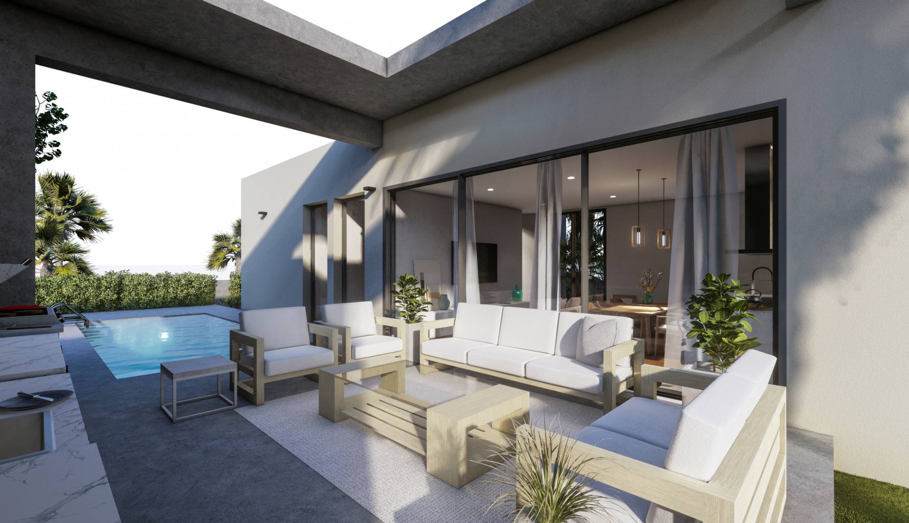 Die Außenbereiche dieser unabhängigen Häuser in Murcia sind so gestaltet, dass sie das mediterrane Klima optimal nutzen. Jede Immobilie verfügt über einen privaten Garten, ideal für Outdoor-Aktivitäten und Entspannungsmomente. Das Vorhandensein eines privaten Pools in jedem Haus verleiht einen Hauch von Luxus und Exklusivität, sodass die Bewohner ein erfrischendes Bad im Komfort ihres Zuhauses genießen können. Darüber hinaus bieten die privaten Terrassen zusätzlichen Raum für Freizeitaktivitäten, sei es für ein Abendessen im Freien oder einfach zum Entspannen beim Blick auf die Umgebung. Die Kombination dieser Außenelemente sorgt für einen unvergleichlichen Outdoor-Lifestyle.