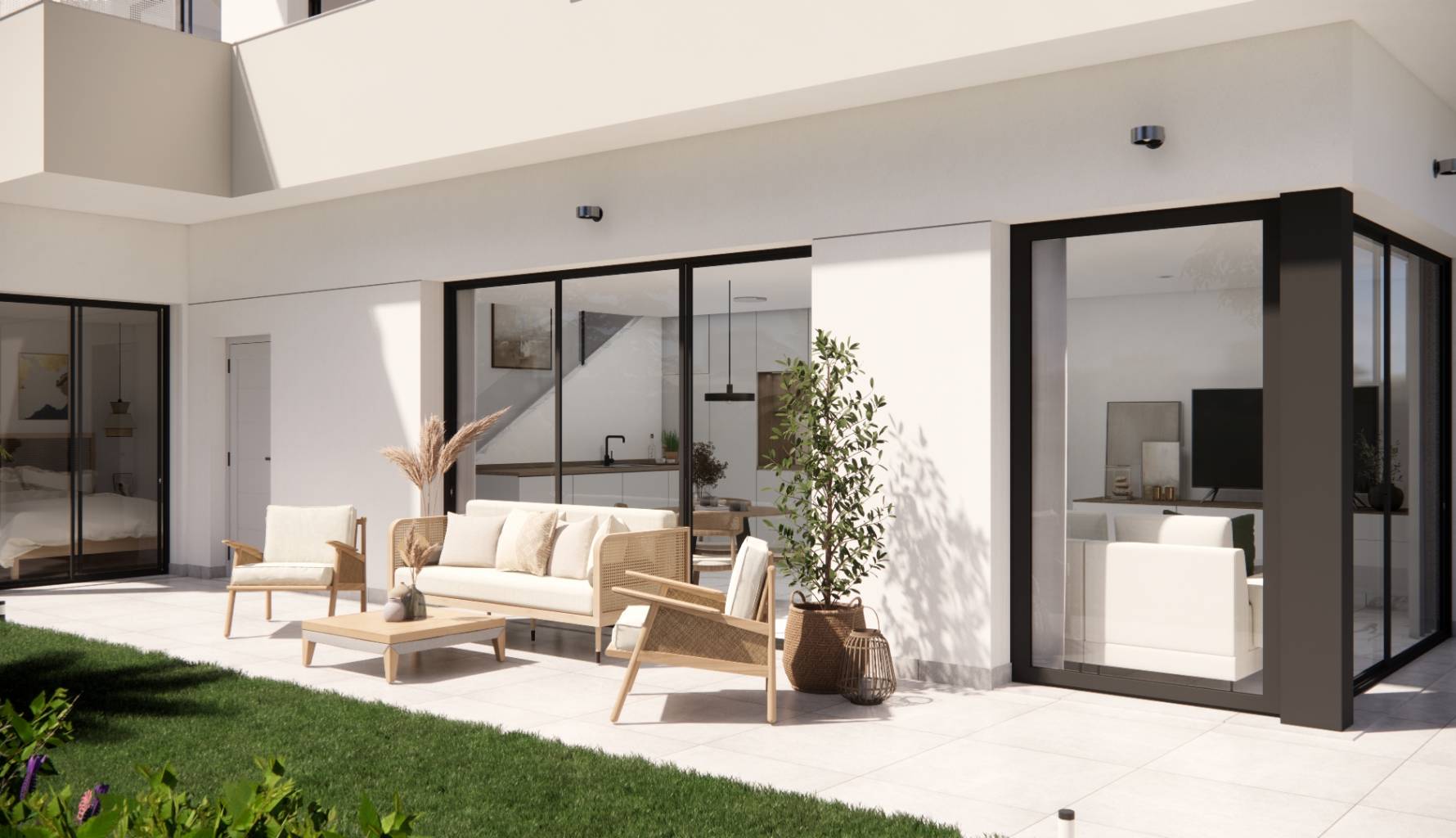 Das Innere dieser freistehenden Häuser ist mit einem Fokus auf Komfort und Modernität gestaltet. Die Keramikböden verleihen einen eleganten Touch und sind pflegeleicht. Die Häuser sind mit elektrischen Rollläden ausgestattet, die zusätzlichen Komfort und Sicherheit bieten. Die Vorinstallation der Klimaanlage sorgt dafür, dass die Bewohner in den wärmeren Monaten ein kühles Ambiente genießen können. Die Küchen sind komplett mit modernen Geräten ausgestattet, was den Alltag erleichtert. Einbauschränke in den Schlafzimmern bieten reichlich Stauraum und sorgen für Ordnung und Organisation. Die Häuser bieten Konfigurationen mit 3 Schlafzimmern und die Option von 2 oder 3 Bädern, um den Bedürfnissen verschiedener Familien gerecht zu werden. Darüber hinaus bietet die Option eines Solariums zusätzlichen Raum für Entspannung und Genuss.