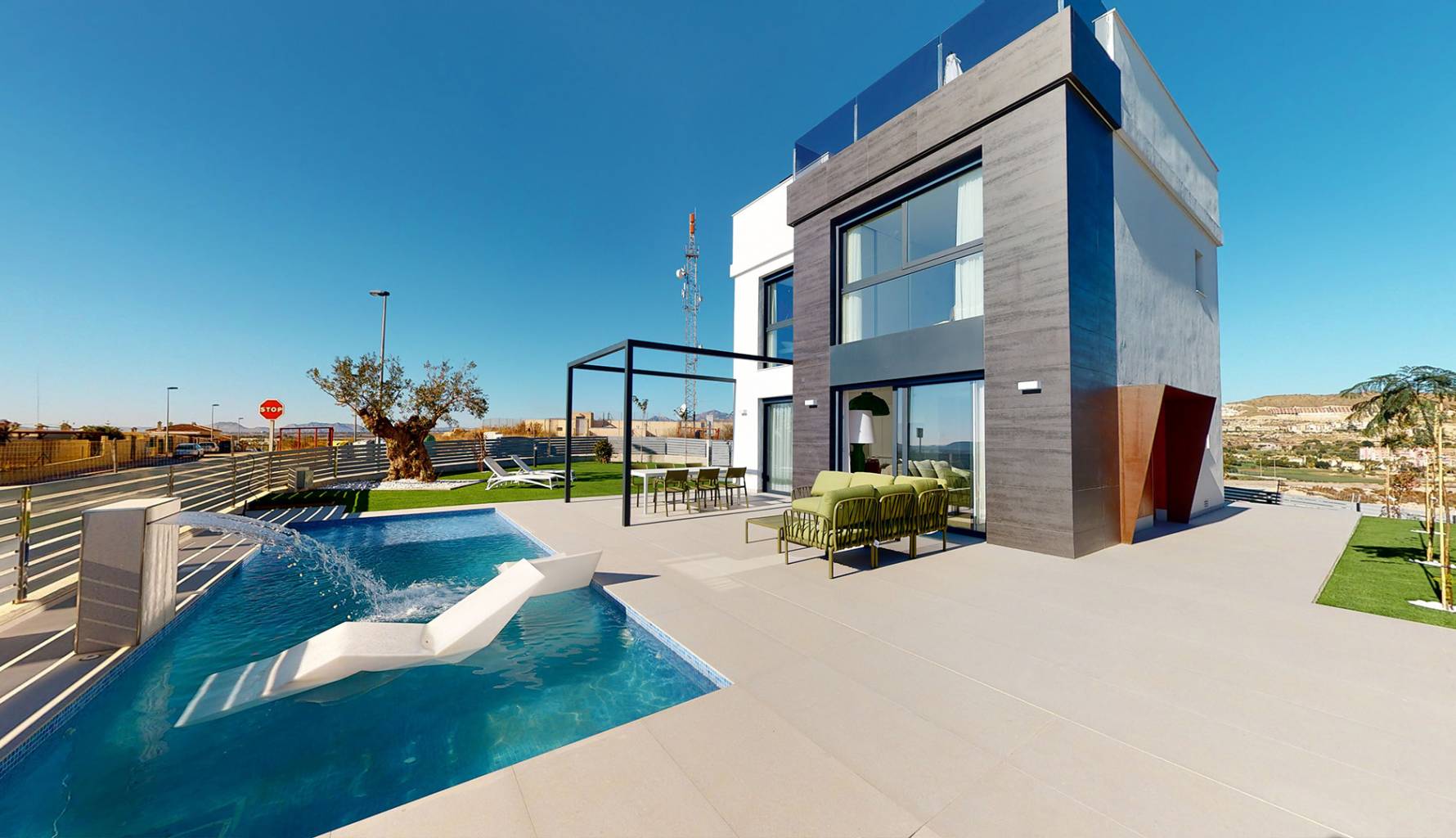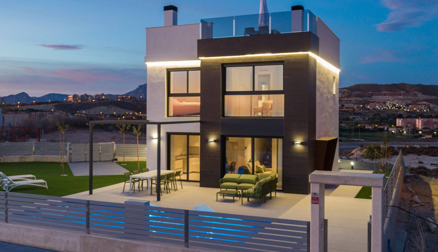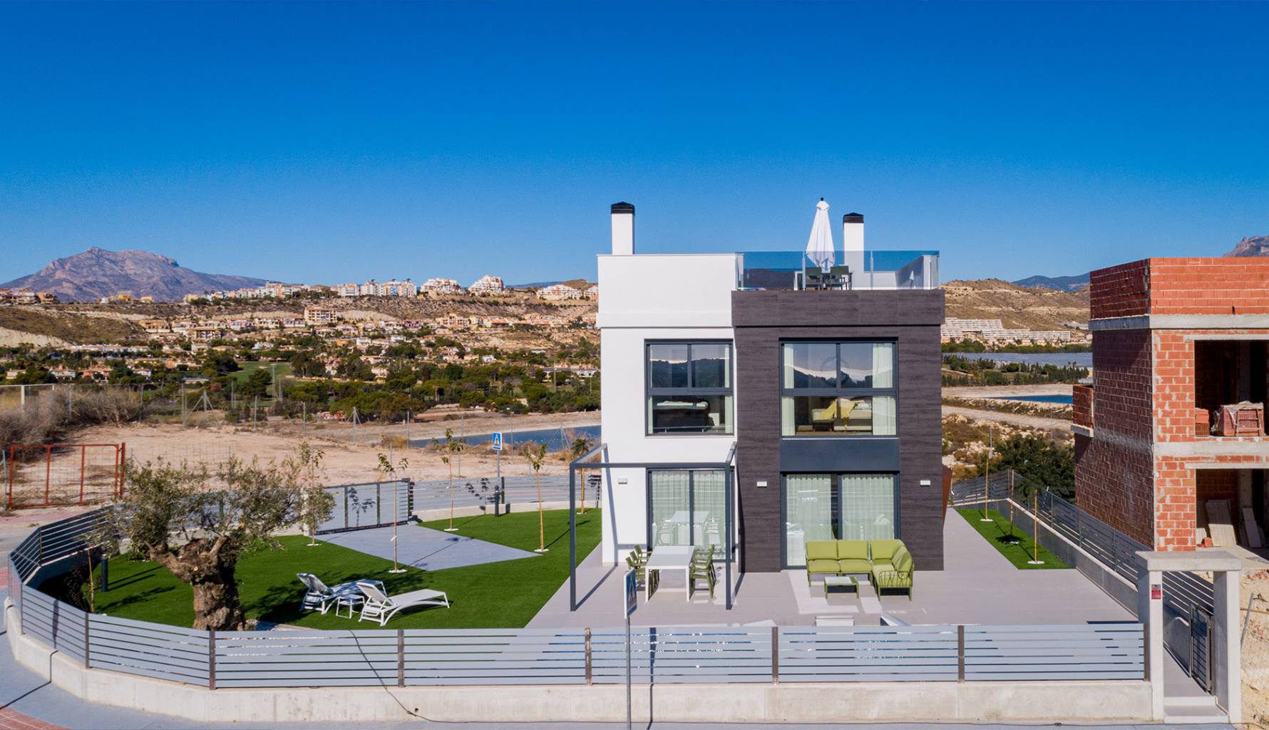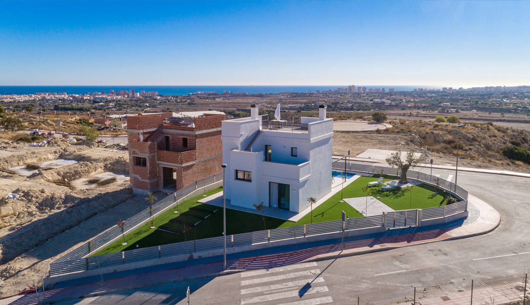 Die Außenbereiche dieser Häuser in Mutxamel sind so gestaltet, dass sie das mediterrane Klima optimal nutzen. Jede Immobilie verfügt über einen privaten Garten, ideal, um eine persönliche Oase der Ruhe zu schaffen. Die Terrassen bieten zusätzlichen Außenraum, ideal für Abendessen im Freien oder einfach zum Entspannen, während man den Meerblick genießt. Darüber hinaus verfügt jedes Haus über einen privaten Pool, der an warmen Sommertagen einen erfrischenden Ort bietet. Das Solarium ist ein weiteres Highlight und bietet einen erhöhten Bereich zum Sonnenbaden mit völliger Privatsphäre.