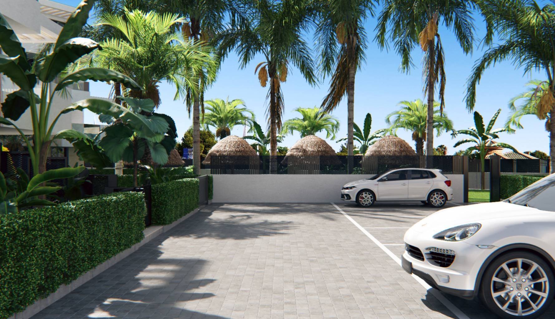 Die Außenbereiche dieser Wohnanlage sind darauf ausgelegt, das mediterrane Klima optimal zu nutzen. Jede Immobilie verfügt über Zugang zu einem privaten Garten, ideal für entspannte Momente im Freien. Darüber hinaus ermöglichen die großzügigen Terrassen ungestörte Ausblicke und gesellige Stunden mit Familie oder Freunden. Die Gemeinschaft verfügt auch über eine Gemeinschaftsgarage, die das Parken von Fahrzeugen erleichtert und den Komfort einer Ladestation für Elektroautos bietet.