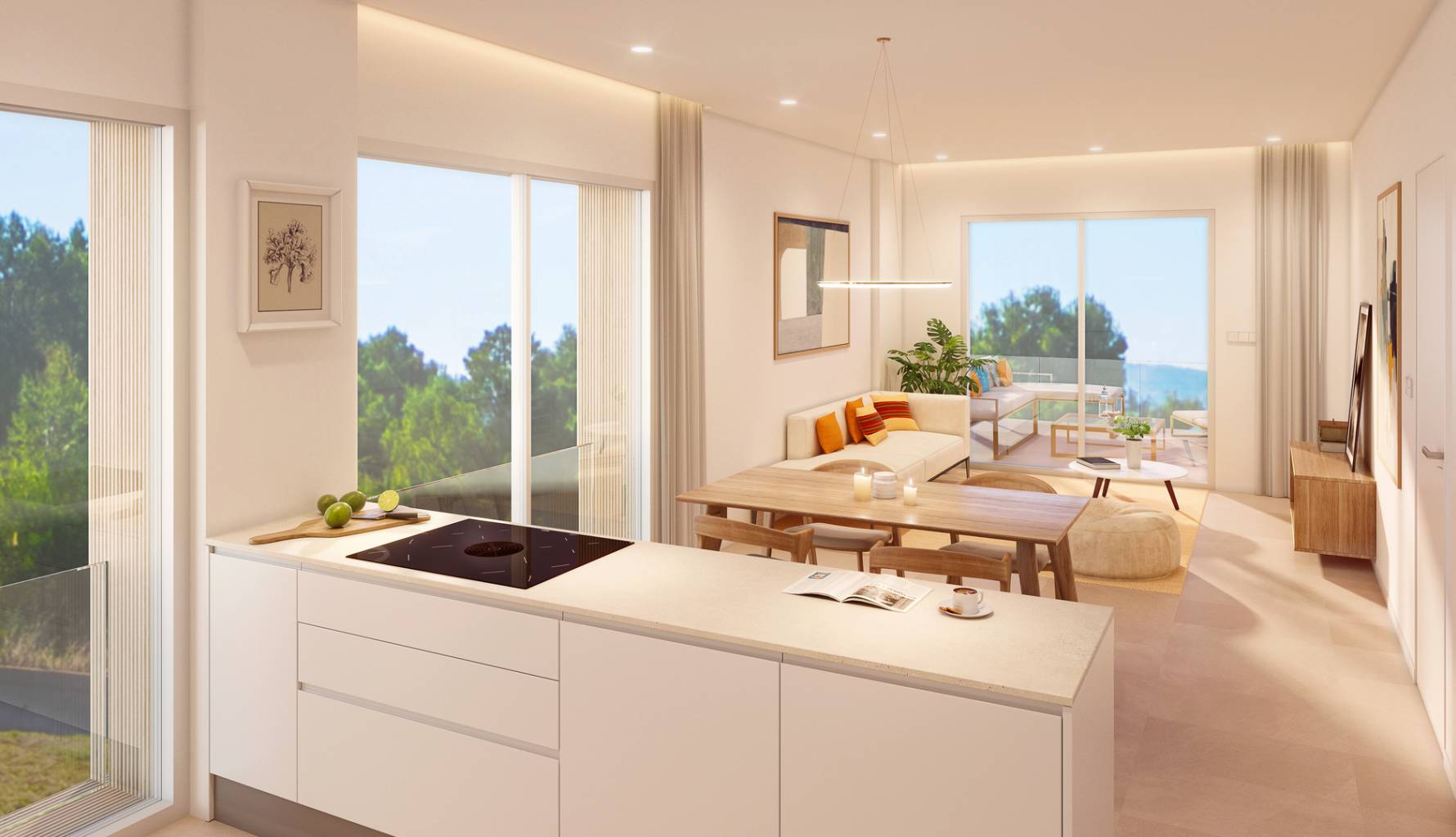 Das Innere der Wohnungen ist sorgfältig gestaltet, um einen gemütlichen und funktionalen Raum zu bieten. Die Grundrissoptionen umfassen Wohnungen mit 2 und 3 Schlafzimmern, alle mit 2 Bädern, was Flexibilität für Familien unterschiedlicher Größe bietet. Keramikböden verleihen einen modernen Touch und sind pflegeleicht. Die Einbeziehung eines privaten Whirlpools in einigen Immobilien fügt ein Element von Luxus und Entspannung hinzu. Darüber hinaus sorgt die Vorinstallation der Klimaanlage dafür, dass die Wohnungen das ganze Jahr über eine angenehme Temperatur halten.