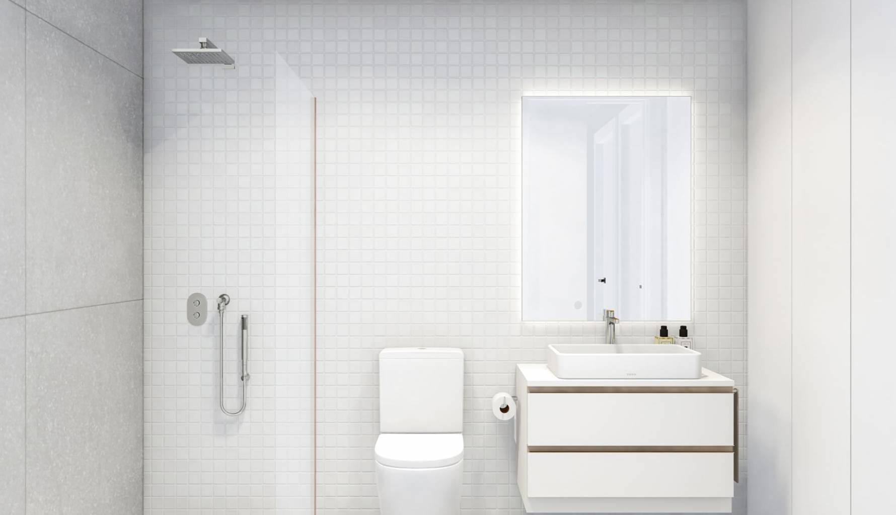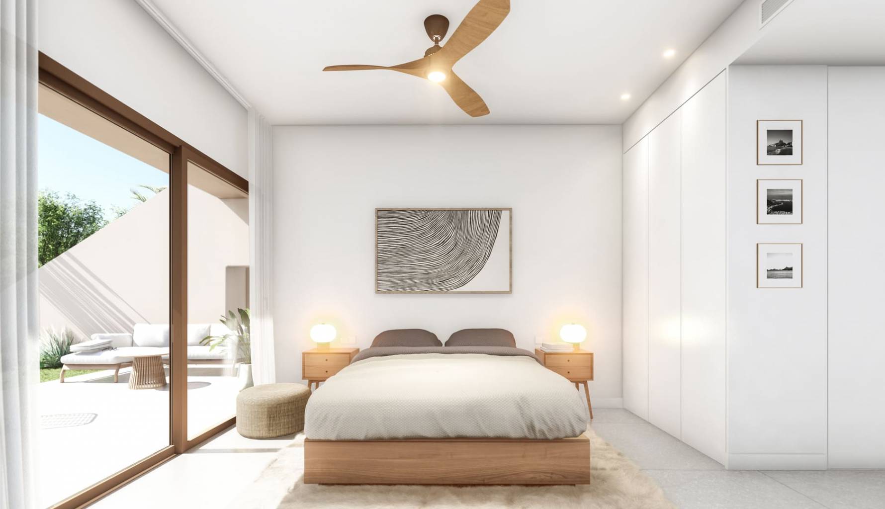 Die Innenräume der Bungalows sind mit einem Fokus auf Funktionalität und Komfort gestaltet. Jede Einheit verfügt über drei Schlafzimmer und zwei Badezimmer, was ausreichend Platz für Familien oder Gäste bietet. Die Böden aus Feinsteinzeug verleihen einen Hauch von Eleganz und sind pflegeleicht. Elektrische Rollläden und die enthaltenen Elektrogeräte erleichtern den Alltag, während Einbauschränke effizienten Stauraum bieten. Diese Details sorgen dafür, dass jedes Zuhause ein komfortabler und moderner Rückzugsort ist.