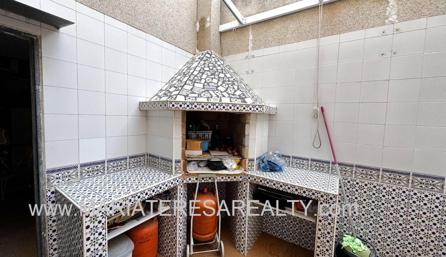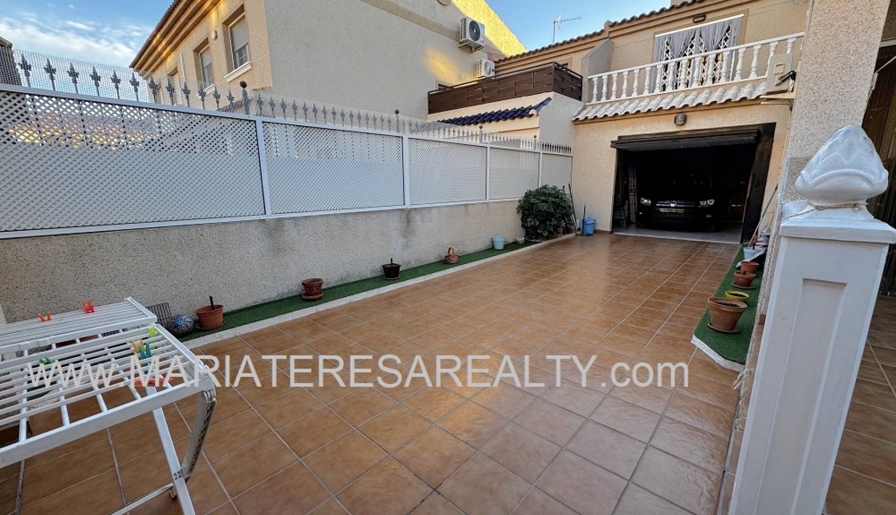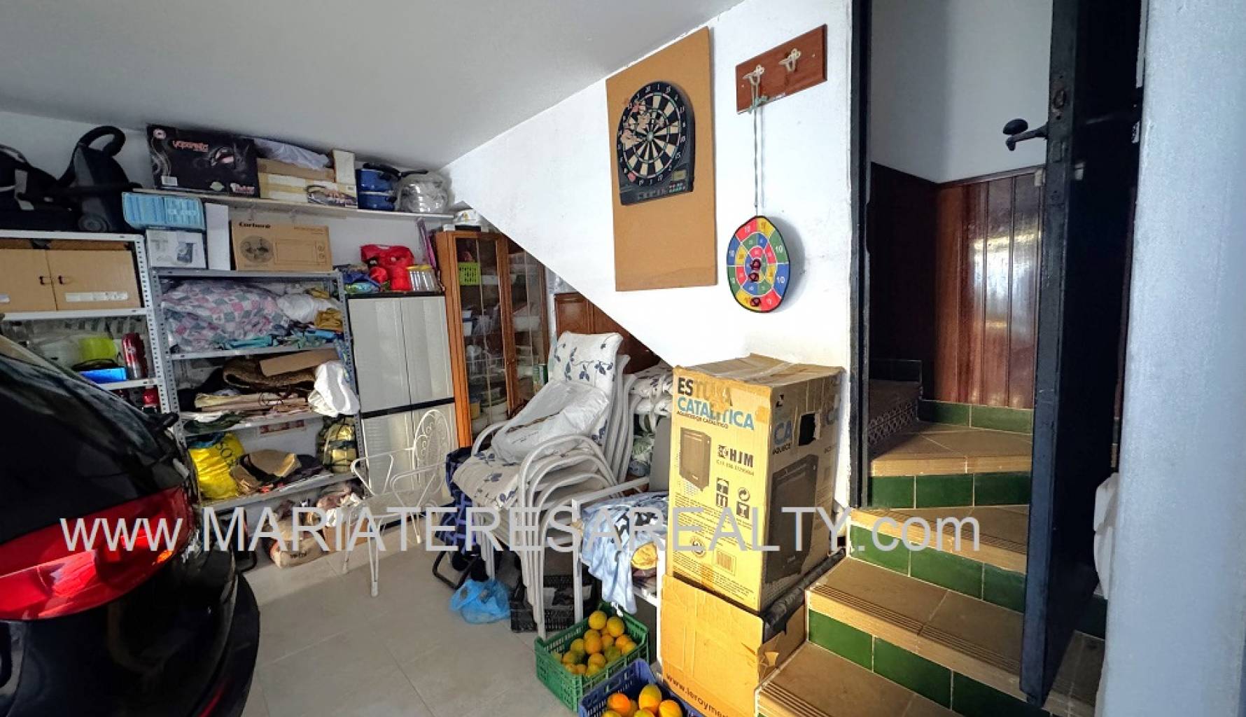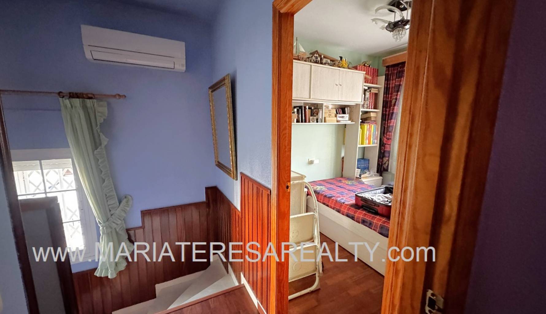 Wunderschöne Maisonette-Wohnung mit einem großzügigen, 90 m² großen Garten mit Markisen und einer 28 m² großen Garage. Im Erdgeschoss (53 m²) befindet sich eine kleine Eingangshalle, die den Eingang vom Wohnzimmer trennt. Ein geräumiges Wohn-/Esszimmer mit Zierkamin führt zu einer kleinen Speisekammer unter der Treppe, einem Badezimmer mit Dusche und einer voll ausgestatteten, separaten Küche mit Zugang zu einer großen Terrasse mit eingebautem Grill und Markisen. Die Terrasse ist direkt mit der Garage verbunden, von der aus eine Treppe zu einem 28 m² großen Dachboden mit Balkon und Kamin führt. Das Obergeschoss dieser Maisonette-Wohnung hat eine Wohnfläche von 67 m² und besteht aus vier geräumigen Schlafzimmern mit Einbauschränken und einem Badezimmer mit Dusche. Zwei der Schlafzimmer sowie das Wohnzimmer und der Flur zu den Schlafzimmern sind klimatisiert. Das Haus verfügt über Sicherheitsgitter, doppelt verglaste Fenster und Moskitonetze an den Fenstern und Türen zum Haus und zur Terrasse.