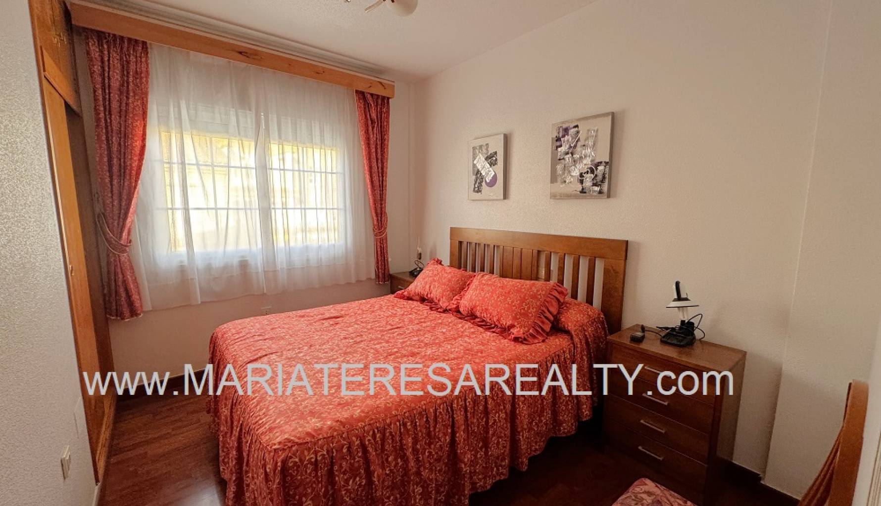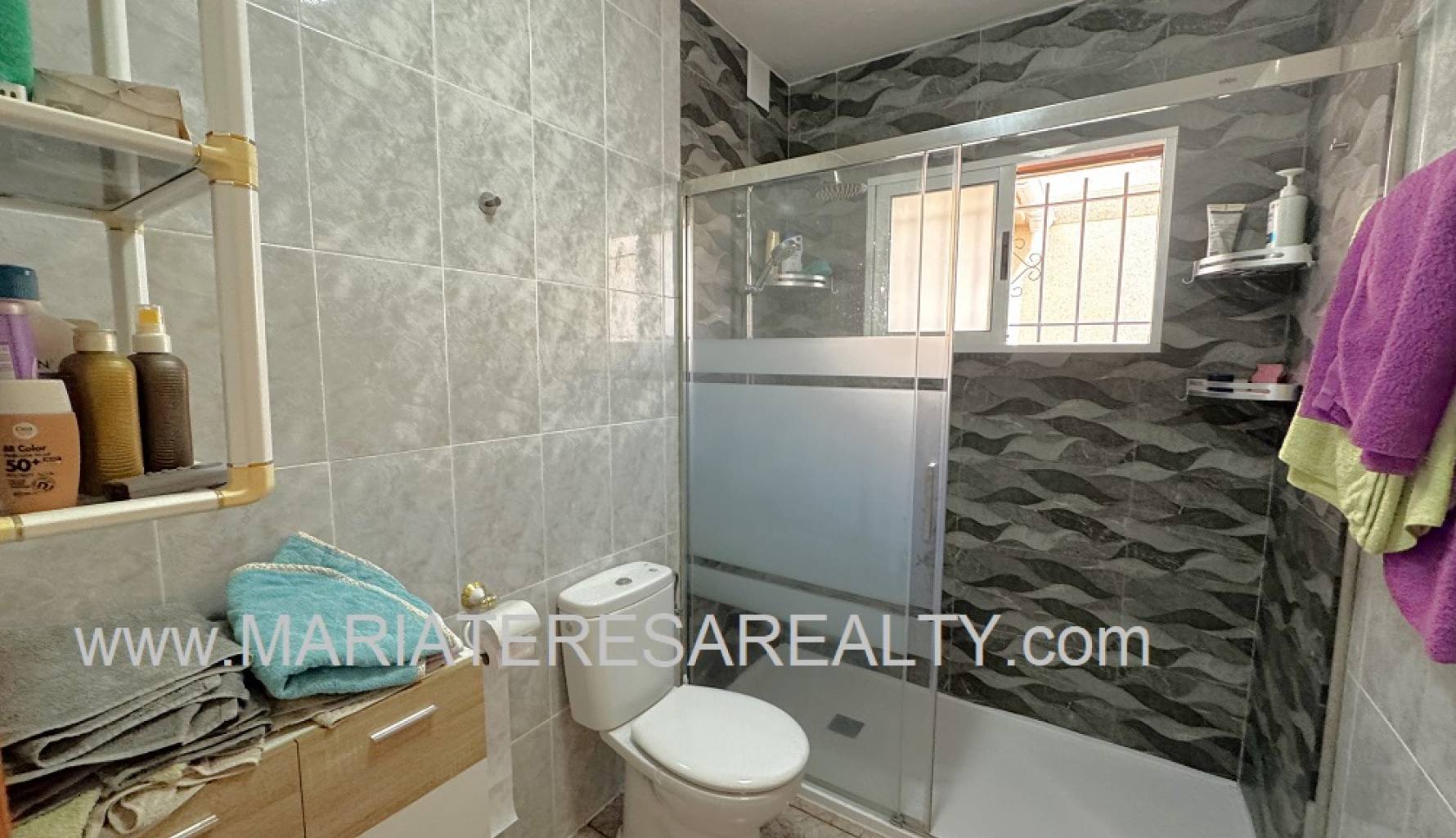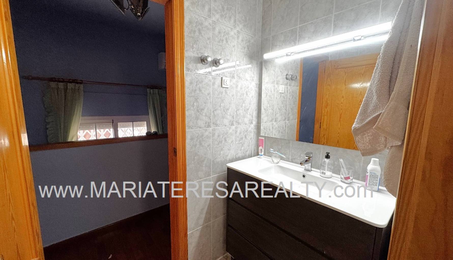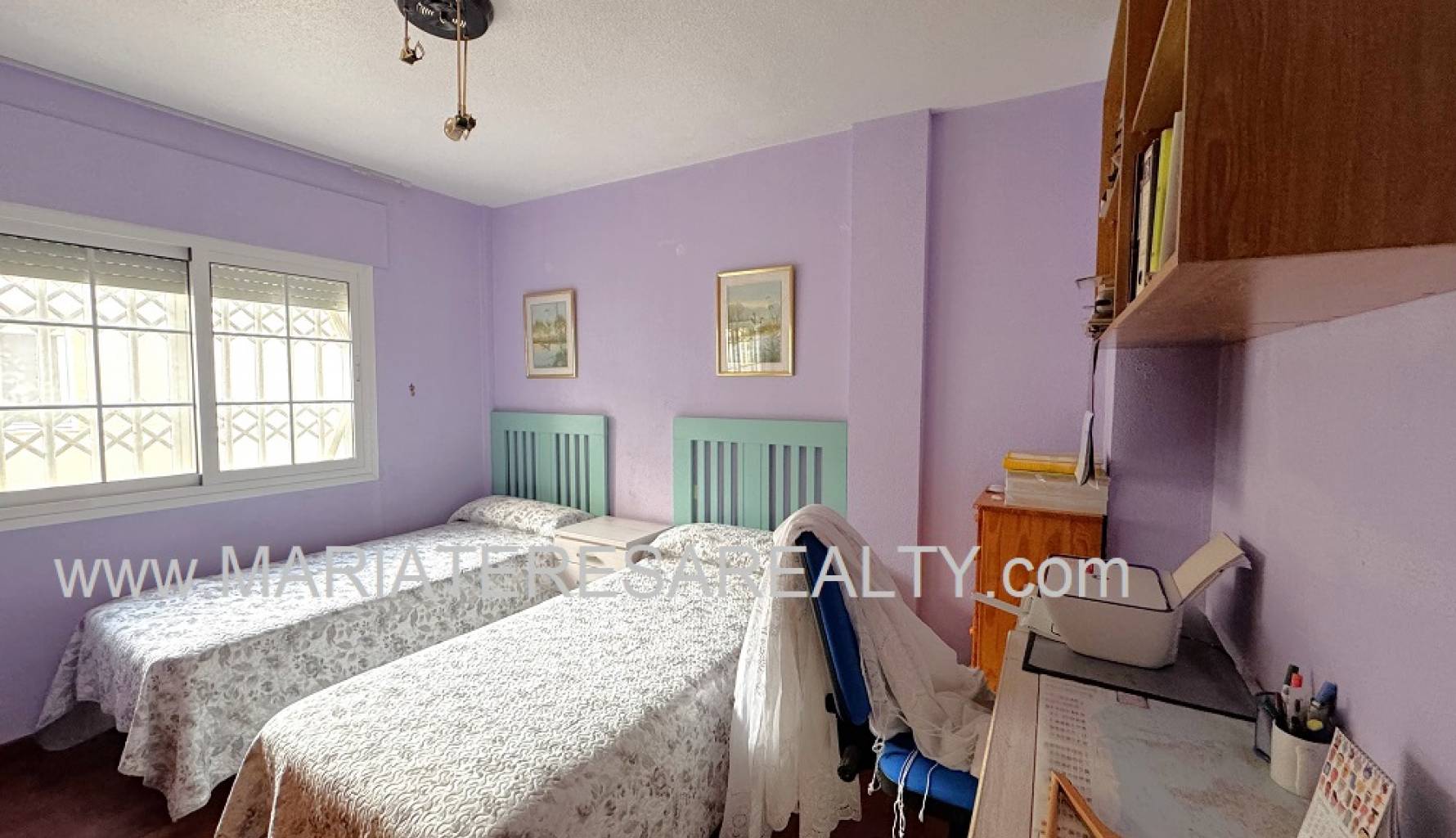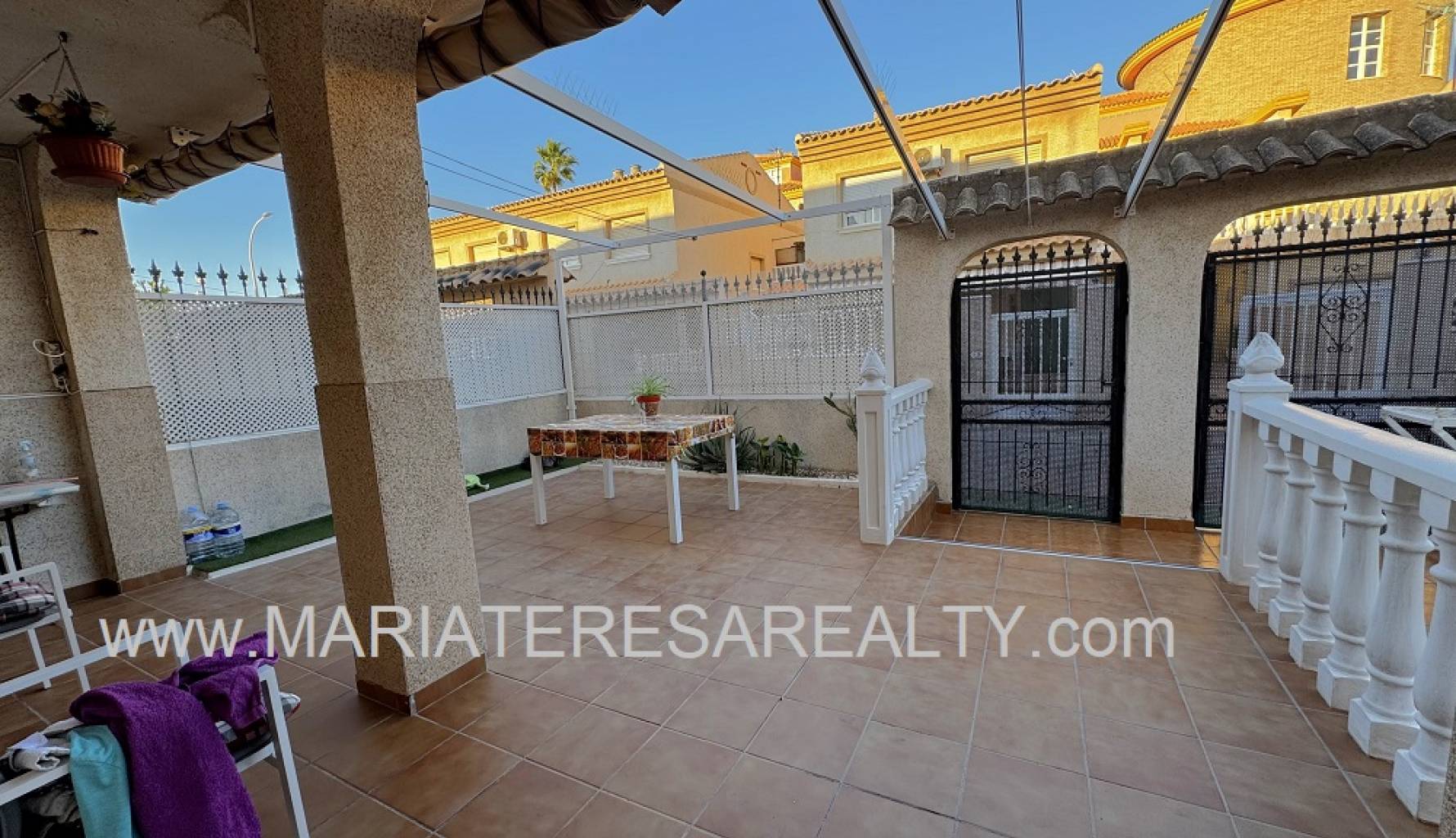 Wunderschöne Maisonette-Wohnung mit einem großzügigen, 90 m² großen Garten mit Markisen und einer 28 m² großen Garage. Im Erdgeschoss (53 m²) befindet sich eine kleine Eingangshalle, die den Eingang vom Wohnzimmer trennt. Ein geräumiges Wohn-/Esszimmer mit Zierkamin führt zu einer kleinen Speisekammer unter der Treppe, einem Badezimmer mit Dusche und einer voll ausgestatteten, separaten Küche mit Zugang zu einer großen Terrasse mit eingebautem Grill und Markisen. Die Terrasse ist direkt mit der Garage verbunden, von der aus eine Treppe zu einem 28 m² großen Dachboden mit Balkon und Kamin führt. Das Obergeschoss dieser Maisonette-Wohnung hat eine Wohnfläche von 67 m² und besteht aus vier geräumigen Schlafzimmern mit Einbauschränken und einem Badezimmer mit Dusche. Zwei der Schlafzimmer sowie das Wohnzimmer und der Flur zu den Schlafzimmern sind klimatisiert. Das Haus verfügt über Sicherheitsgitter, doppelt verglaste Fenster und Moskitonetze an den Fenstern und Türen zum Haus und zur Terrasse.