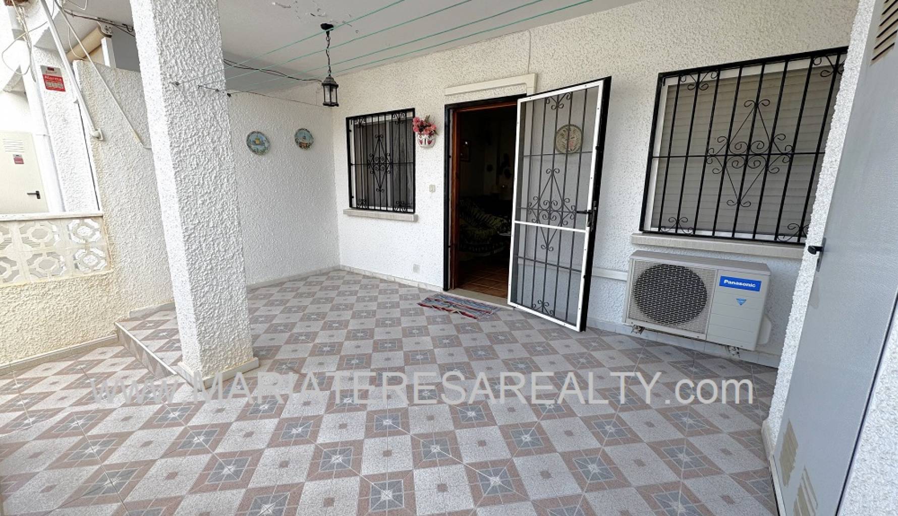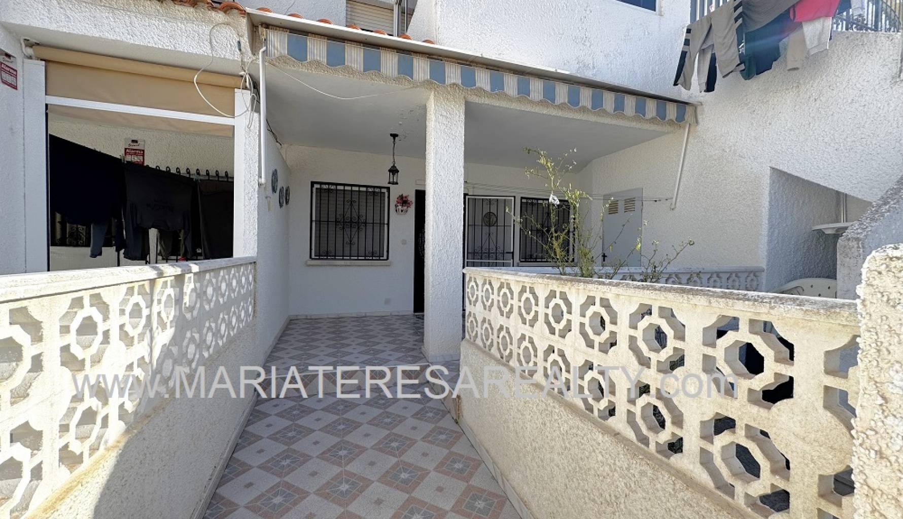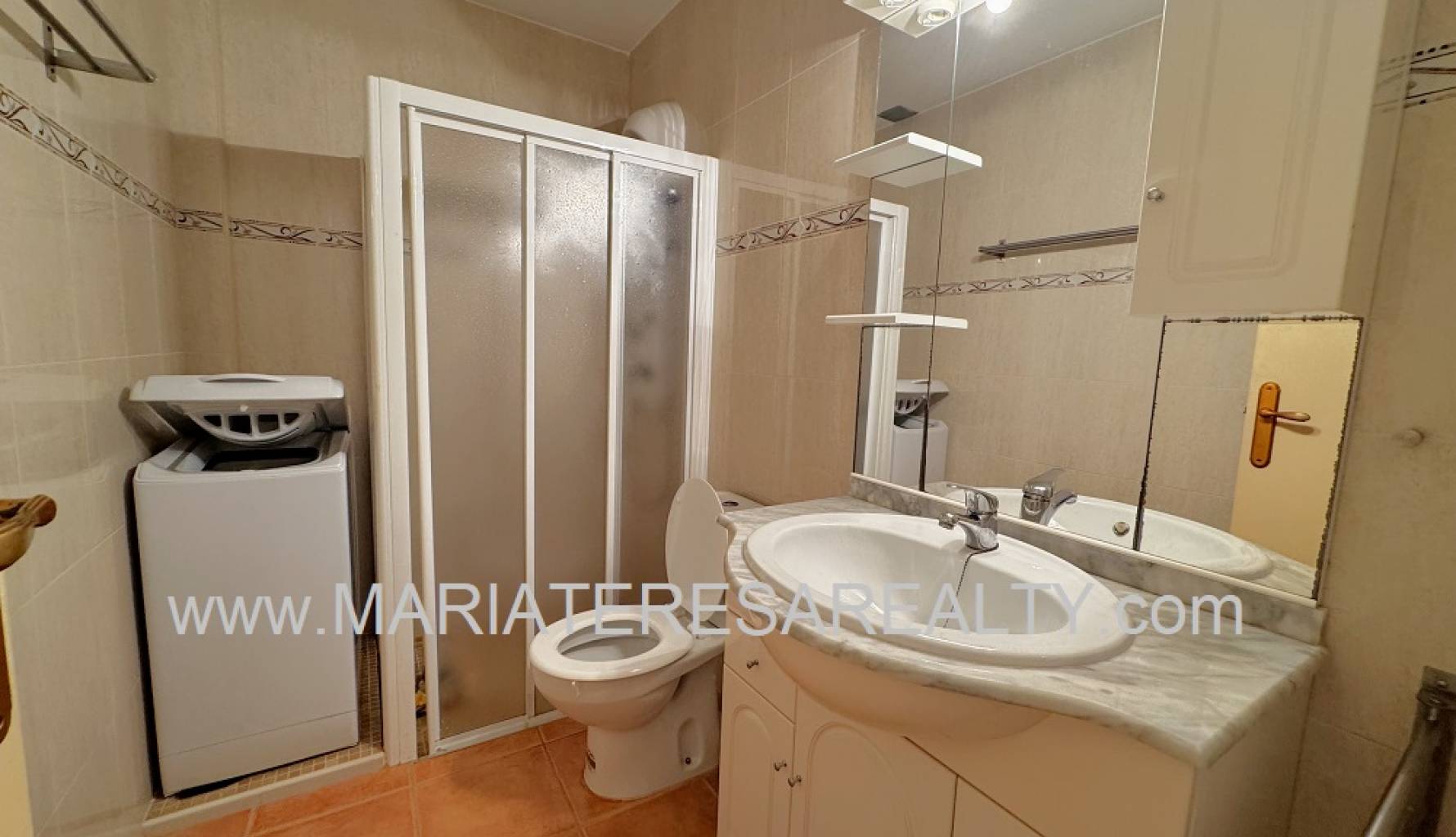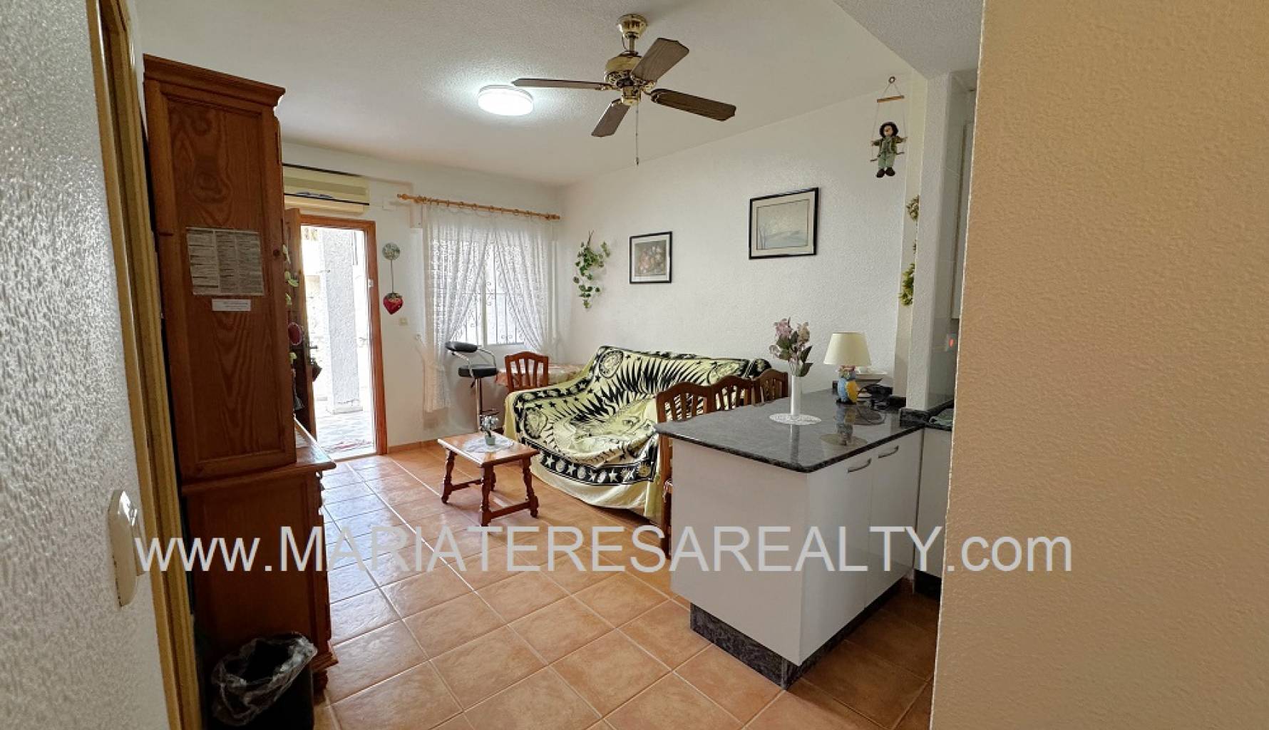 Charmante Erdgeschosswohnung mit 7,26 m² Terrasse, 17,04 m² Garten und 3 m² Abstellraum in der Wohnanlage Oasis in Los Narejos. Die 39 m² große Wohnung bietet ein geräumiges Wohn-/Esszimmer mit Klimaanlage und voll ausgestatteter offener Küche, ein großes Schlafzimmer mit Deckenventilator und Einbauschränken sowie ein Badezimmer mit Dusche und Toplader-Waschmaschine.
