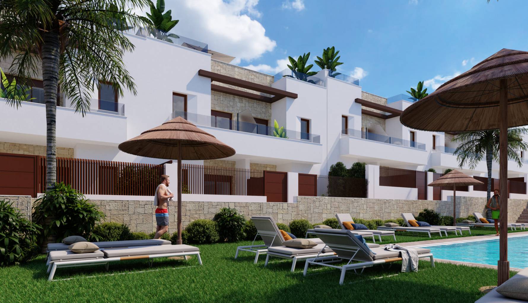 Die Reihenhäuser verfügen über ein Außendesign mit Terrassen und privaten Gärten, ideal, um das mediterrane Klima zu genießen. Außerdem besteht die Möglichkeit, ein Solarium hinzuzufügen, um die Aussicht und die Sonne das ganze Jahr über optimal zu nutzen. Die Gemeinschaftsbereiche sind von gepflegten Gärten umgeben und bieten eine ruhige und entspannende Umgebung für alle Bewohner.