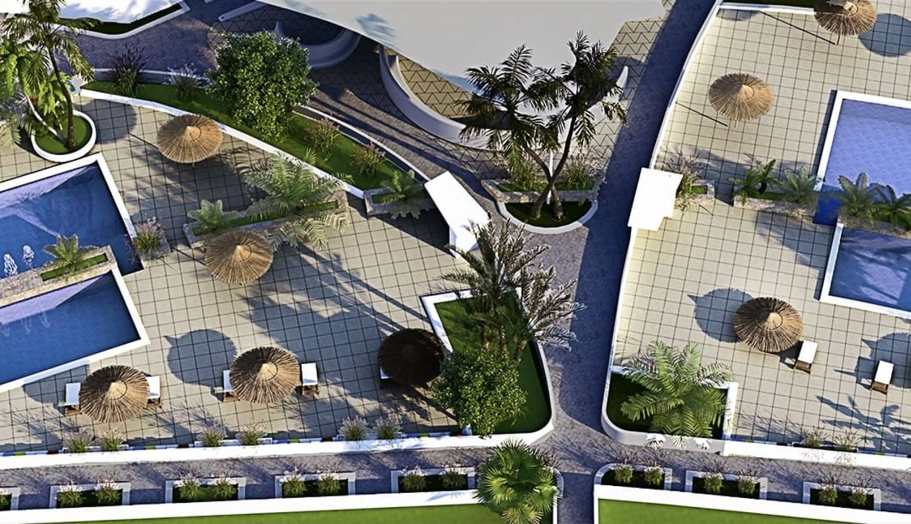 Die Außenbereiche dieser Wohnanlage sind so gestaltet, dass sie das mediterrane Klima optimal nutzen. Viele der Immobilien verfügen über einen privaten Garten, ideal für diejenigen, die einen Außenbereich zum Entspannen oder für Outdoor-Aktivitäten suchen. Darüber hinaus bieten die Terrassen einen perfekten Ort, um den Meerblick zu genießen oder im Freien zu speisen. Für diejenigen, die sich für einen Hoch-Bungalow entscheiden, ist das Solarium ein zusätzlicher Raum, der es ermöglicht, die Sonne den ganzen Tag über zu genießen. Die Nähe zum Meer, nur 600 Meter entfernt, macht Wasseraktivitäten und Strandspaziergänge zu einer täglichen Option für die Bewohner.