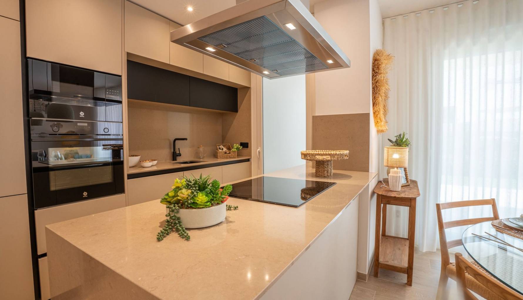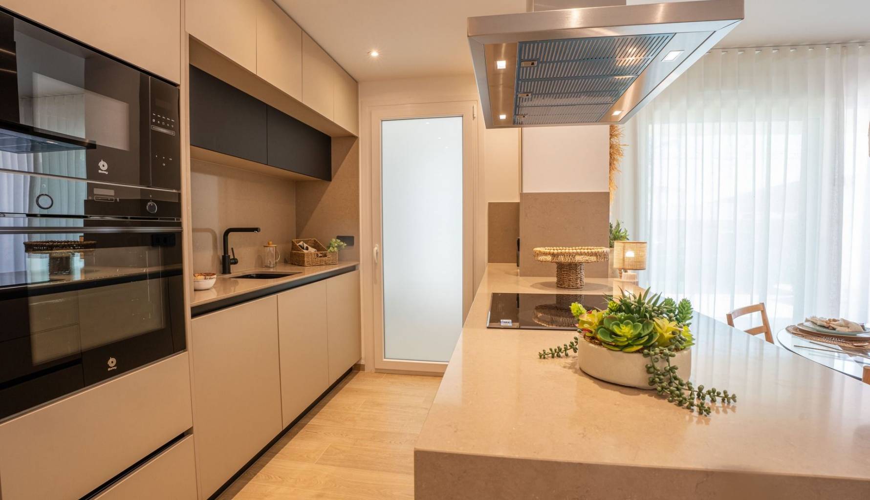 Die Außenbereiche dieser Bungalows zeichnen sich durch großzügige Terrassen und private Gärten aus, die perfekt sind, um das mediterrane Klima zu genießen. Die Möglichkeit, eine optionale Garage zu haben, bietet den Bewohnern zusätzlichen Komfort. Darüber hinaus sorgen elektrische Rollläden und Klimaanlage das ganze Jahr über für ein angenehmes Ambiente. Die moderne Architektur und die hochwertigen Oberflächen fügen sich harmonisch in die natürliche Umgebung von La Finca Golf ein.