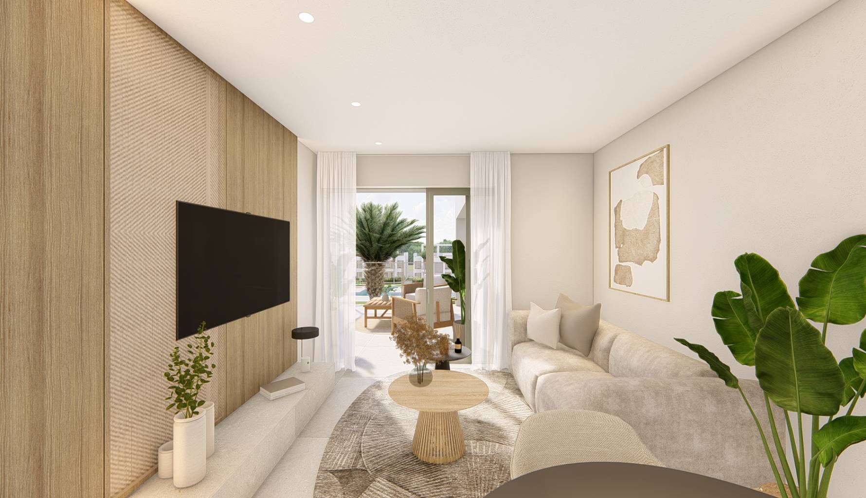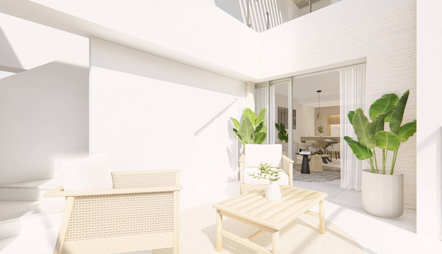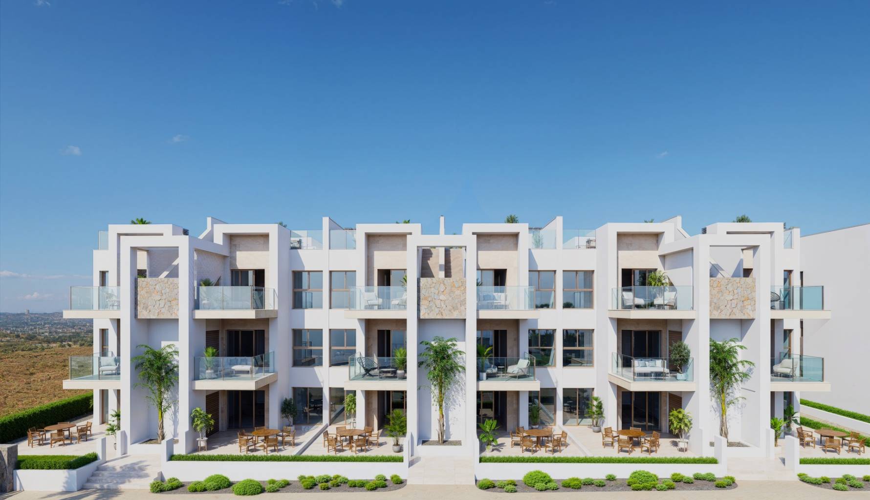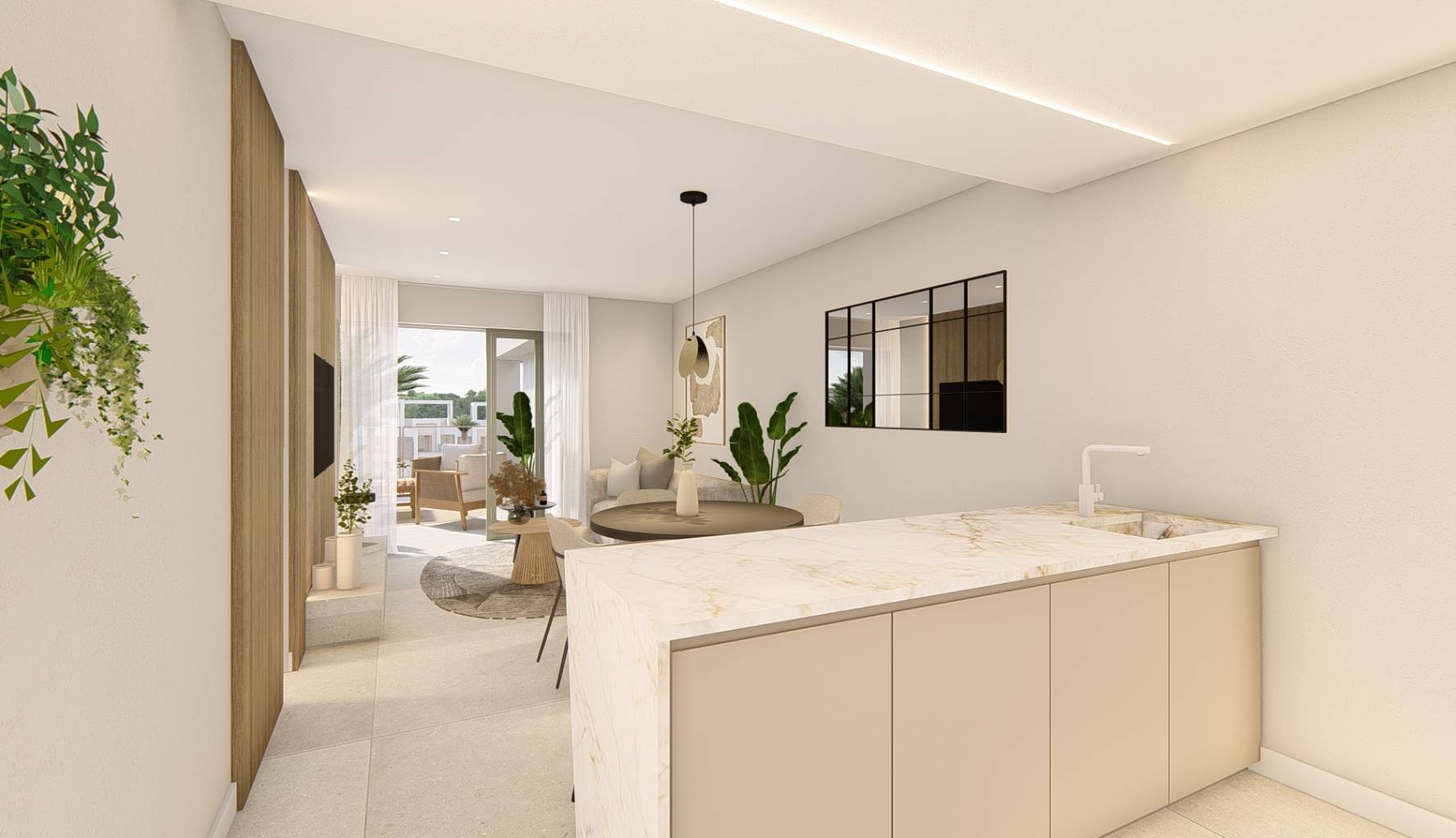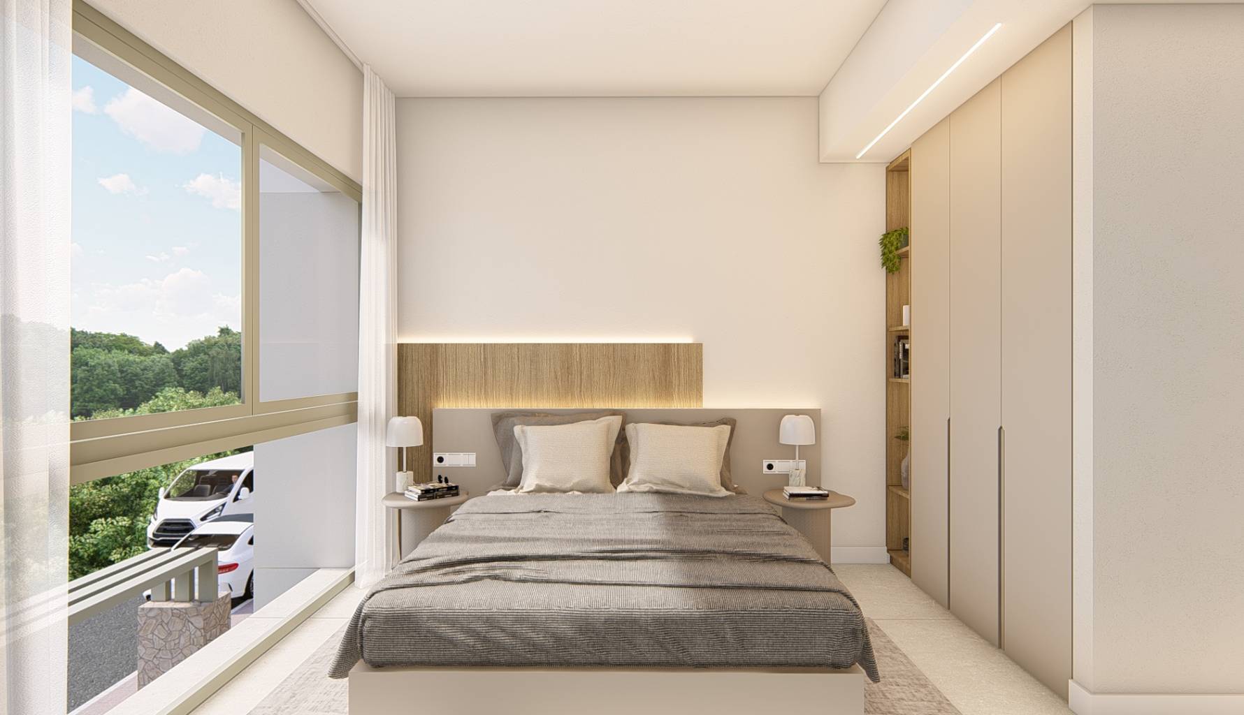 Das Innere der Wohnungen ist mit einem Fokus auf Qualität und Funktionalität gestaltet. Alle Immobilien verfügen über Feinsteinzeugböden, die Haltbarkeit und Stil vereinen. Der Komfort ist durch die Installation von Klimaanlagen und elektrischen Rollläden garantiert, während moderne Geräte den Alltag erleichtern. Einbauschränke bieten effizienten Stauraum, und die Video-Gegensprechanlage bietet ein zusätzliches Maß an Sicherheit. Die Wohnungen sind in Konfigurationen mit 2 oder 3 Schlafzimmern erhältlich, alle mit 2 Bädern, was ausreichend Platz für Familien unterschiedlicher Größe gewährleistet.