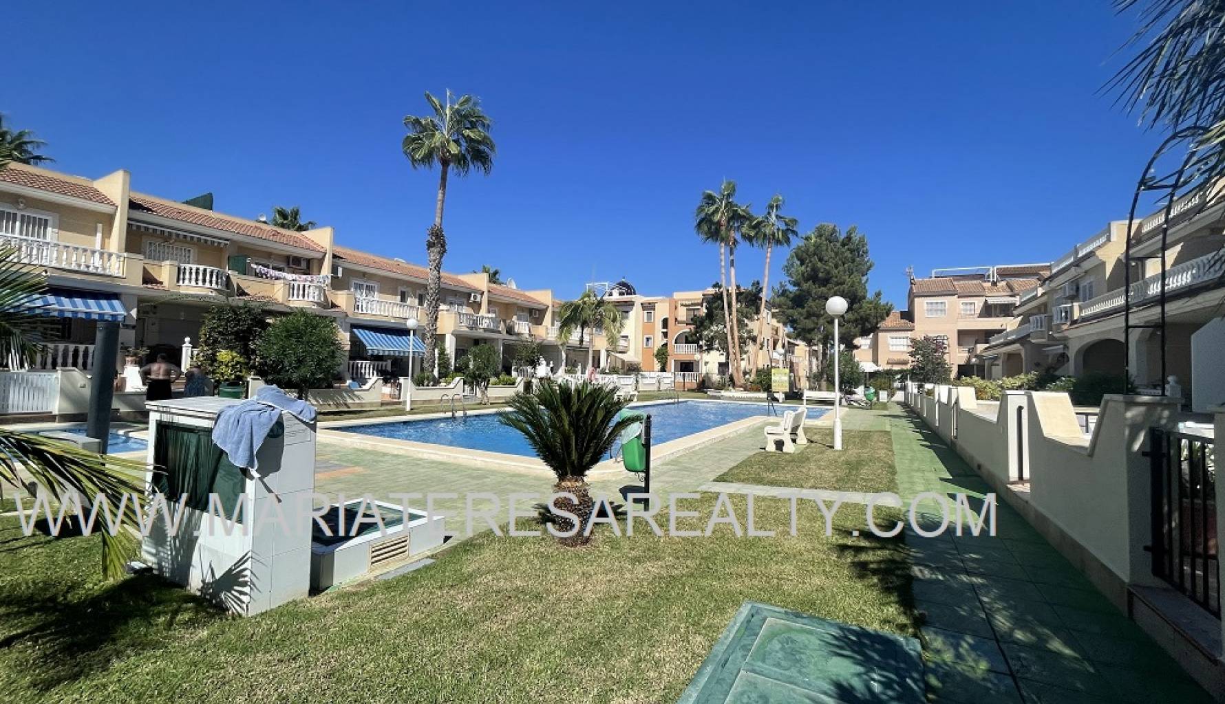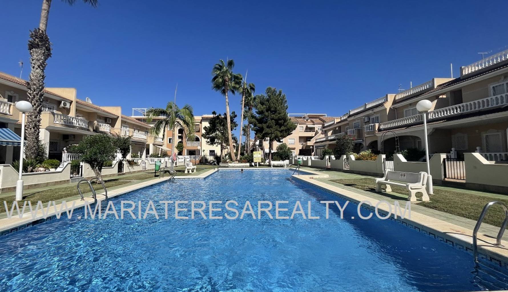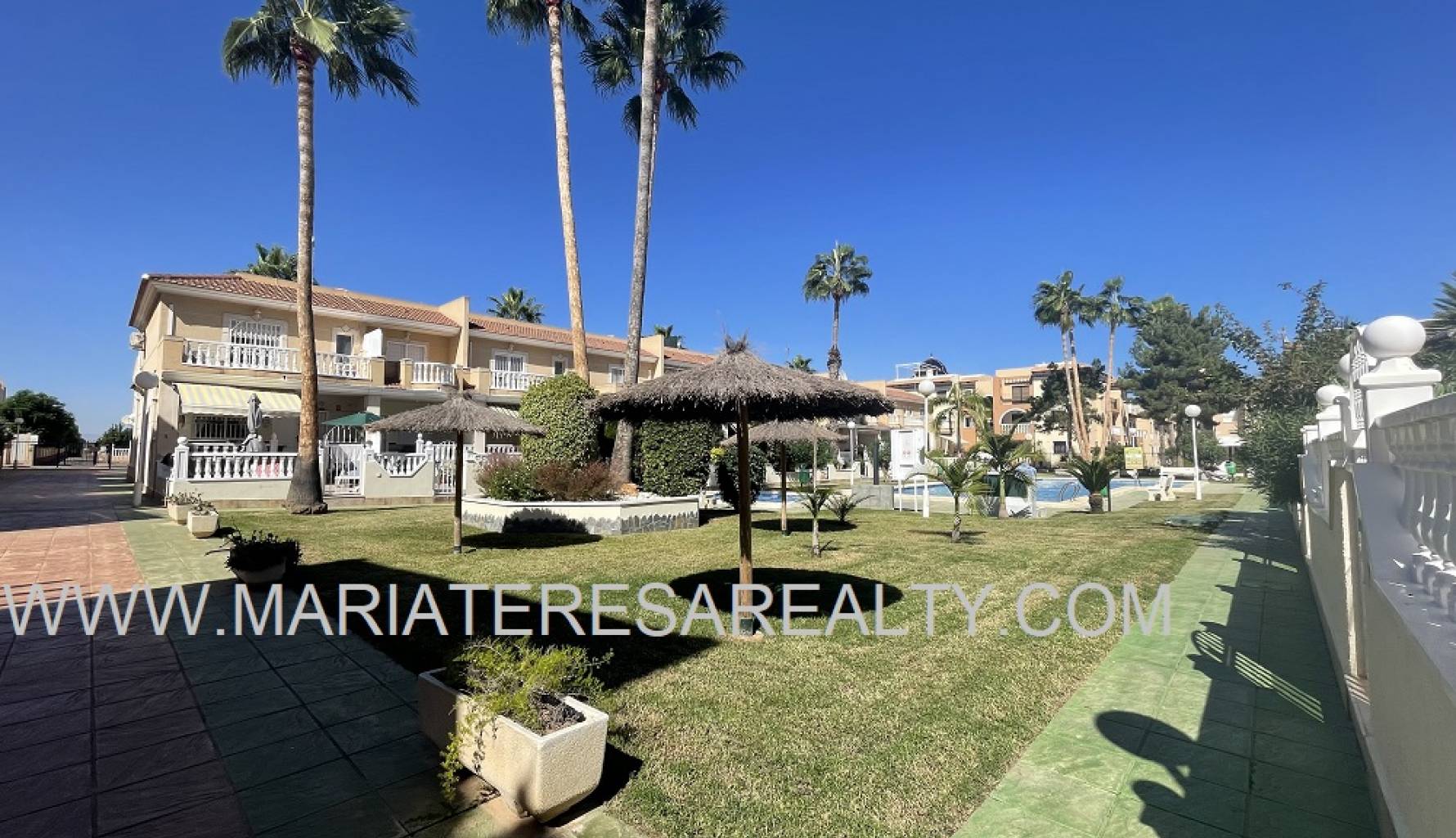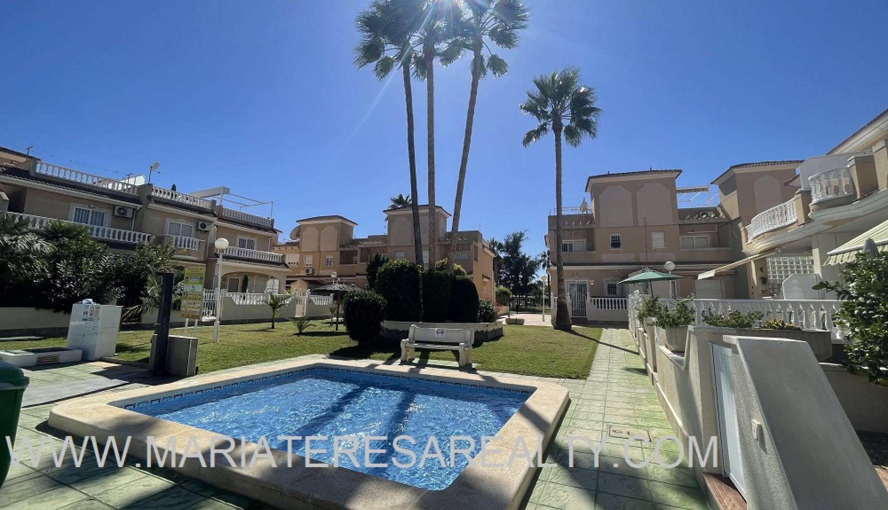 Wunderschöne Doppelhaushälfte mit privatem, nach Südosten ausgerichteten Garten, ideal zum Sonnenbaden und mit Markisen ausgestattet. Im 36 m² großen Erdgeschoss befindet sich ein geräumiges, komplett möbliertes Wohn-/Esszimmer mit Klimaanlage, angrenzend an eine voll ausgestattete offene Küche mit Granitarbeitsplatten. Außerdem gibt es ein Gäste-WC, einen kleinen Abstellraum unter der Treppe und Zugang zur hinteren Terrasse mit einem großen Abstellraum, der wiederum Zugang zum Gemeinschaftsbereich und zum Swimmingpool bietet. Im 40 m² großen Obergeschoss befinden sich ein großes Hauptschlafzimmer mit Einbauschrank, Klimaanlage und Zugang zu einem Balkon; ein Badezimmer mit Dusche; und ein zweites Schlafzimmer, das derzeit mit einem Schlafsofa, einem Einbauschrank und einer Klimaanlage ausgestattet ist. Von diesem zweiten Schlafzimmer aus gelangen Sie auf eine verglaste Terrasse mit Aluminiumverkleidung, die über eine Tür zur Treppe zum Solarium führt. Im Solarium stehen uns ca. 40 m² zur alleinigen privaten Nutzung zur Verfügung, die mit Solarpaneelen ausgestattet sind, sowie ein großer Abstellraum von ca. 6 m², in dem sich die Waschmaschine und der Warmwasserbereiter befinden.