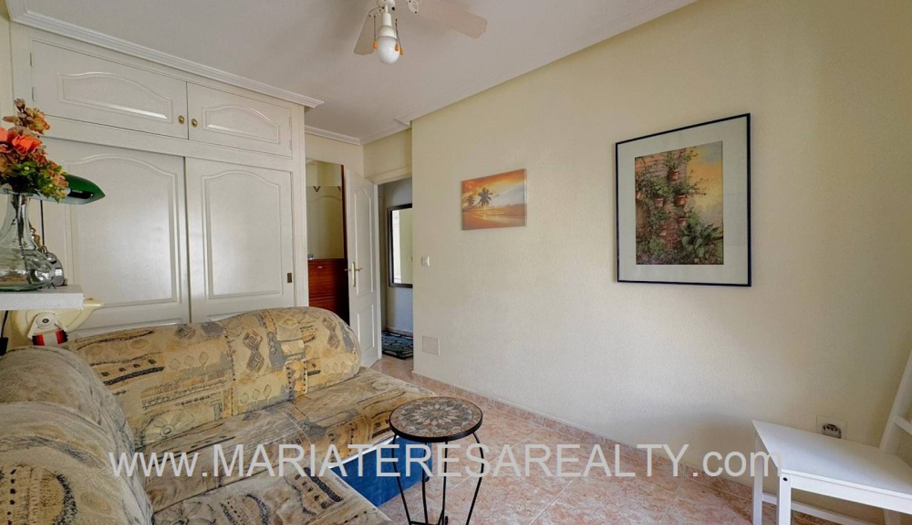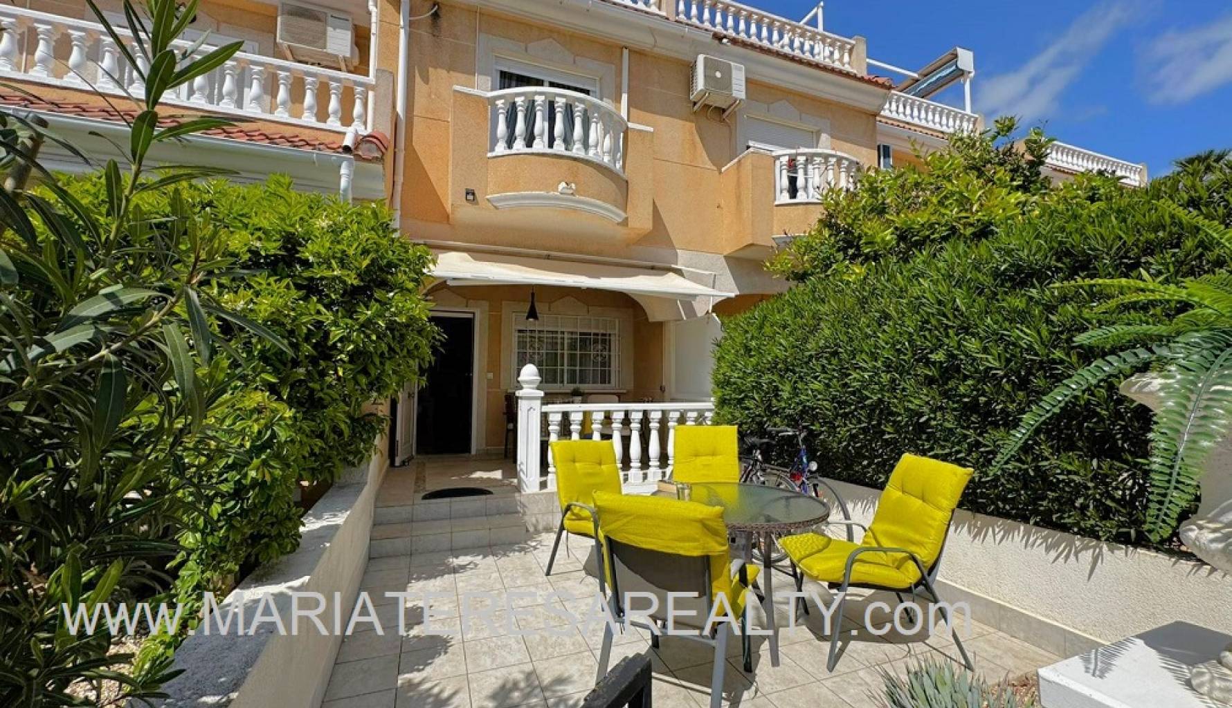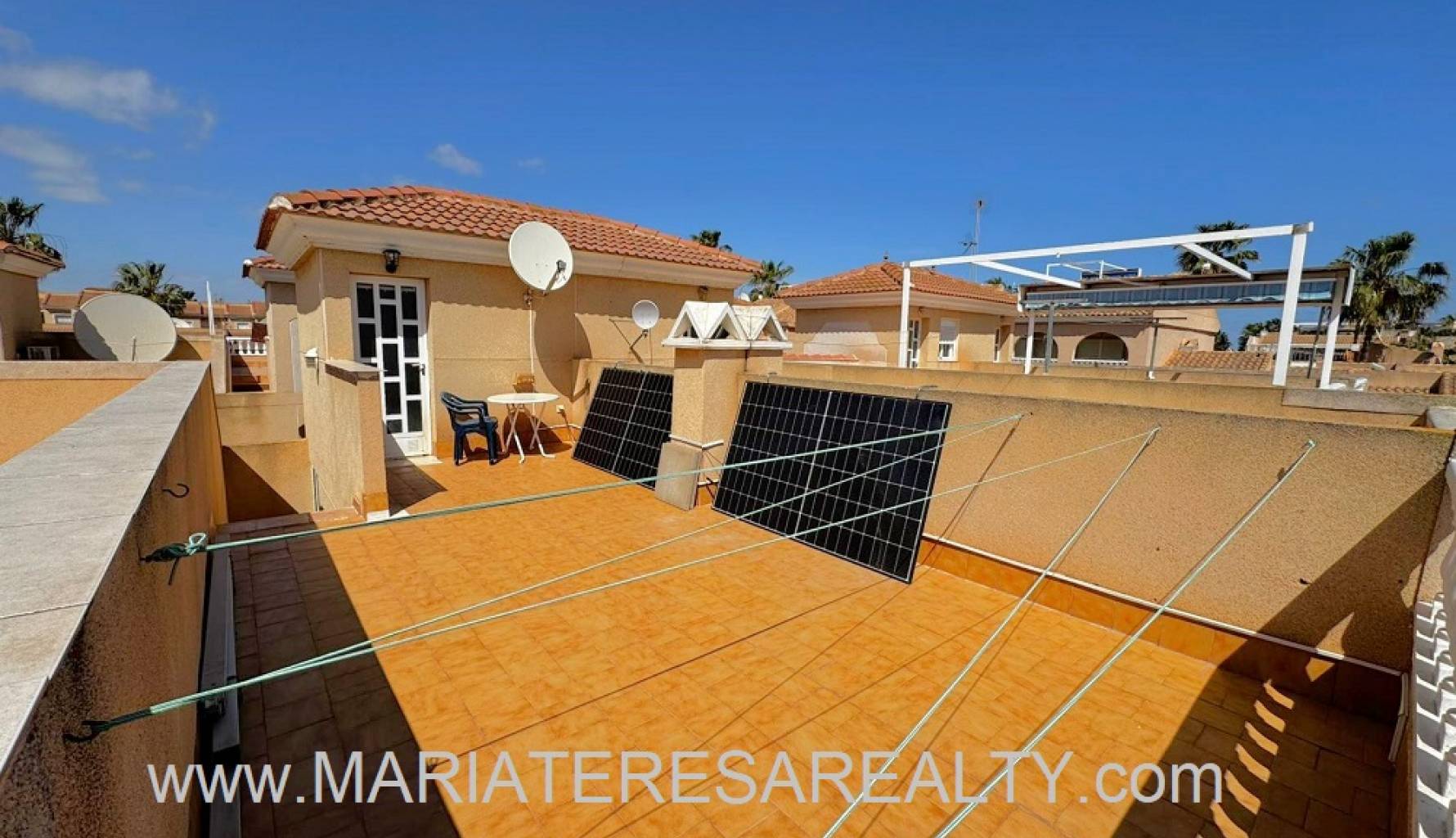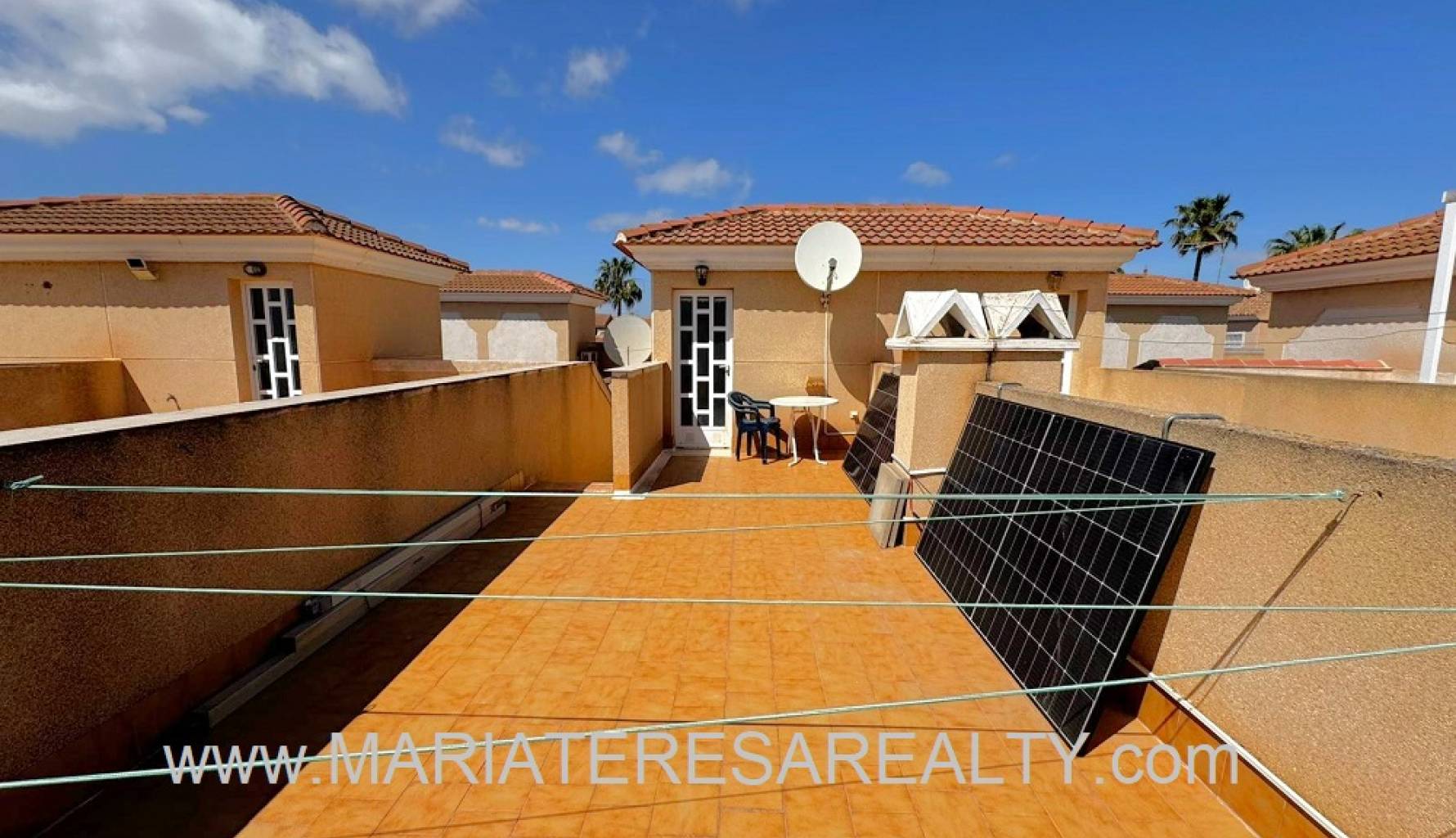 Wunderschöne Doppelhaushälfte mit privatem, nach Südosten ausgerichteten Garten, ideal zum Sonnenbaden und mit Markisen ausgestattet. Im 36 m² großen Erdgeschoss befindet sich ein geräumiges, komplett möbliertes Wohn-/Esszimmer mit Klimaanlage, angrenzend an eine voll ausgestattete offene Küche mit Granitarbeitsplatten. Außerdem gibt es ein Gäste-WC, einen kleinen Abstellraum unter der Treppe und Zugang zur hinteren Terrasse mit einem großen Abstellraum, der wiederum Zugang zum Gemeinschaftsbereich und zum Swimmingpool bietet. Im 40 m² großen Obergeschoss befinden sich ein großes Hauptschlafzimmer mit Einbauschrank, Klimaanlage und Zugang zu einem Balkon; ein Badezimmer mit Dusche; und ein zweites Schlafzimmer, das derzeit mit einem Schlafsofa, einem Einbauschrank und einer Klimaanlage ausgestattet ist. Von diesem zweiten Schlafzimmer aus gelangen Sie auf eine verglaste Terrasse mit Aluminiumverkleidung, die über eine Tür zur Treppe zum Solarium führt. Im Solarium stehen uns ca. 40 m² zur alleinigen privaten Nutzung zur Verfügung, die mit Solarpaneelen ausgestattet sind, sowie ein großer Abstellraum von ca. 6 m², in dem sich die Waschmaschine und der Warmwasserbereiter befinden.