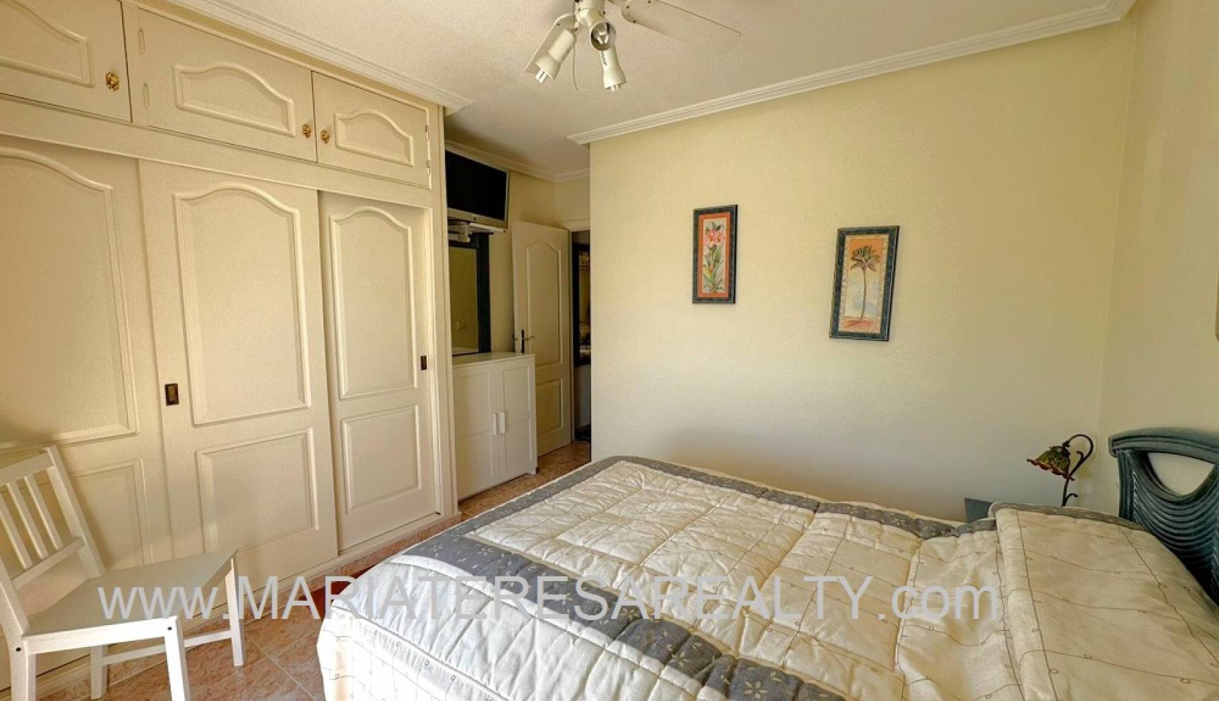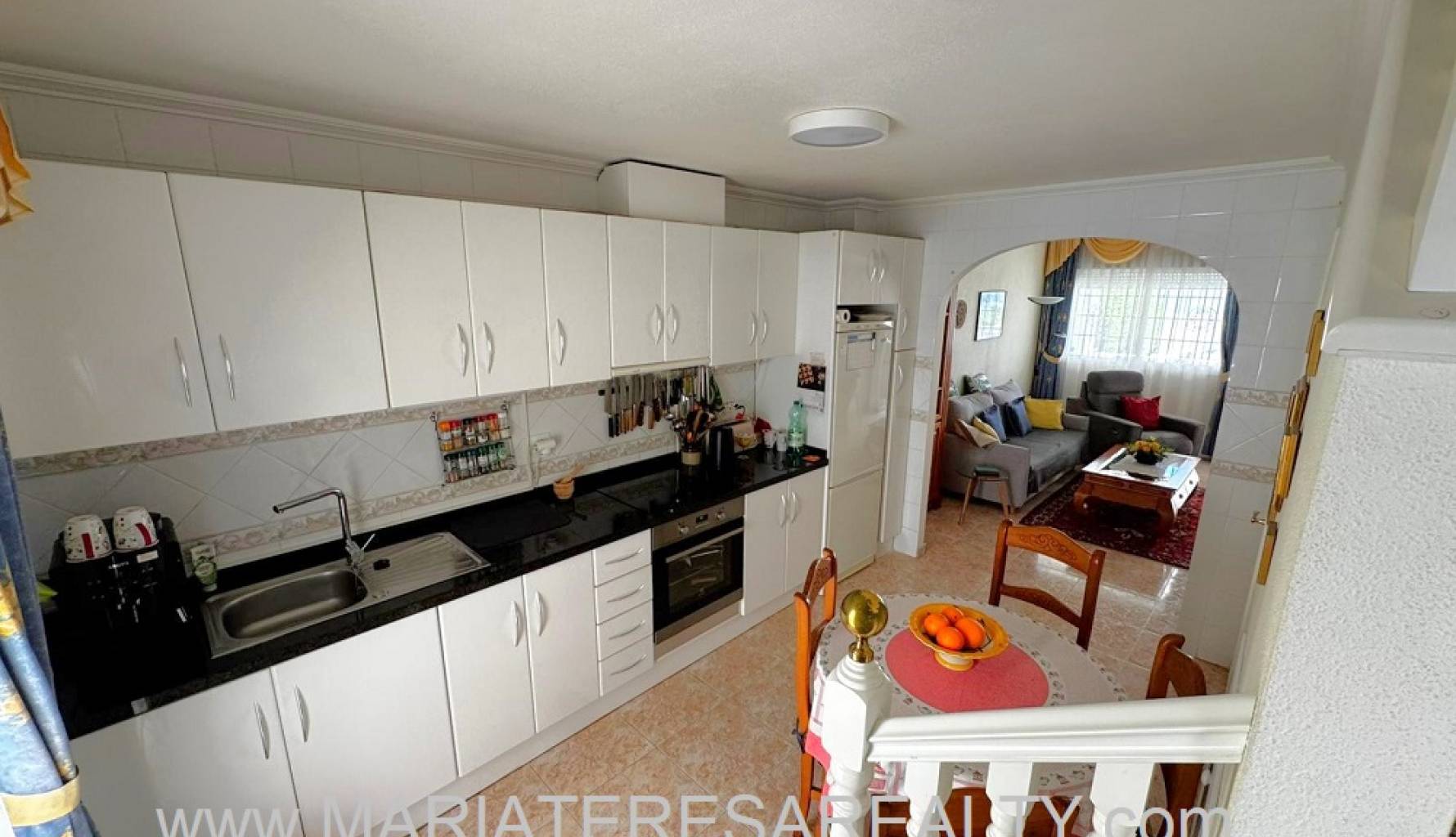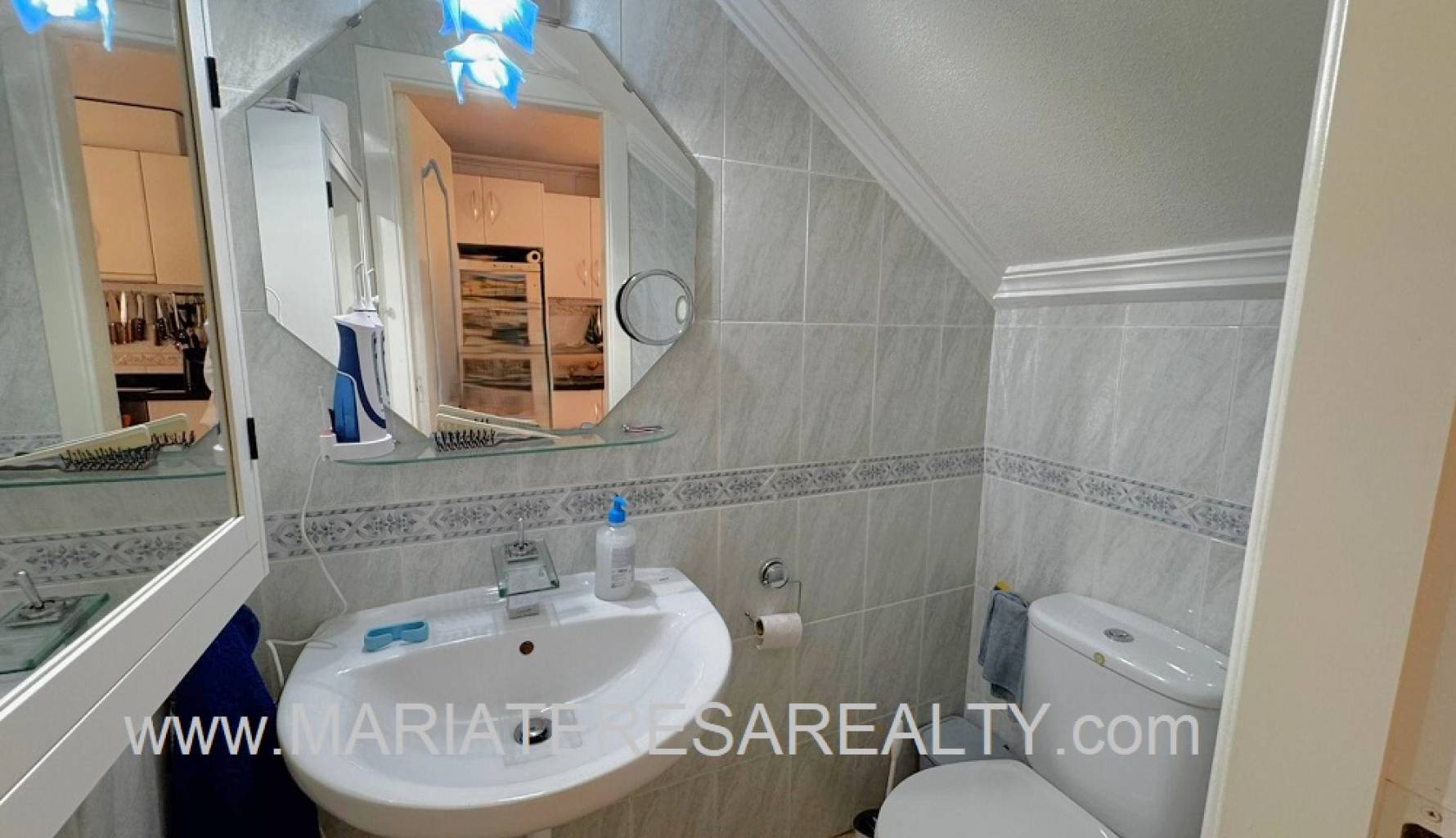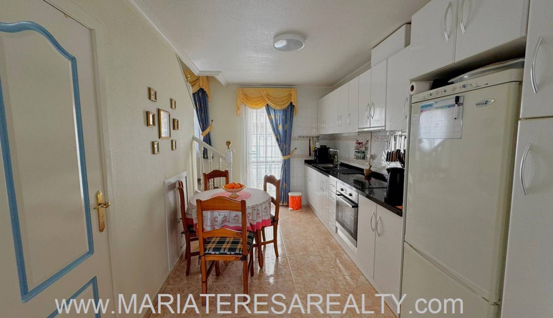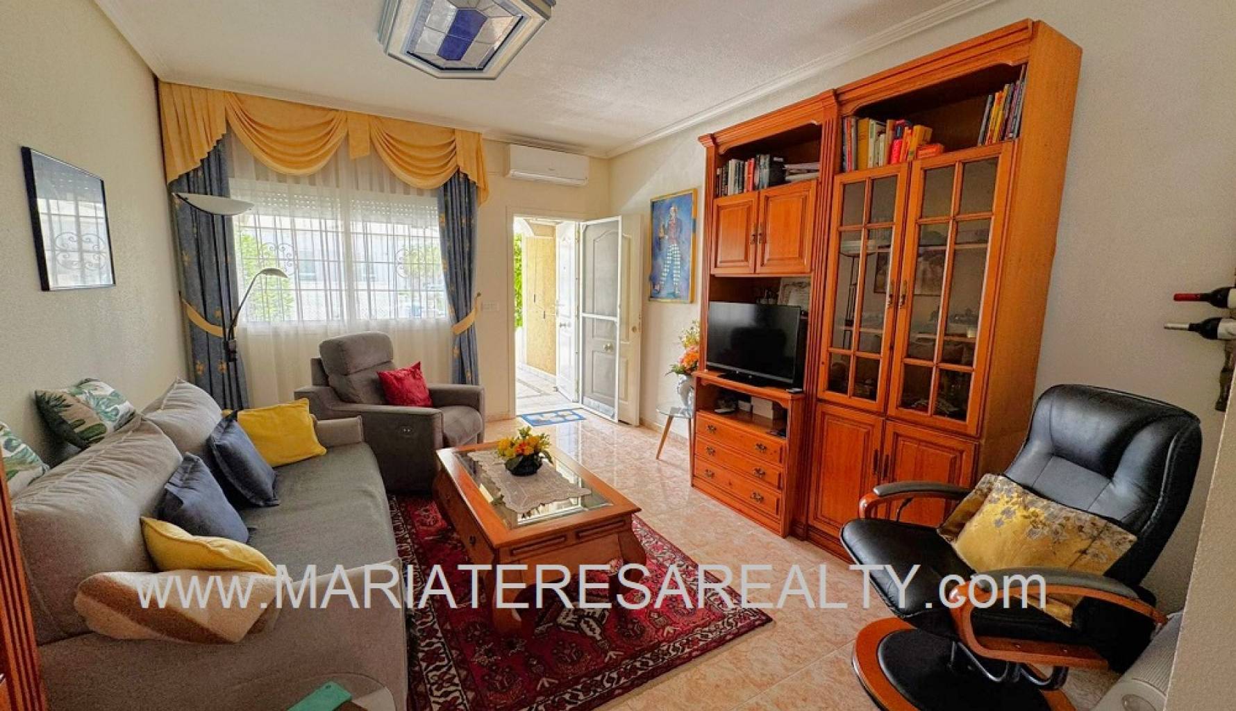 Wunderschöne Doppelhaushälfte mit privatem, nach Südosten ausgerichteten Garten, ideal zum Sonnenbaden und mit Markisen ausgestattet. Im 36 m² großen Erdgeschoss befindet sich ein geräumiges, komplett möbliertes Wohn-/Esszimmer mit Klimaanlage, angrenzend an eine voll ausgestattete offene Küche mit Granitarbeitsplatten. Außerdem gibt es ein Gäste-WC, einen kleinen Abstellraum unter der Treppe und Zugang zur hinteren Terrasse mit einem großen Abstellraum, der wiederum Zugang zum Gemeinschaftsbereich und zum Swimmingpool bietet. Im 40 m² großen Obergeschoss befinden sich ein großes Hauptschlafzimmer mit Einbauschrank, Klimaanlage und Zugang zu einem Balkon; ein Badezimmer mit Dusche; und ein zweites Schlafzimmer, das derzeit mit einem Schlafsofa, einem Einbauschrank und einer Klimaanlage ausgestattet ist. Von diesem zweiten Schlafzimmer aus gelangen Sie auf eine verglaste Terrasse mit Aluminiumverkleidung, die über eine Tür zur Treppe zum Solarium führt. Im Solarium stehen uns ca. 40 m² zur alleinigen privaten Nutzung zur Verfügung, die mit Solarpaneelen ausgestattet sind, sowie ein großer Abstellraum von ca. 6 m², in dem sich die Waschmaschine und der Warmwasserbereiter befinden.
