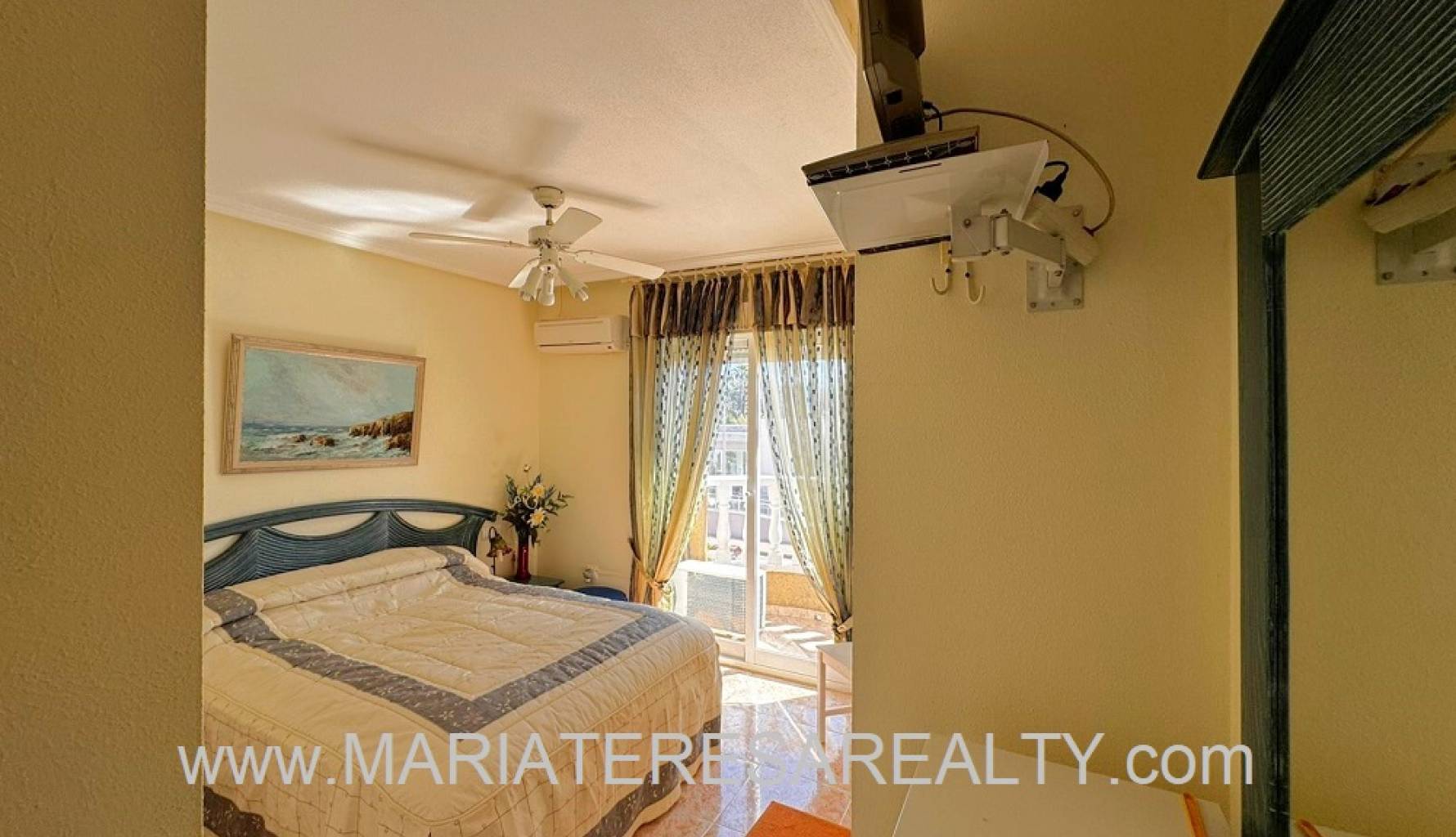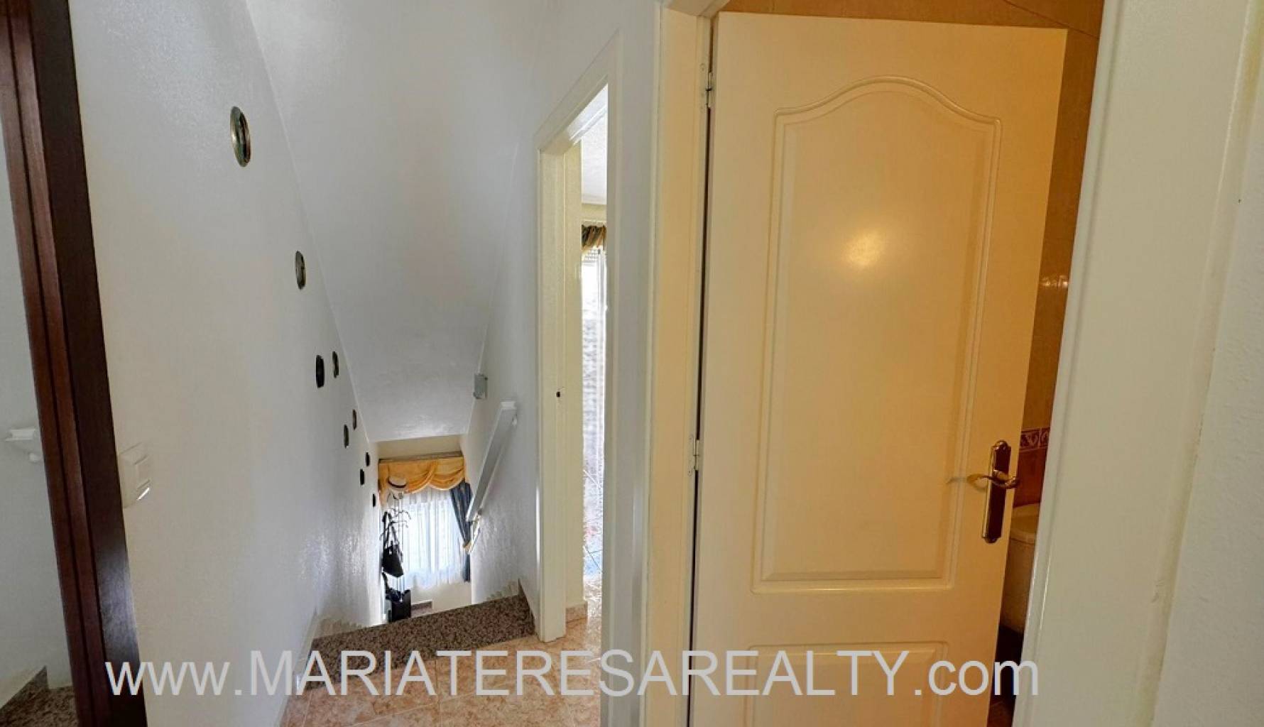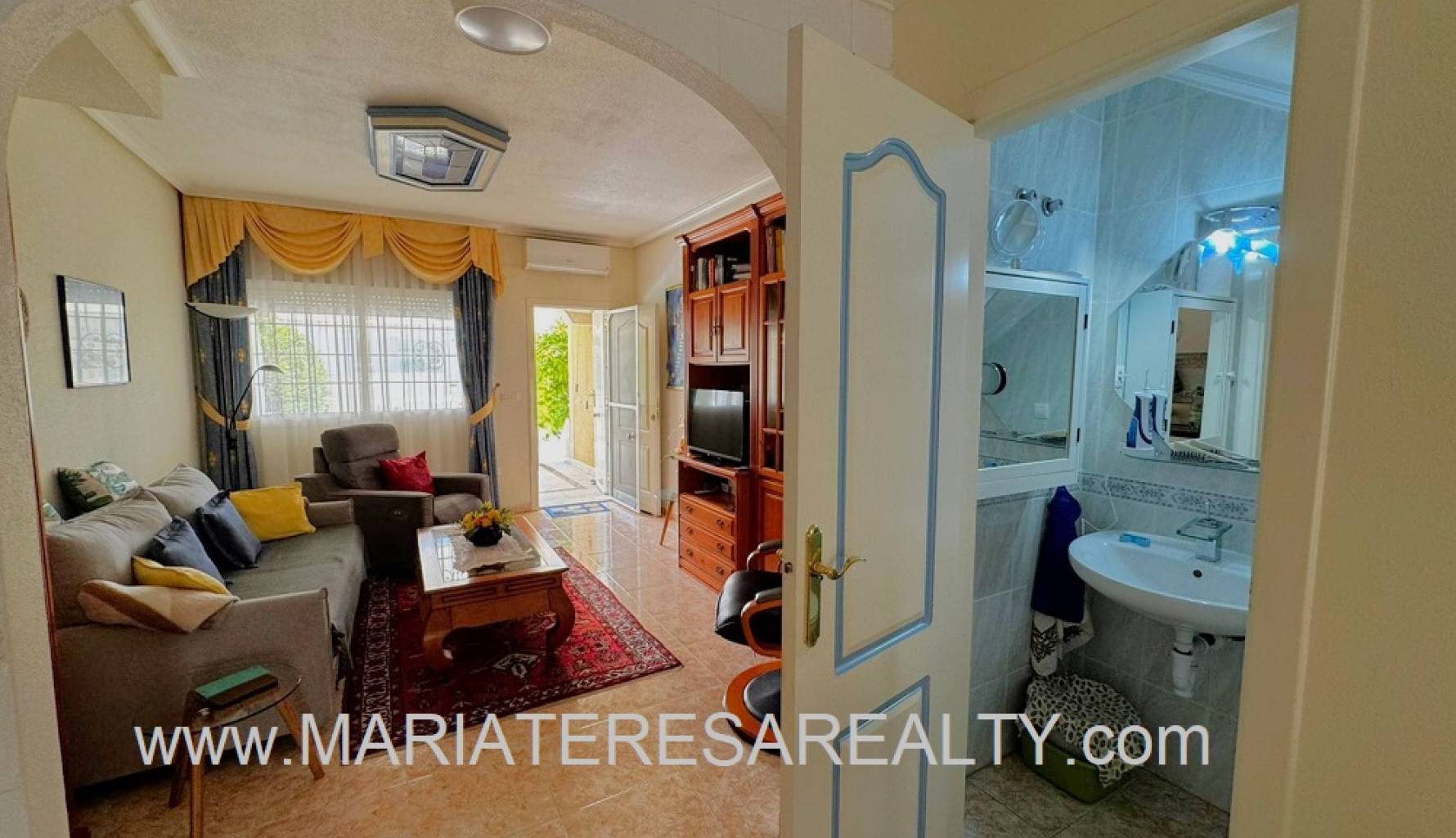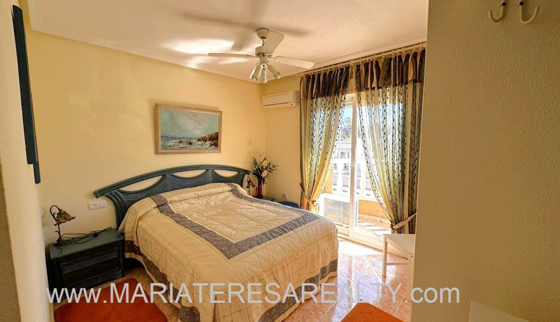 Wunderschöne Doppelhaushälfte mit privatem, nach Südosten ausgerichteten Garten, ideal zum Sonnenbaden und mit Markisen ausgestattet. Im 36 m² großen Erdgeschoss befindet sich ein geräumiges, komplett möbliertes Wohn-/Esszimmer mit Klimaanlage, angrenzend an eine voll ausgestattete offene Küche mit Granitarbeitsplatten. Außerdem gibt es ein Gäste-WC, einen kleinen Abstellraum unter der Treppe und Zugang zur hinteren Terrasse mit einem großen Abstellraum, der wiederum Zugang zum Gemeinschaftsbereich und zum Swimmingpool bietet. Im 40 m² großen Obergeschoss befinden sich ein großes Hauptschlafzimmer mit Einbauschrank, Klimaanlage und Zugang zu einem Balkon; ein Badezimmer mit Dusche; und ein zweites Schlafzimmer, das derzeit mit einem Schlafsofa, einem Einbauschrank und einer Klimaanlage ausgestattet ist. Von diesem zweiten Schlafzimmer aus gelangen Sie auf eine verglaste Terrasse mit Aluminiumverkleidung, die über eine Tür zur Treppe zum Solarium führt. Im Solarium stehen uns ca. 40 m² zur alleinigen privaten Nutzung zur Verfügung, die mit Solarpaneelen ausgestattet sind, sowie ein großer Abstellraum von ca. 6 m², in dem sich die Waschmaschine und der Warmwasserbereiter befinden.