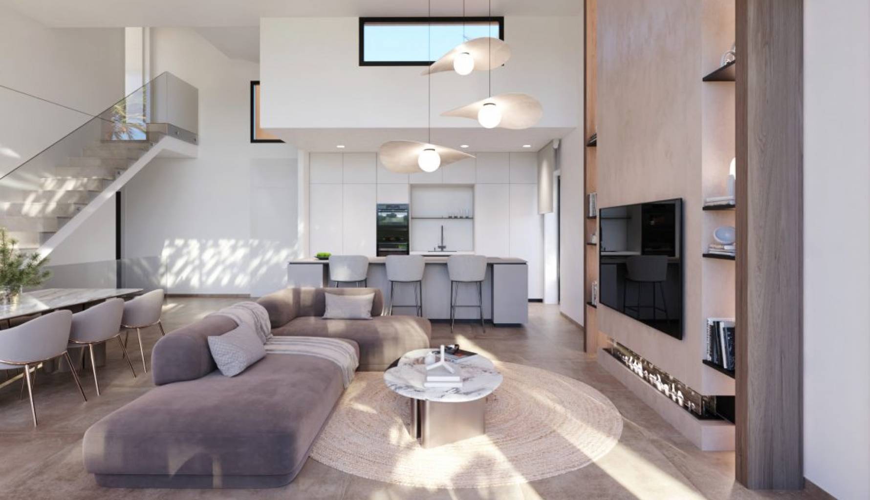 El interior de las villas está cuidadosamente diseñado para ofrecer confort y estilo. Los suelos de gres porcelánico aportan un toque moderno y son fáciles de mantener. Las cocinas están equipadas con electrodomésticos de alta calidad, facilitando la vida diaria. Los armarios empotrados en los dormitorios proporcionan un amplio espacio de almacenamiento, manteniendo el orden y la estética. La distribución de las villas, con opciones de 3 o 4 dormitorios y 3 a 5 baños, permite una personalización según las necesidades de cada familia.