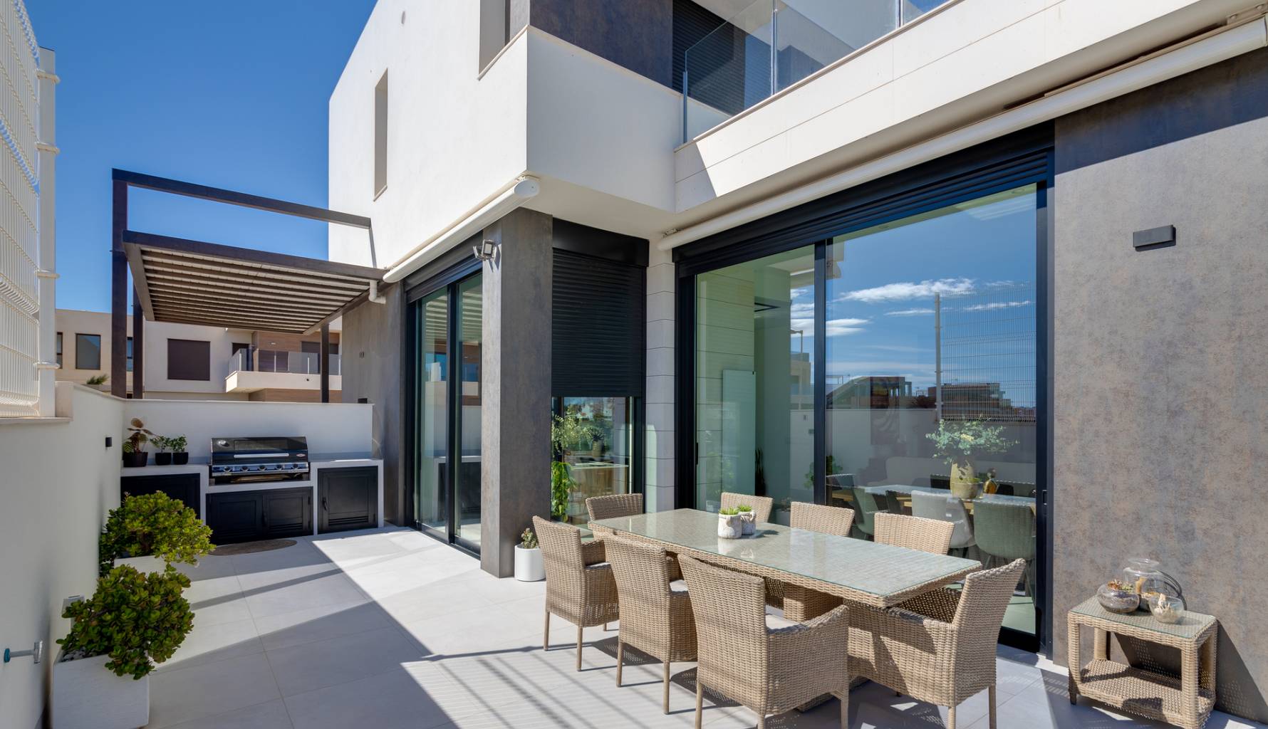 El diseño exterior de estas viviendas independientes en Pilar de la Horadada se centra en la integración con el entorno natural y la maximización del disfrute al aire libre. Cada propiedad cuenta con un jardín privado, ideal para crear un oasis personal donde relajarse o disfrutar de actividades al aire libre. Además, las terrazas amplias ofrecen un espacio adicional para el entretenimiento o simplemente para disfrutar del clima mediterráneo. Una de las características más destacadas es la piscina privada, que proporciona un lugar perfecto para refrescarse durante los cálidos días de verano. La presencia de una pérgola añade un toque de elegancia y funcionalidad, permitiendo disfrutar de las áreas exteriores con sombra y comodidad. Estas características exteriores no solo mejoran la estética de las viviendas, sino que también aumentan su funcionalidad y atractivo.