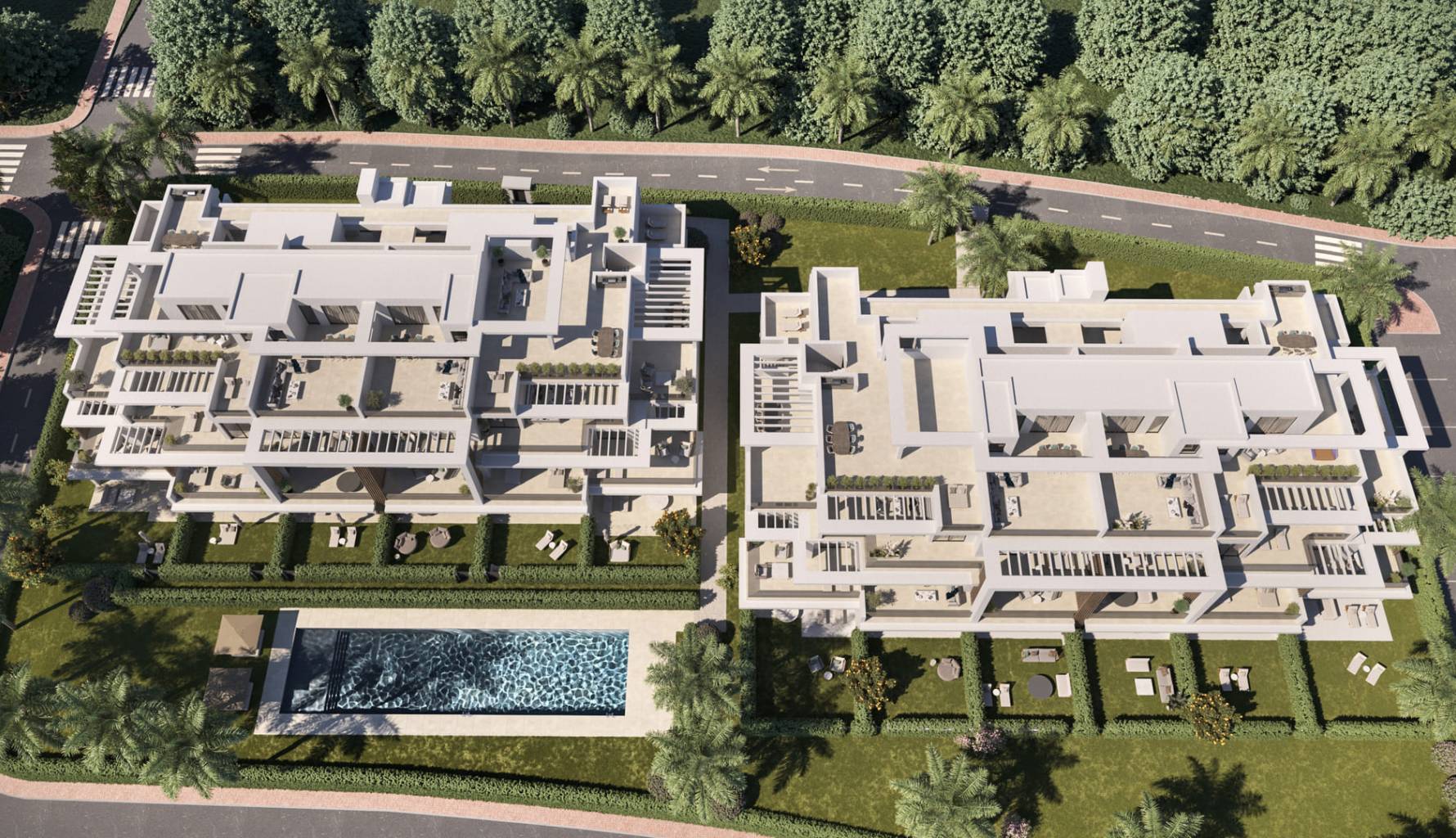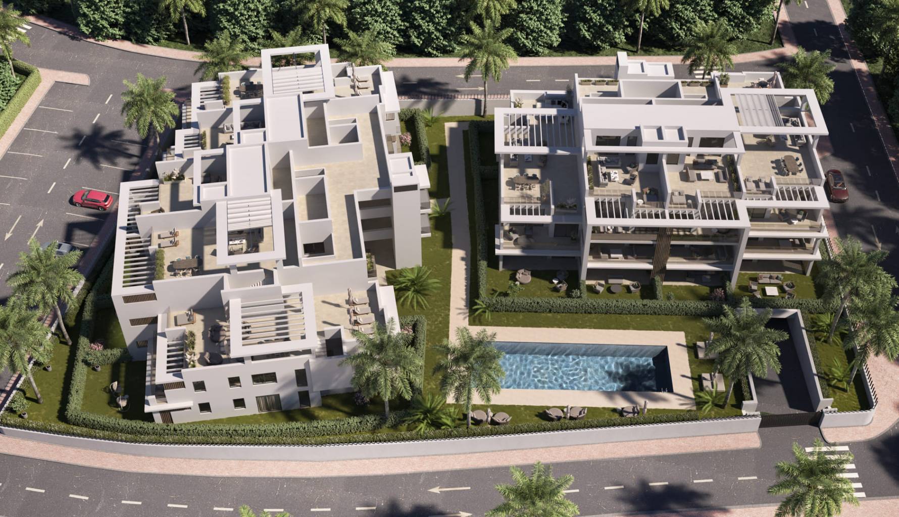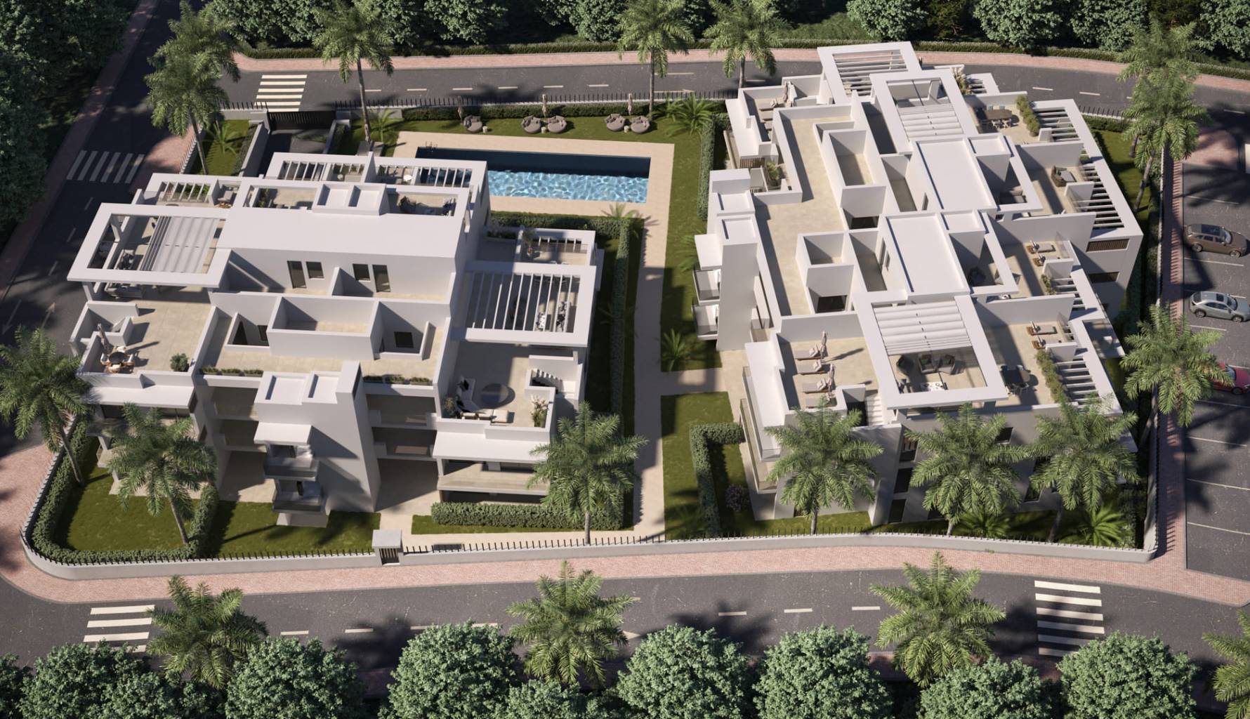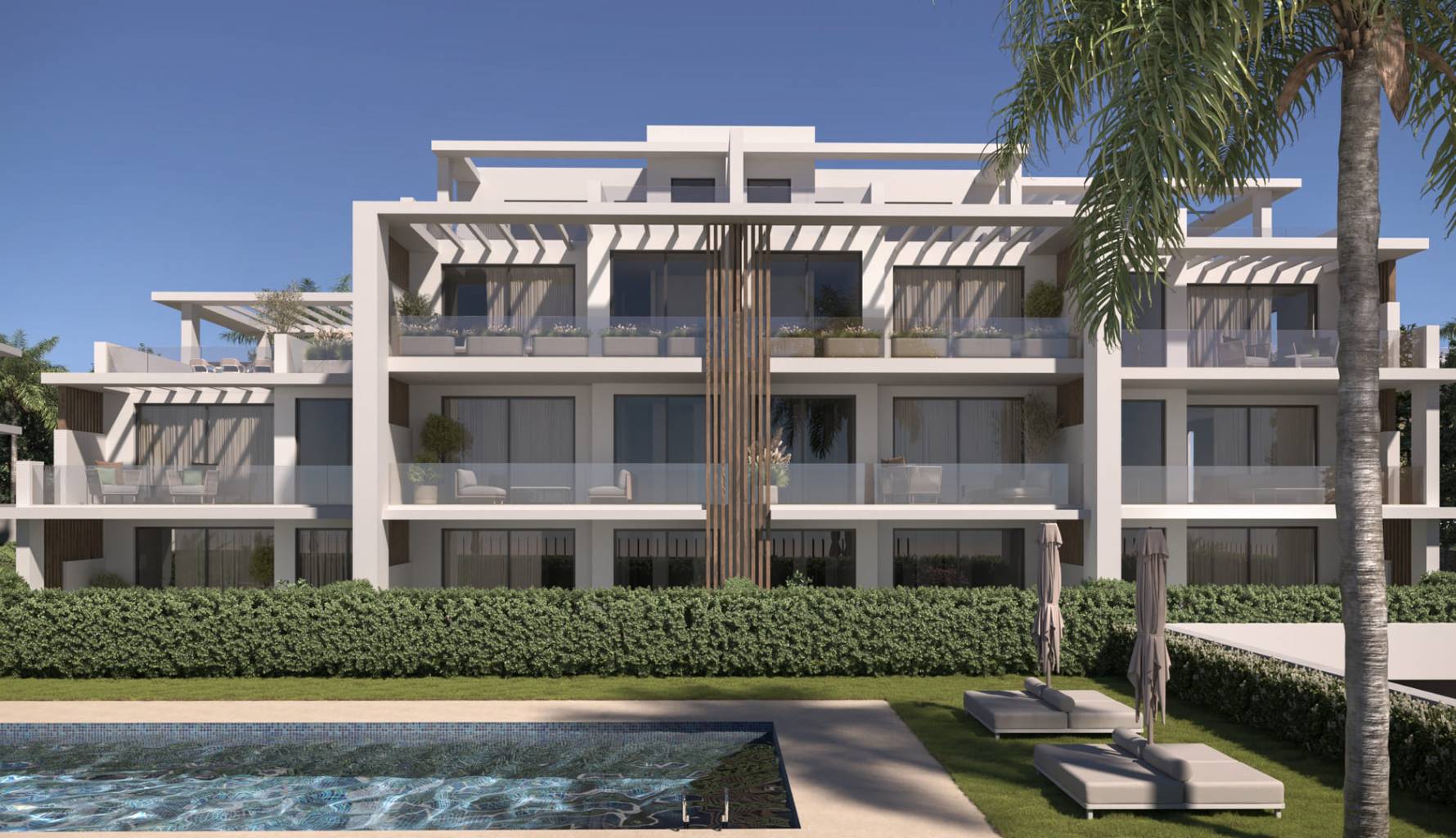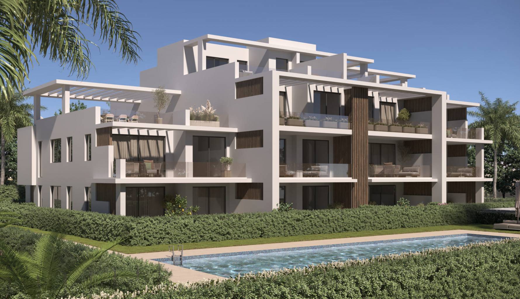 Los exteriores de este residencial en Estepona están pensados para maximizar el disfrute del clima mediterráneo. Las propiedades incluyen terrazas privadas, perfectas para disfrutar de las vistas al mar y el aire fresco. Además, algunas viviendas cuentan con solárium, proporcionando un espacio adicional para el relax y el entretenimiento al aire libre. Los jardines privados, disponibles en ciertas tipologías, ofrecen un oasis de tranquilidad y un espacio ideal para actividades al aire libre. El diseño exterior se complementa con materiales de alta calidad, como el suelo de porcelana, que garantiza durabilidad y estilo.
