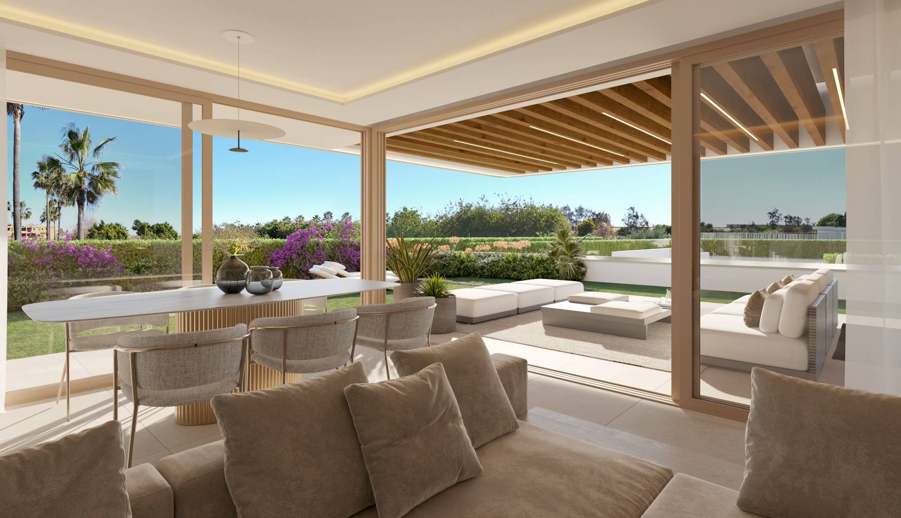 Las propiedades, disponibles en configuraciones de dos y tres dormitorios con dos o tres baños, están diseñadas para ofrecer un espacio interior funcional y elegante. La distribución incluye garaje privado y amplias terrazas, proporcionando un equilibrio perfecto entre comodidad y estilo. Los interiores están equipados con electrodomésticos de última generación, aire acondicionado para el confort en todas las estaciones, calefacción por suelo radiante para los meses más fríos y armarios empotrados que optimizan el espacio de almacenamiento.