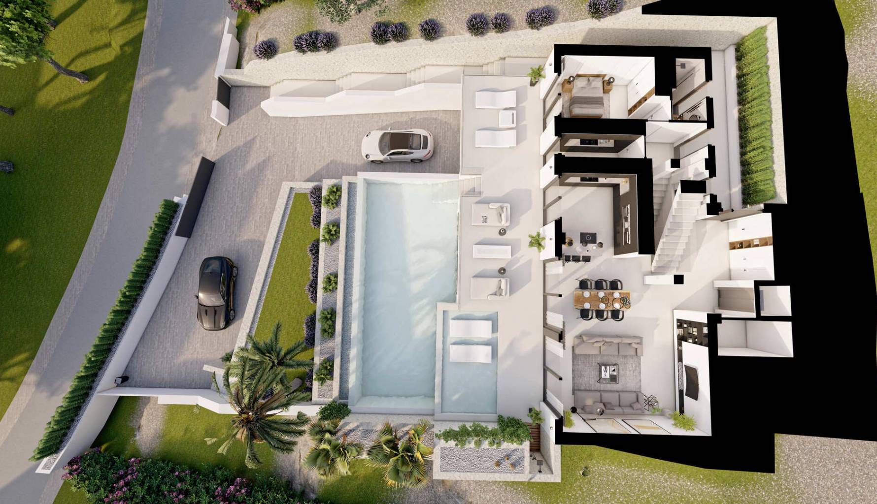 El exterior de la villa está diseñado para maximizar el disfrute del clima mediterráneo. Cuenta con un jardín privado que ofrece un espacio verde para relajarse o disfrutar de actividades al aire libre. La terraza es perfecta para cenas al aire libre o simplemente para disfrutar de las vistas al mar. Además, la villa dispone de un solárium, un espacio ideal para tomar el sol en total privacidad. La presencia de una piscina privada añade un toque de lujo, permitiendo refrescarse en los días más calurosos y disfrutar de momentos de ocio en familia o con amigos.