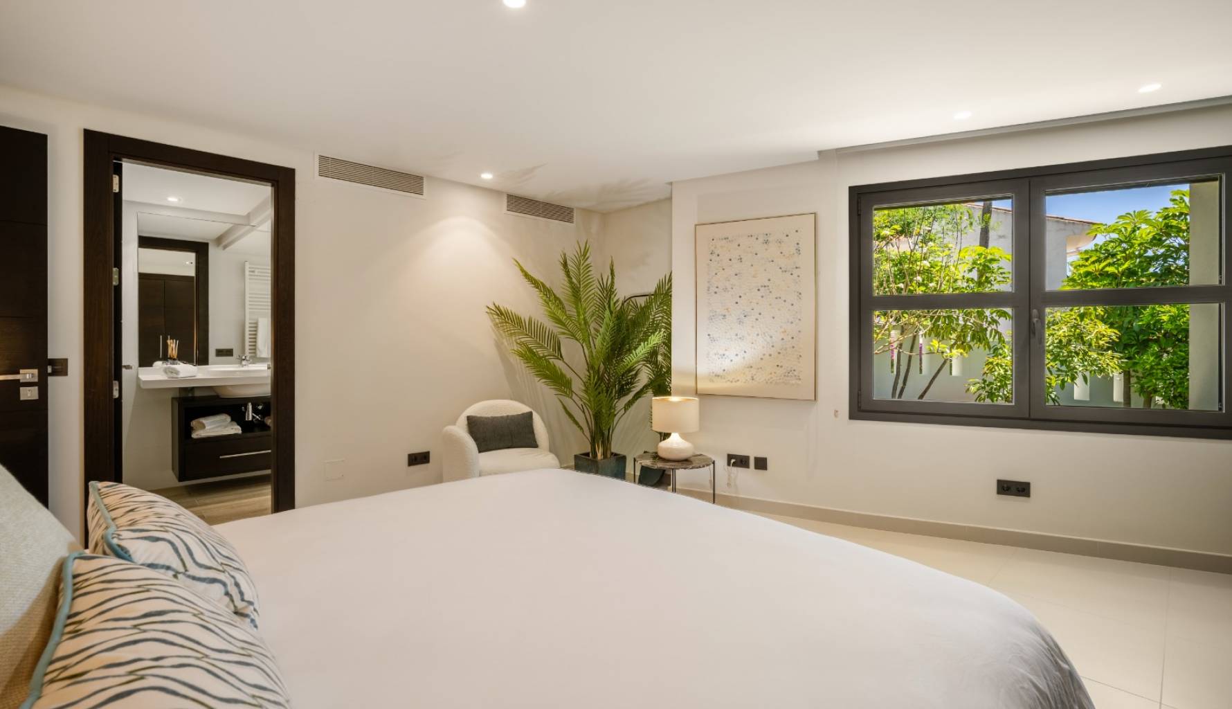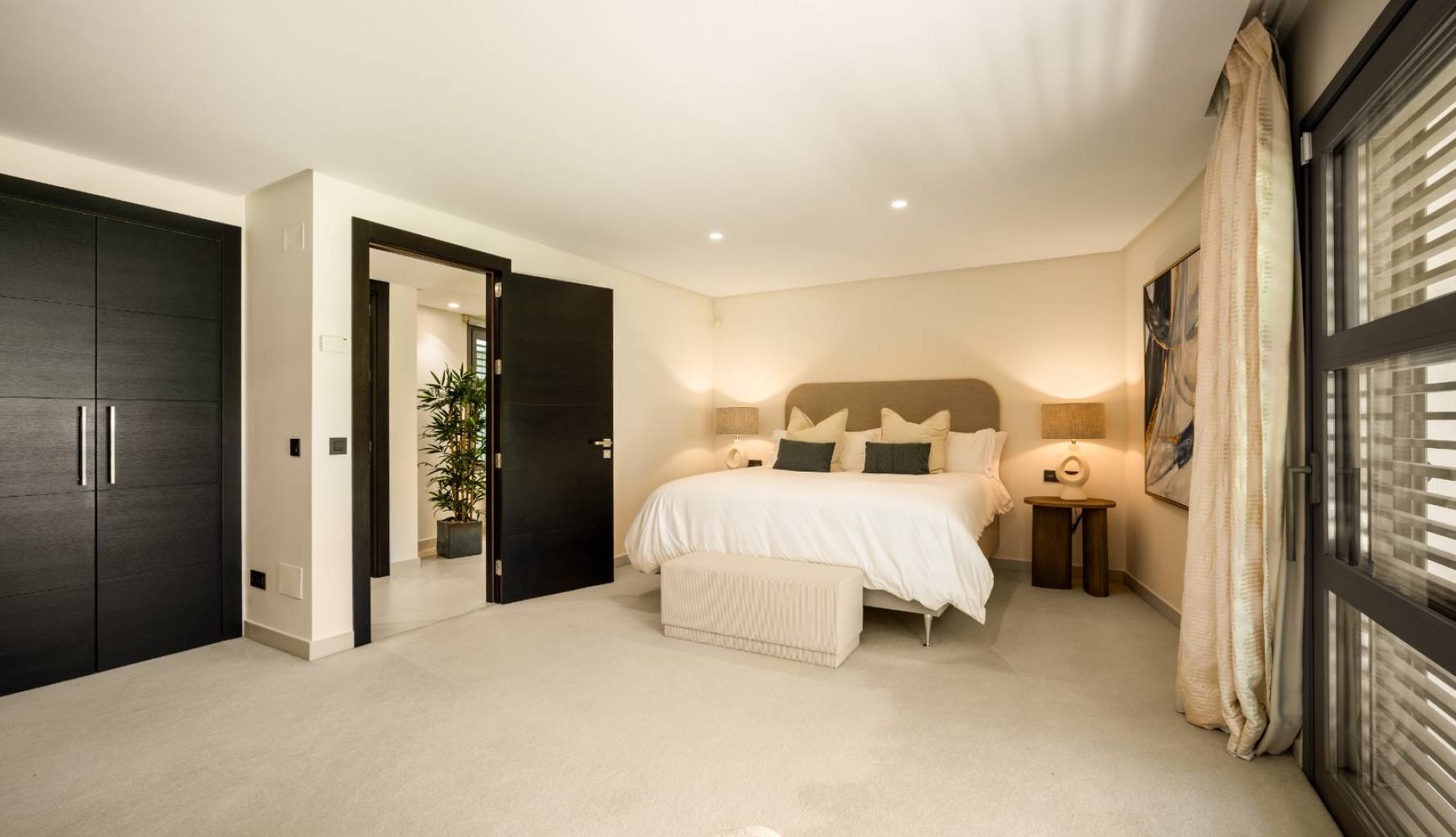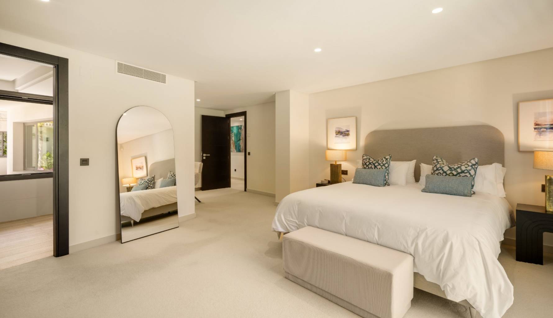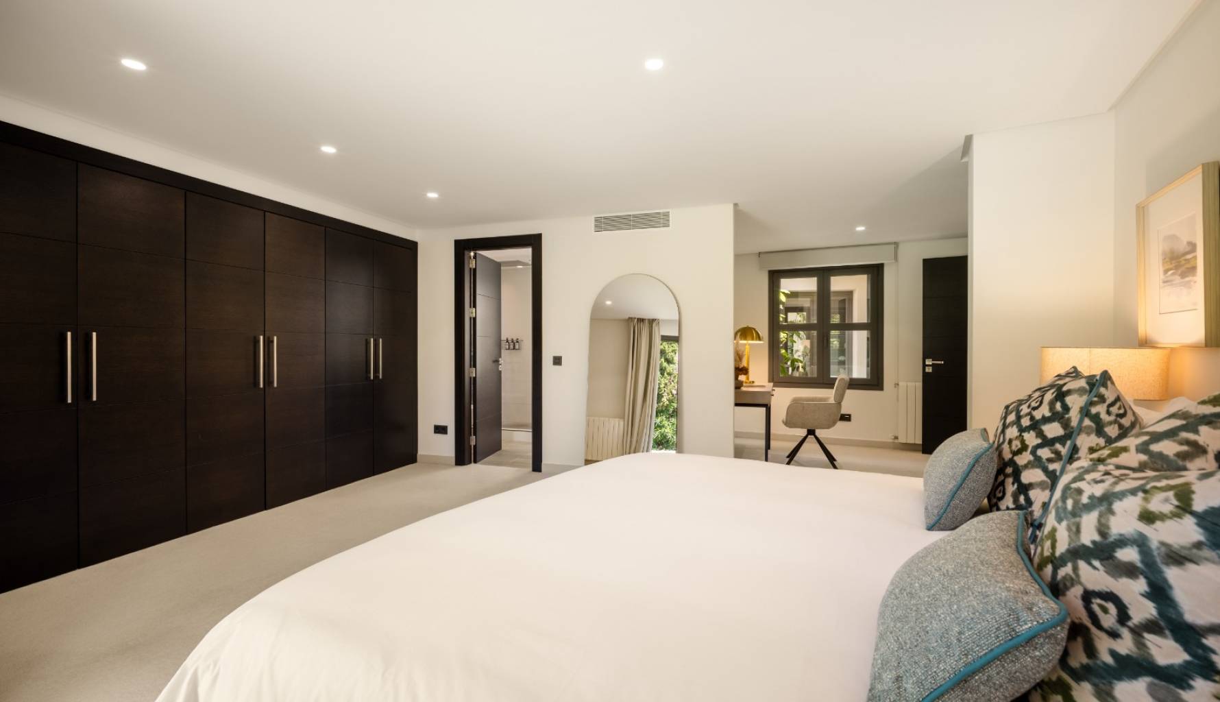 El interior de la villa está cuidadosamente diseñado para ofrecer el máximo confort y funcionalidad. Con un total de 5 dormitorios y 5 baños, cada espacio está pensado para proporcionar privacidad y comodidad. Los armarios empotrados en las habitaciones ofrecen un almacenamiento eficiente y elegante. La distribución incluye un garaje, asegurando espacio para vehículos y almacenamiento adicional. Cada detalle del interior refleja un compromiso con la calidad y el estilo, creando un ambiente acogedor y sofisticado.