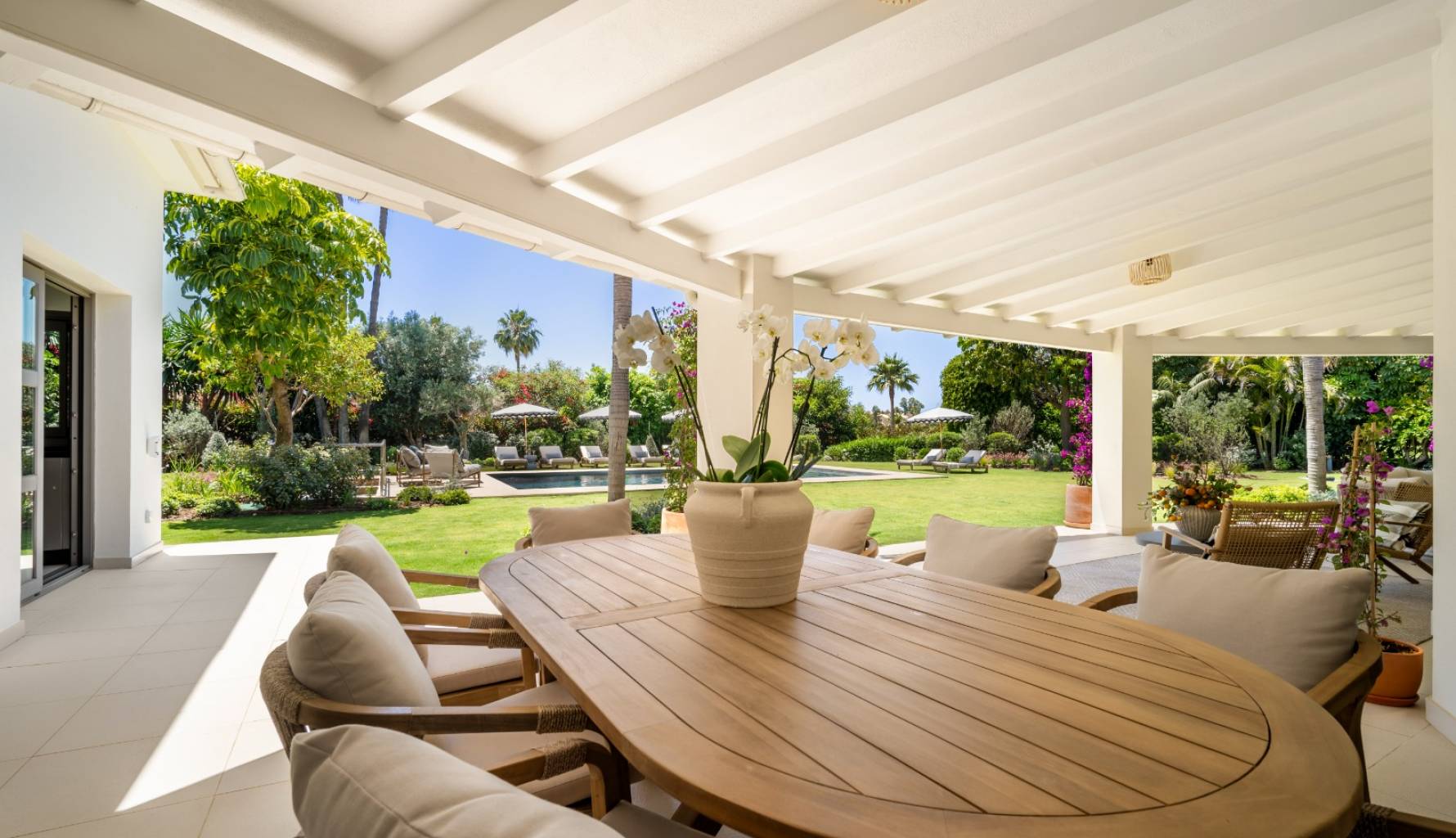 Los exteriores de la villa están diseñados para maximizar el disfrute del clima mediterráneo. Cuenta con un amplio jardín privado, perfecto para relajarse o para actividades al aire libre. La terraza es un espacio ideal para disfrutar de cenas al aire libre o simplemente contemplar las vistas. Además, la villa dispone de una piscina privada, ofreciendo un oasis de frescura y diversión durante los cálidos días de verano. La cercanía al mar, a solo 1 km, permite disfrutar de paseos costeros y actividades acuáticas.