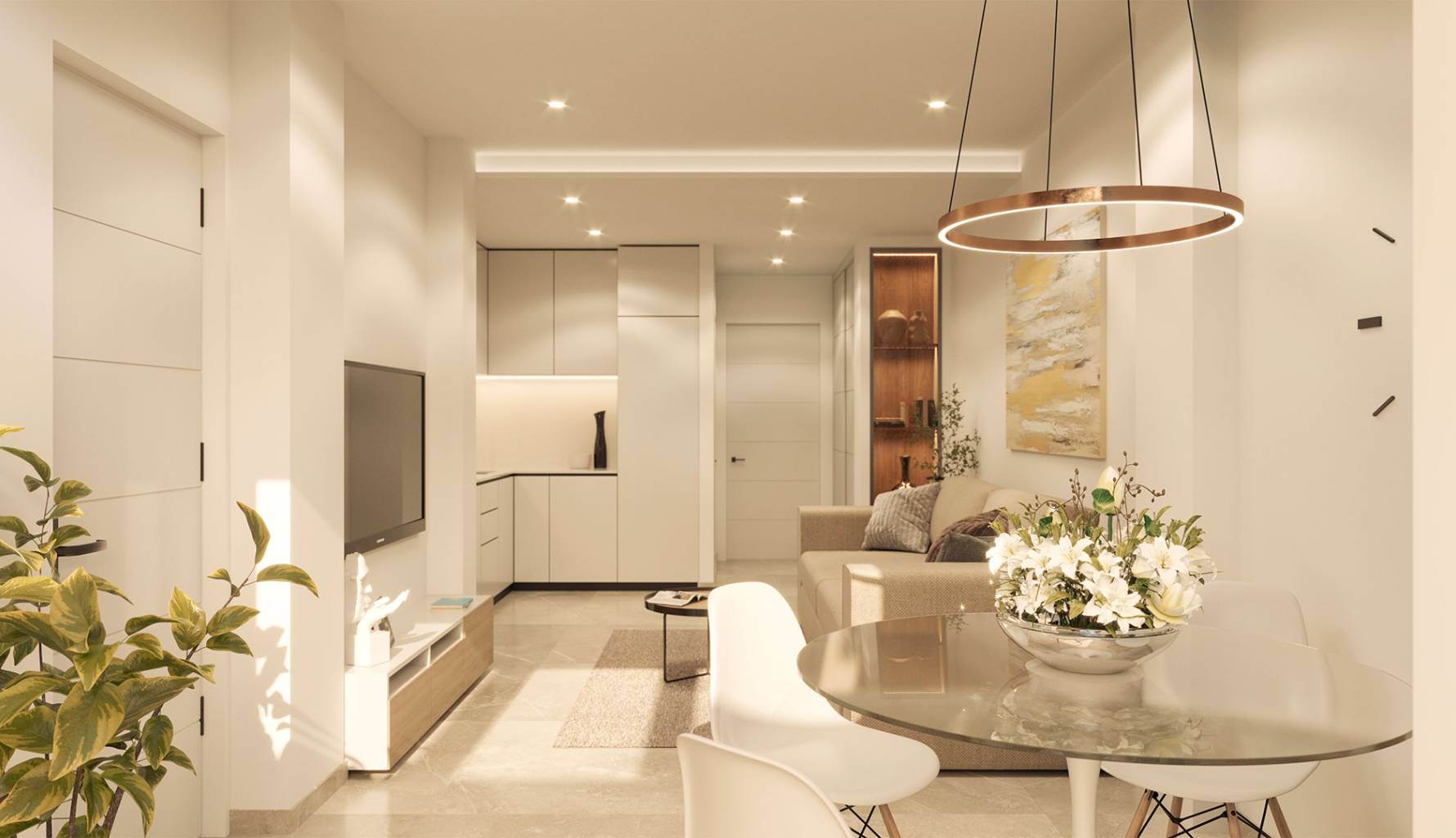 Los interiores de los apartamentos y áticos han sido diseñados con atención al detalle, ofreciendo un ambiente moderno y acogedor. Los suelos de gres porcelánico aportan un toque de elegancia y durabilidad a cada espacio. La comodidad está garantizada con la preinstalación de aire acondicionado, asegurando un ambiente agradable durante todo el año. Las cocinas están equipadas con electrodomésticos de alta calidad, facilitando el día a día. Los armarios empotrados ofrecen un almacenamiento eficiente y discreto. Además, cada propiedad cuenta con un sistema de videoportero, proporcionando seguridad y tranquilidad a los residentes. Las opciones de distribución incluyen propiedades de 1 o 2 dormitorios y 1 o 2 baños, adaptándose a diferentes necesidades y preferencias. Las terrazas privadas son un espacio adicional para disfrutar del aire libre y las vistas.