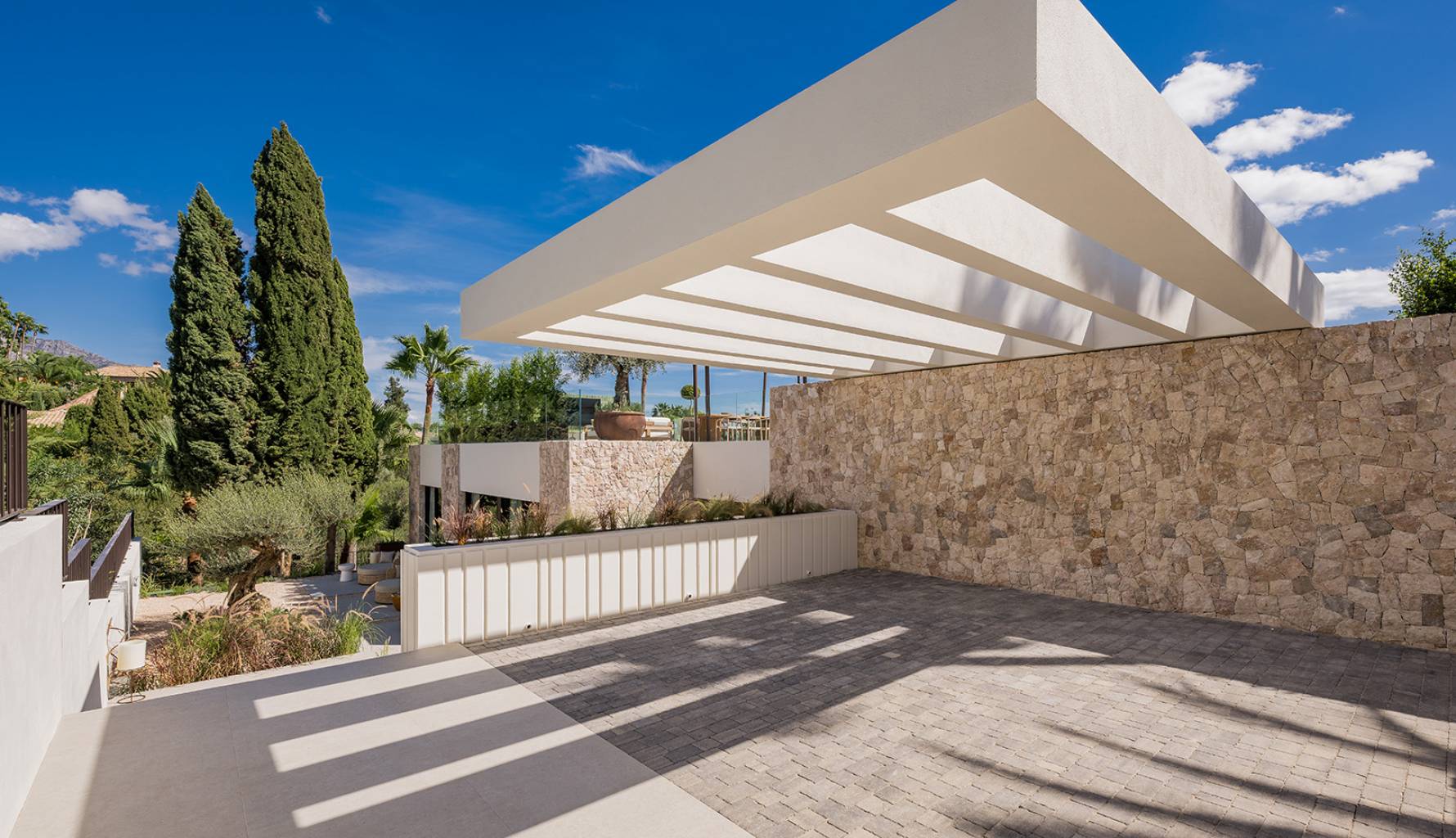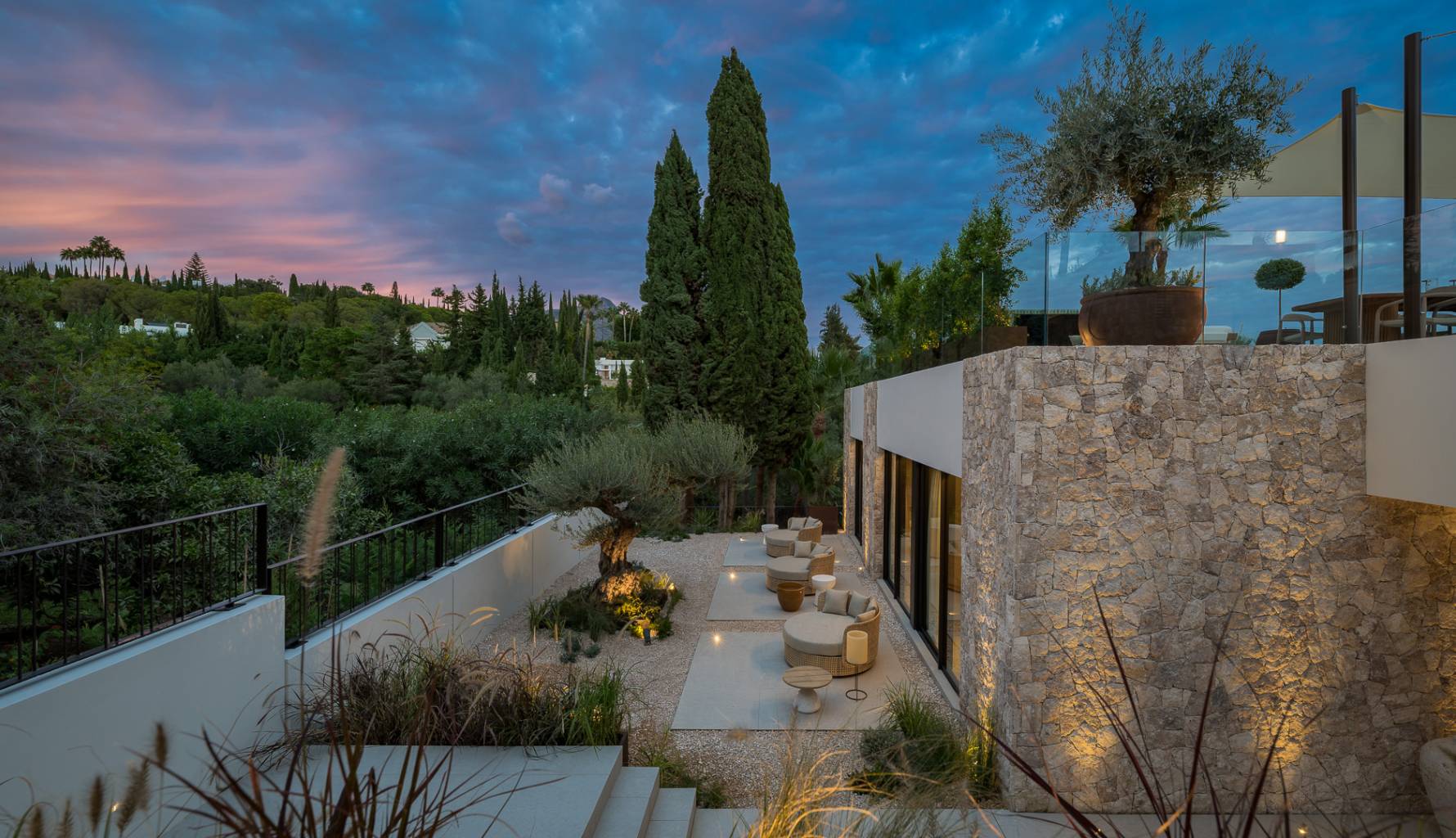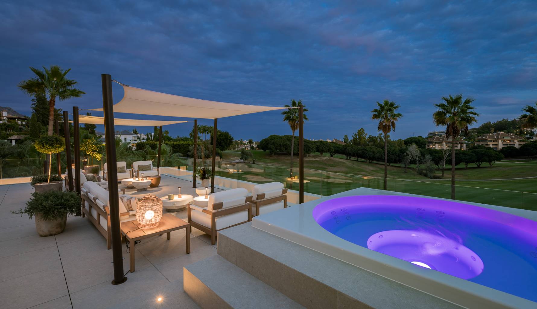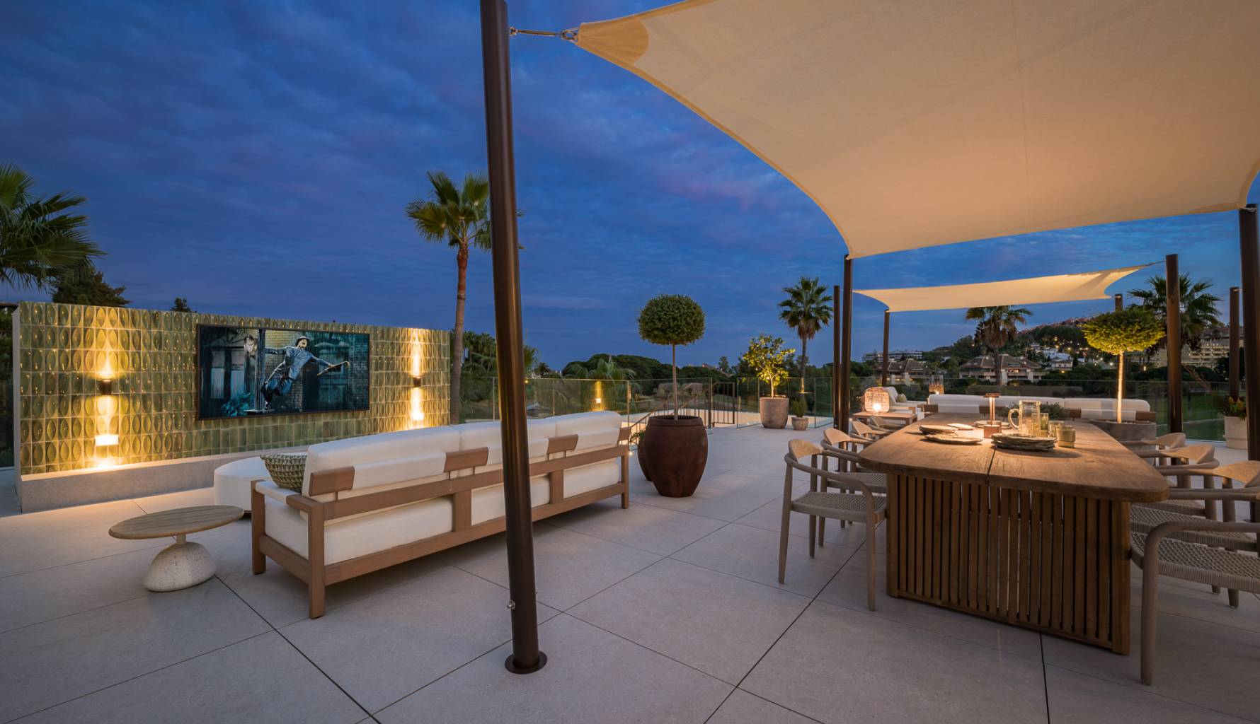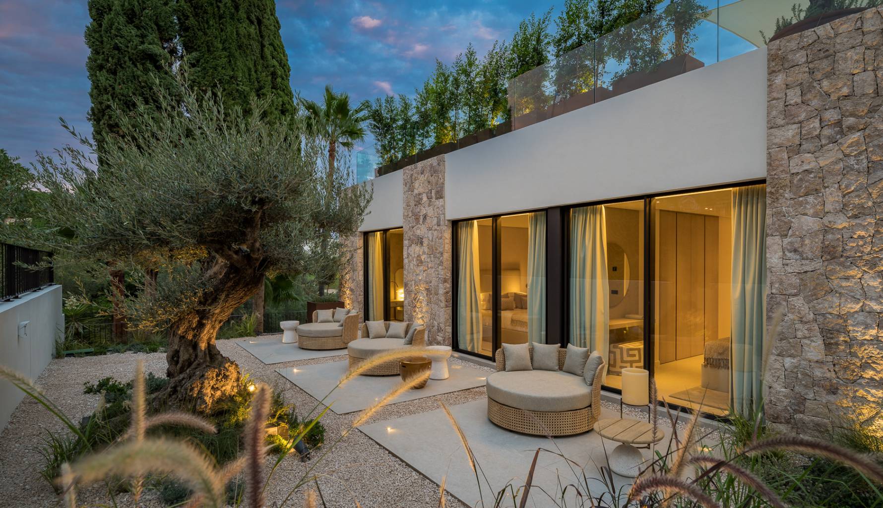 El exterior de la villa está diseñado para maximizar el disfrute del clima mediterráneo. Cuenta con un jardín privado que proporciona un oasis de tranquilidad y belleza natural. La piscina privada es perfecta para refrescarse durante los cálidos días de verano, mientras que el jacuzzi ofrece un espacio de relajación adicional. La terraza, equipada con una pérgola, es ideal para disfrutar de comidas al aire libre o simplemente relajarse mientras se contempla el entorno. Además, el solárium ofrece vistas panorámicas, convirtiéndose en un lugar privilegiado para disfrutar del atardecer.