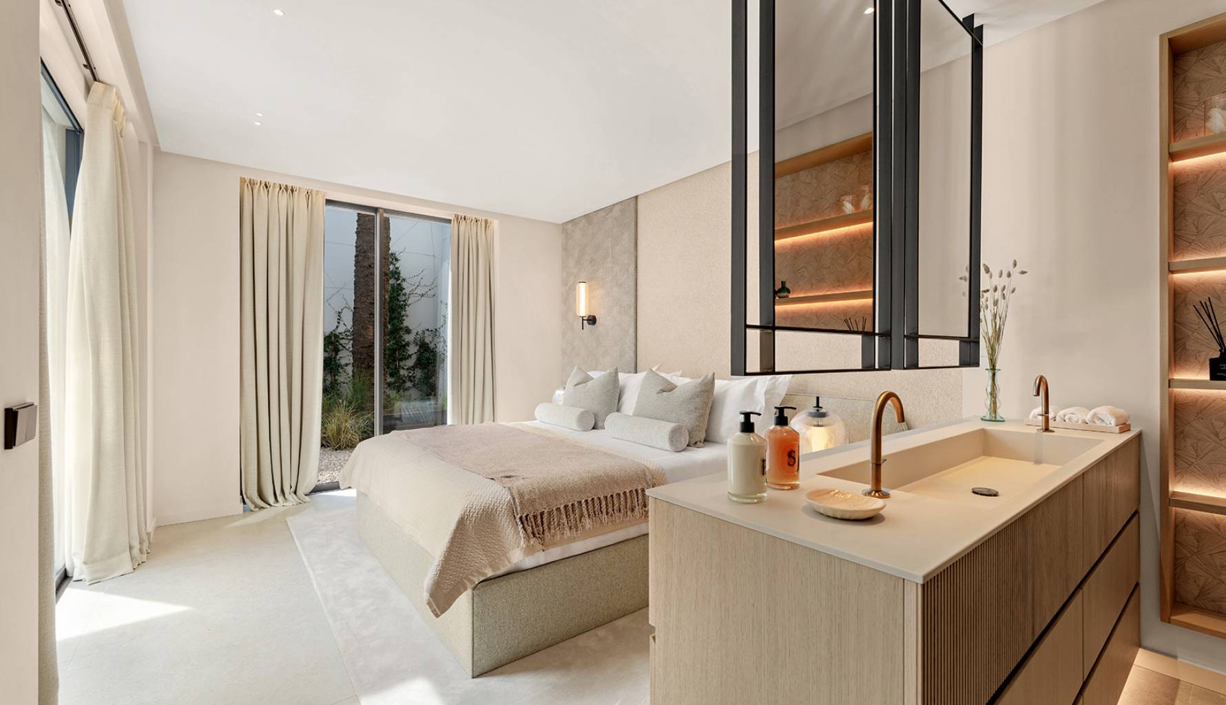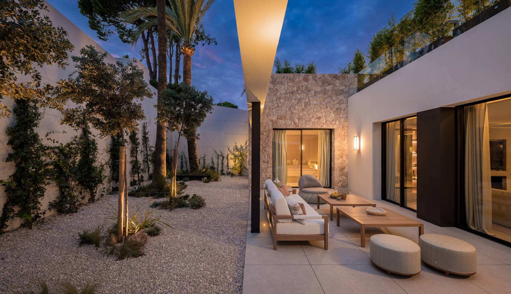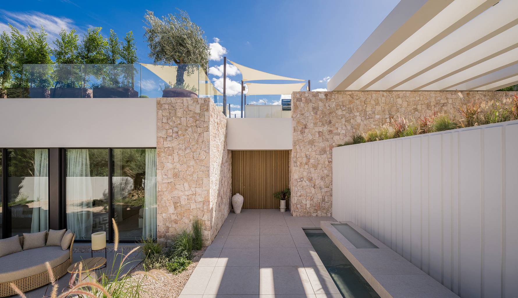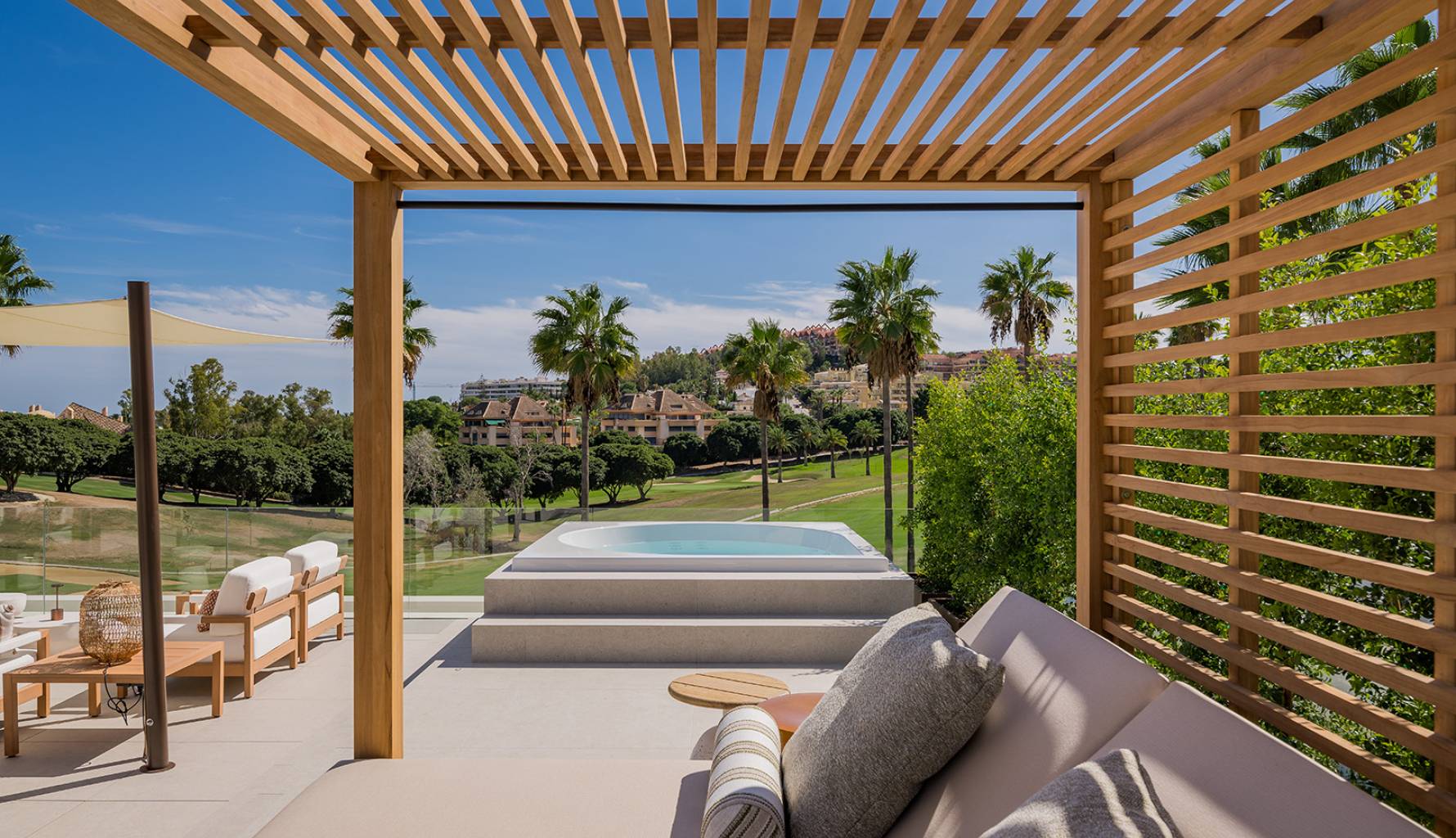 El exterior de la villa está diseñado para maximizar el disfrute del clima mediterráneo. Cuenta con un jardín privado que proporciona un oasis de tranquilidad y belleza natural. La piscina privada es perfecta para refrescarse durante los cálidos días de verano, mientras que el jacuzzi ofrece un espacio de relajación adicional. La terraza, equipada con una pérgola, es ideal para disfrutar de comidas al aire libre o simplemente relajarse mientras se contempla el entorno. Además, el solárium ofrece vistas panorámicas, convirtiéndose en un lugar privilegiado para disfrutar del atardecer.