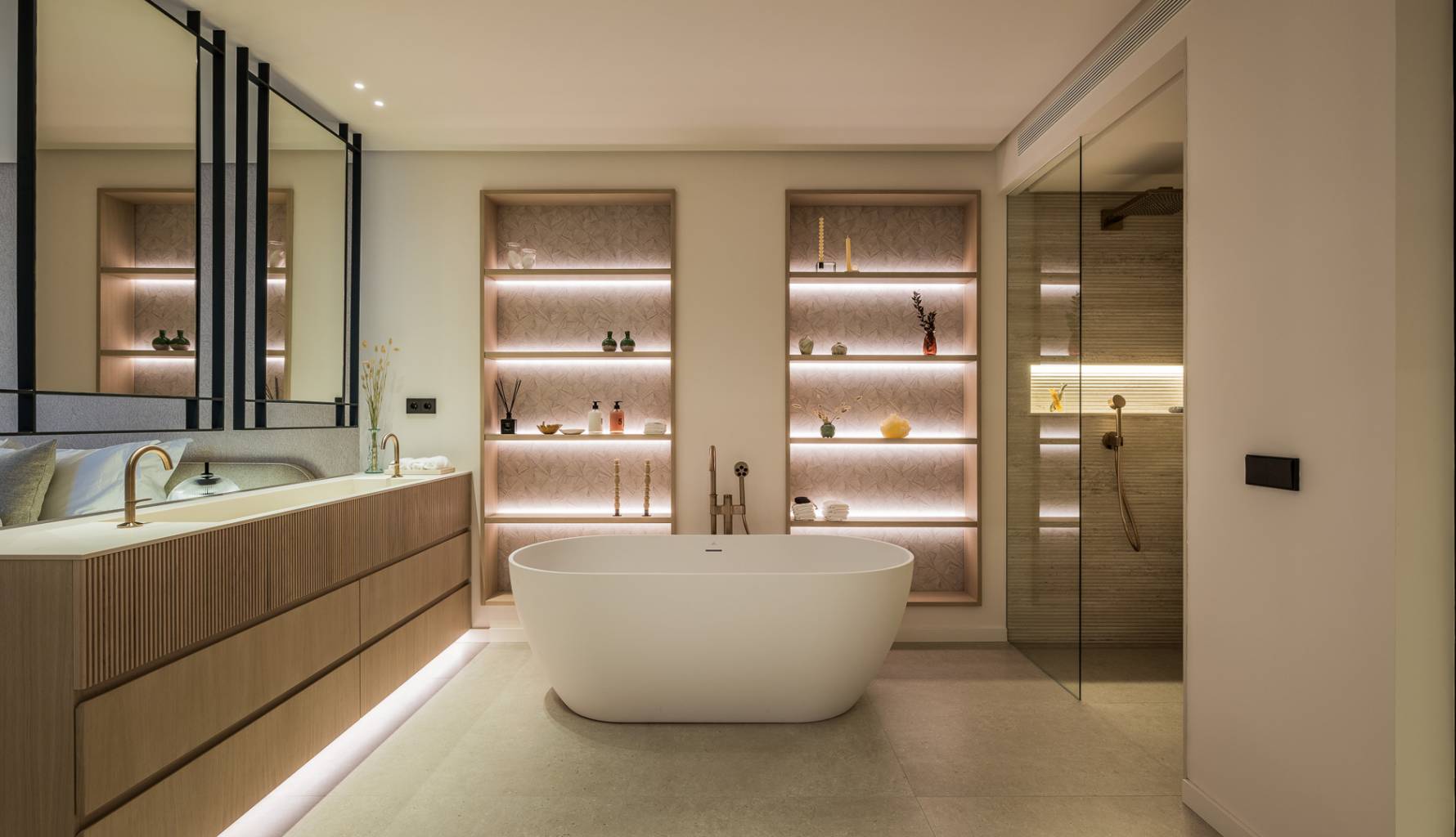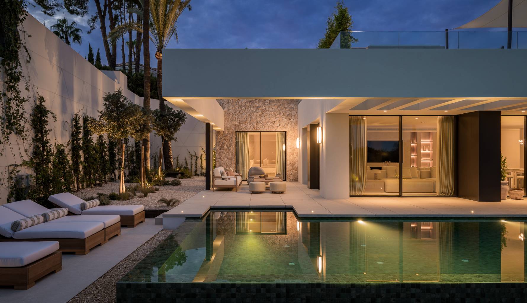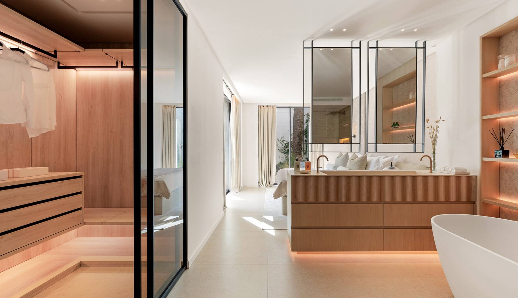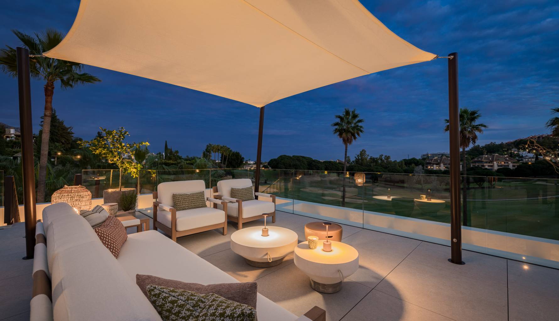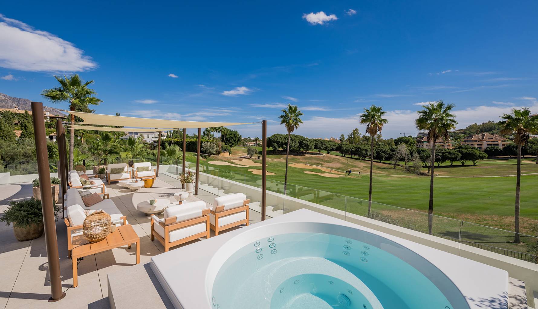 El exterior de la villa está diseñado para maximizar el disfrute del clima mediterráneo. Cuenta con un jardín privado que proporciona un oasis de tranquilidad y belleza natural. La piscina privada es perfecta para refrescarse durante los cálidos días de verano, mientras que el jacuzzi ofrece un espacio de relajación adicional. La terraza, equipada con una pérgola, es ideal para disfrutar de comidas al aire libre o simplemente relajarse mientras se contempla el entorno. Además, el solárium ofrece vistas panorámicas, convirtiéndose en un lugar privilegiado para disfrutar del atardecer.