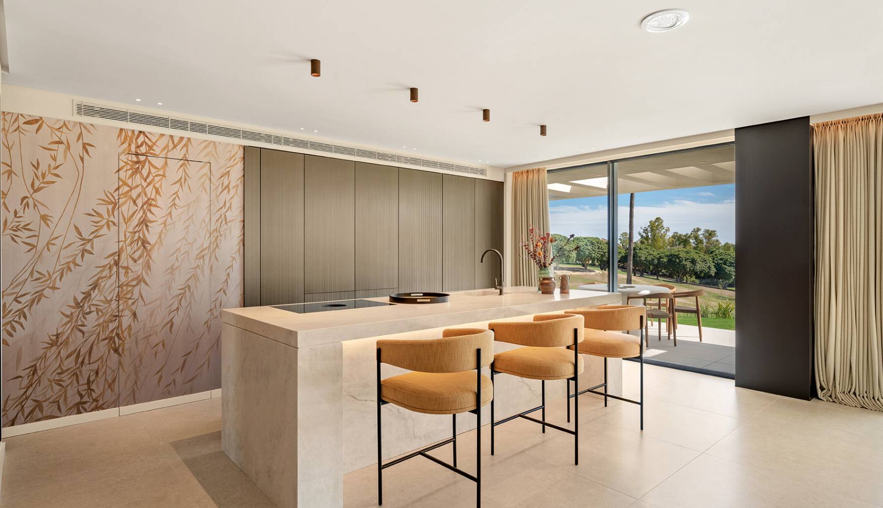 El interior de la villa está diseñado con un enfoque en el confort y la funcionalidad. Los suelos de gres porcelánico aportan un toque de elegancia y son fáciles de mantener. La villa está equipada con aire acondicionado, asegurando un ambiente agradable durante todo el año. Los armarios empotrados ofrecen un amplio espacio de almacenamiento, manteniendo el orden y la organización. La distribución incluye un garaje, proporcionando comodidad y seguridad para los vehículos. Cada uno de los cuatro dormitorios está diseñado para ofrecer privacidad y confort, mientras que los cinco baños aseguran que cada miembro de la familia tenga su propio espacio.