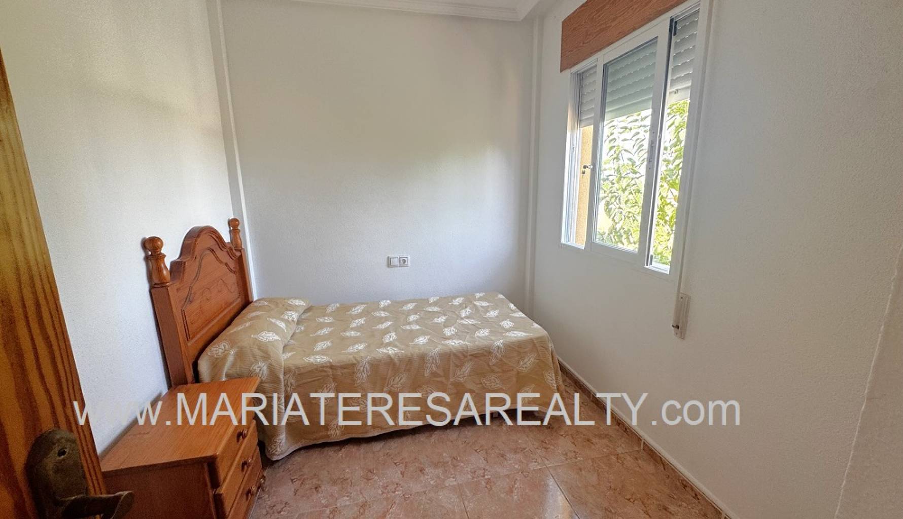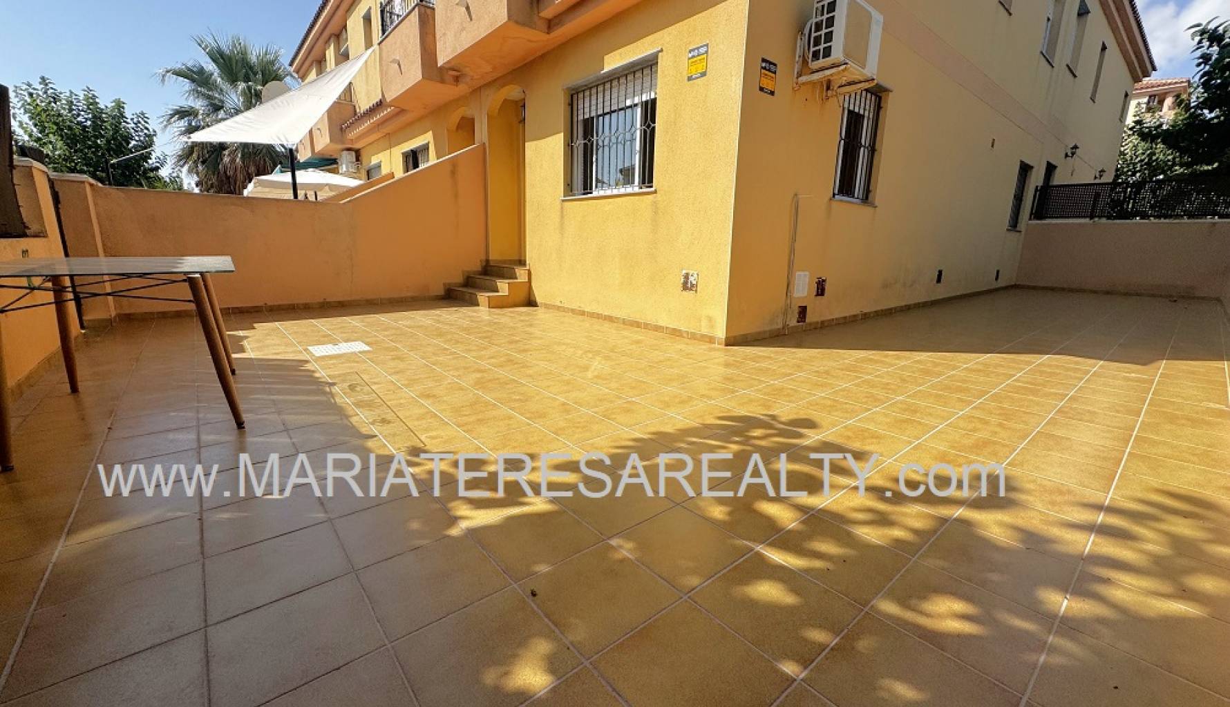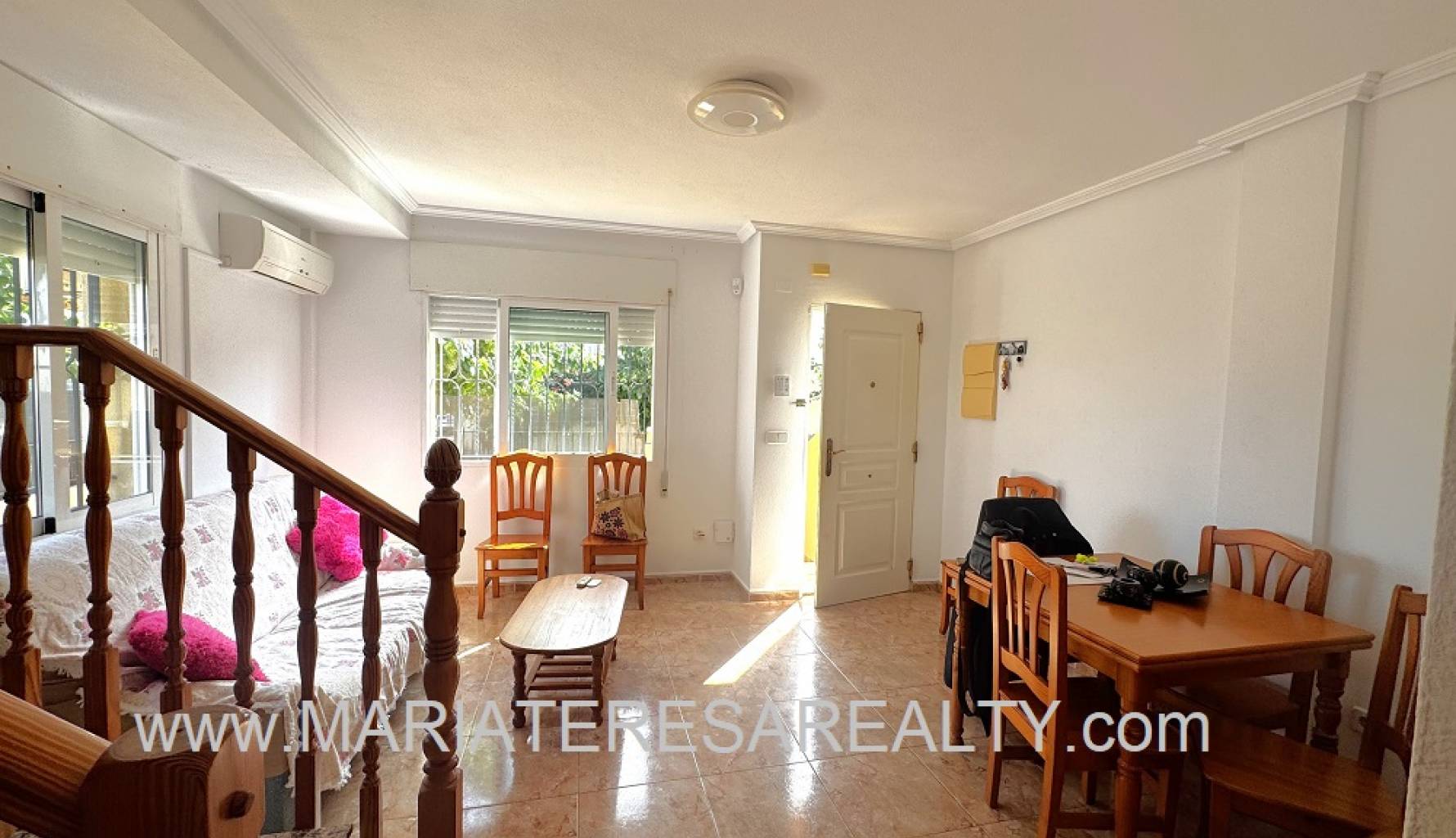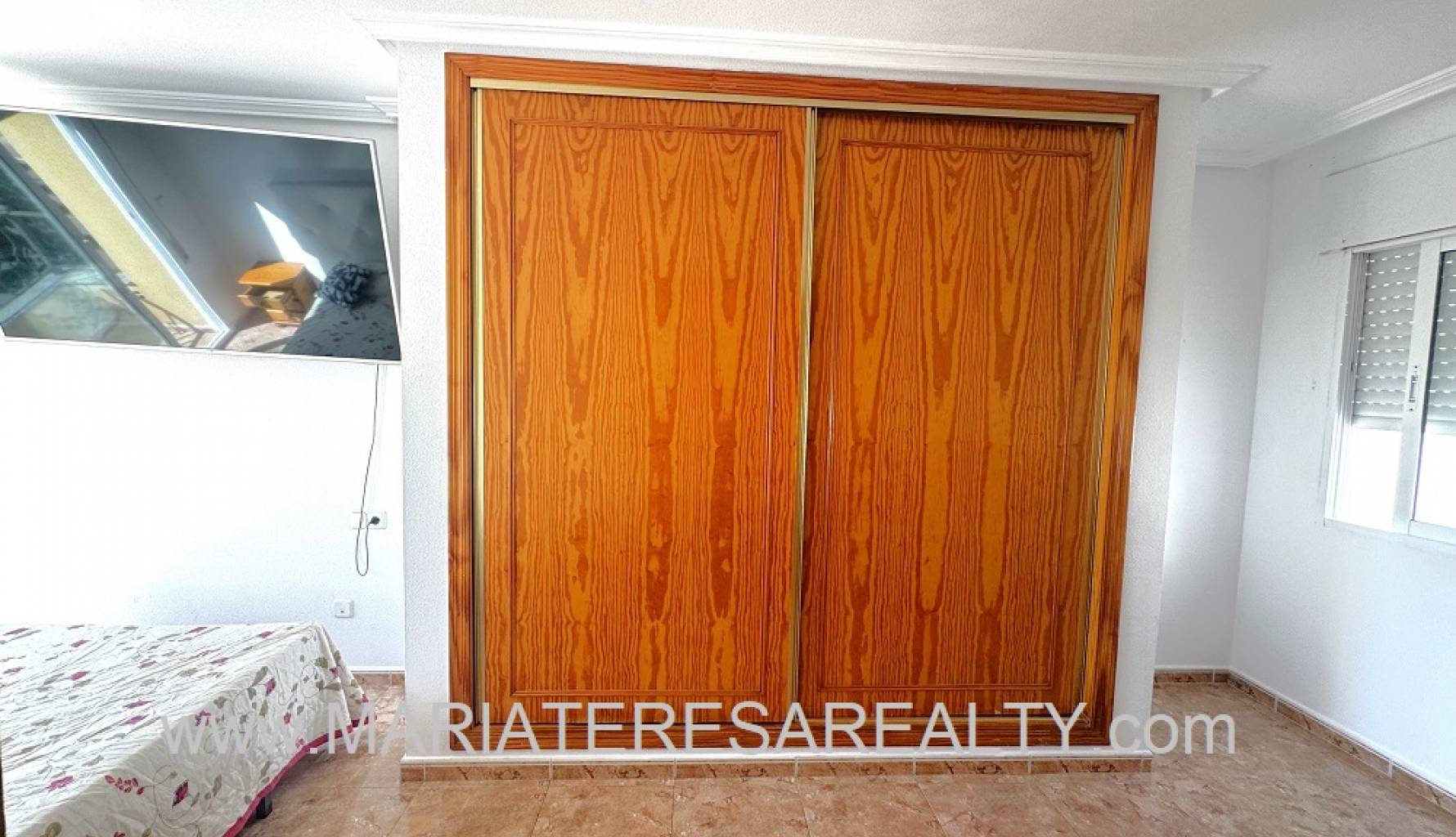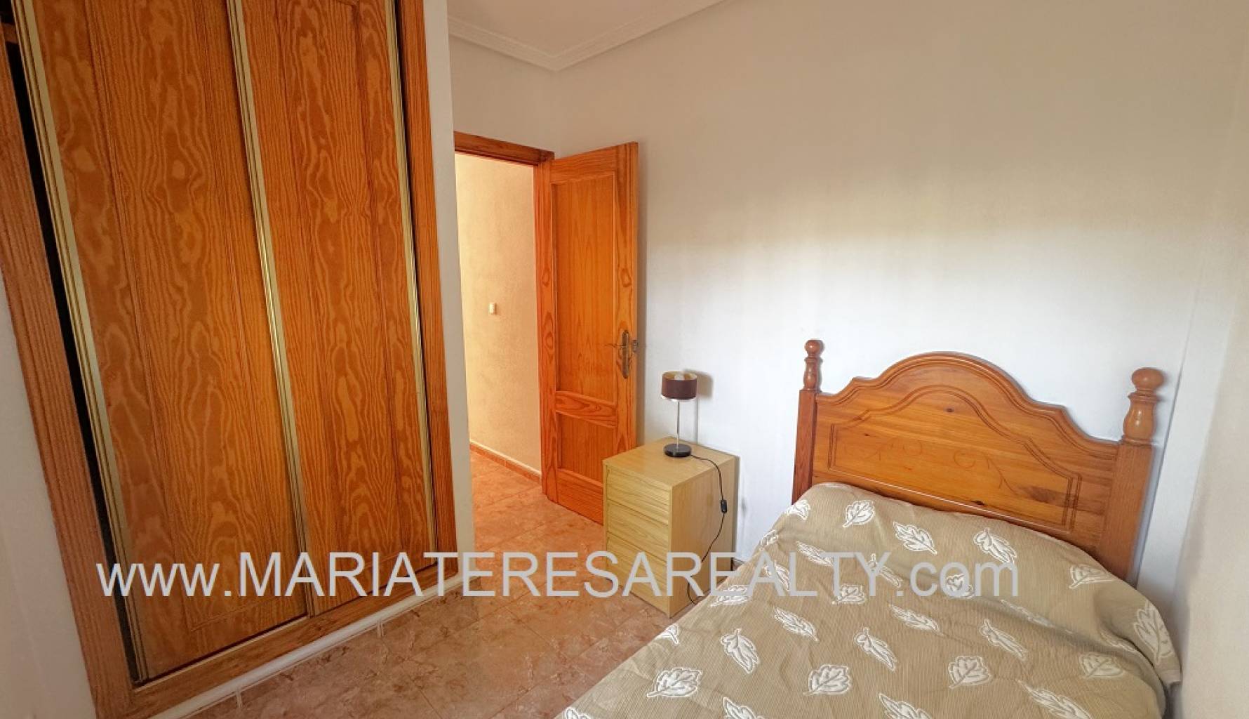 Precioso dúplex en esquina con jardín propio en los Narejos, Los Alcázares, Murcia. Al entrar a este dúplex tenemos un amplio y luminoso saló/comedor que a su vez da a un pasillo donde nos encontramos con la cocina independiente completamente equipada que a su vez da salida a un patio semi cubierto, siguiendo el pasillo tenemos un dormitorio con armario empotrado y un cuarto de baño equipado con ducha. Subiendo la escalera que se encuentra en el salón/comedor nos encontramos con un dormitorio con armario empotrado, un amplio cuarto de baño equipado con bañera y un amplio dormitorio con un gran armario empotrado y con salida a una terraza.
