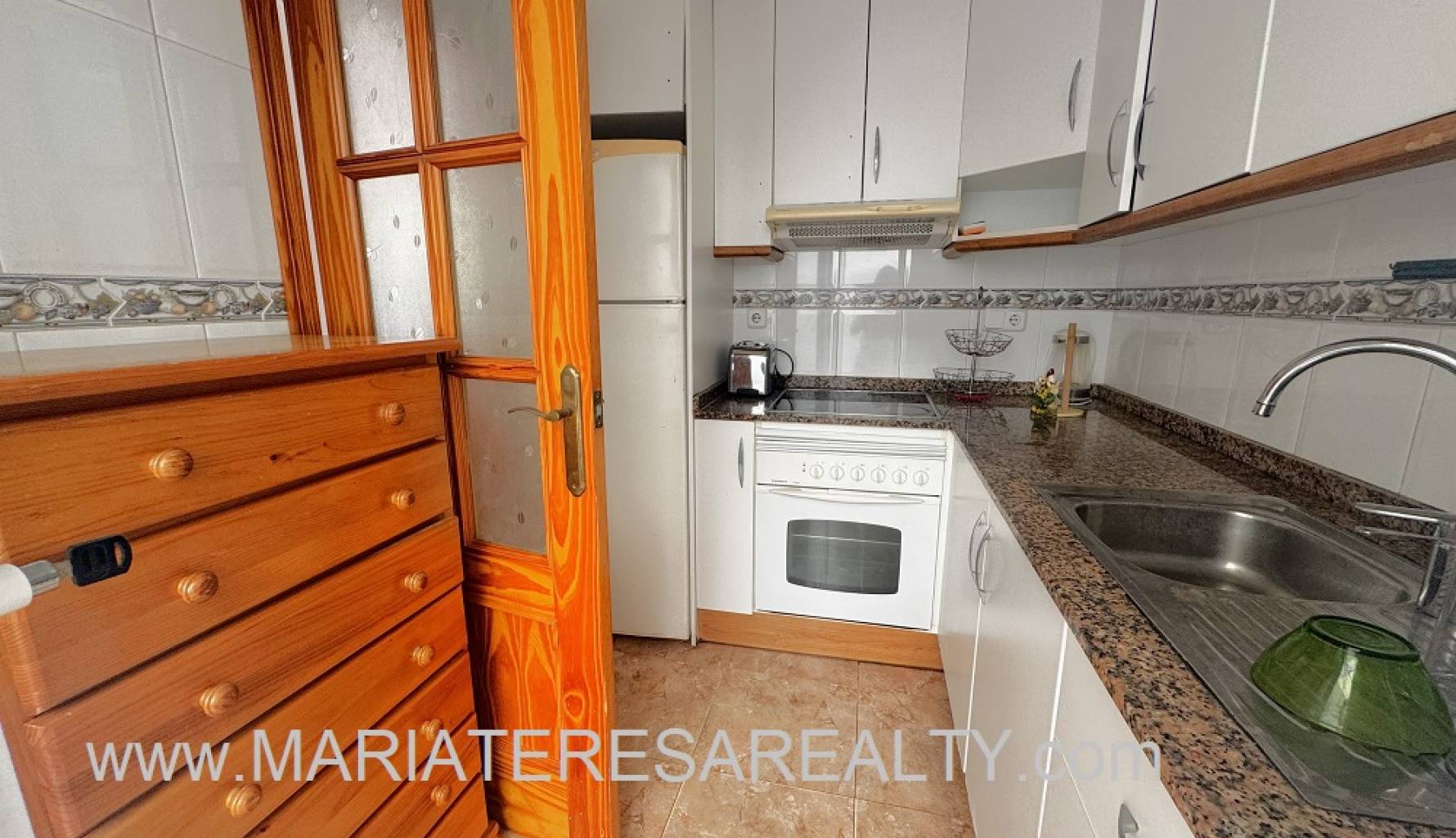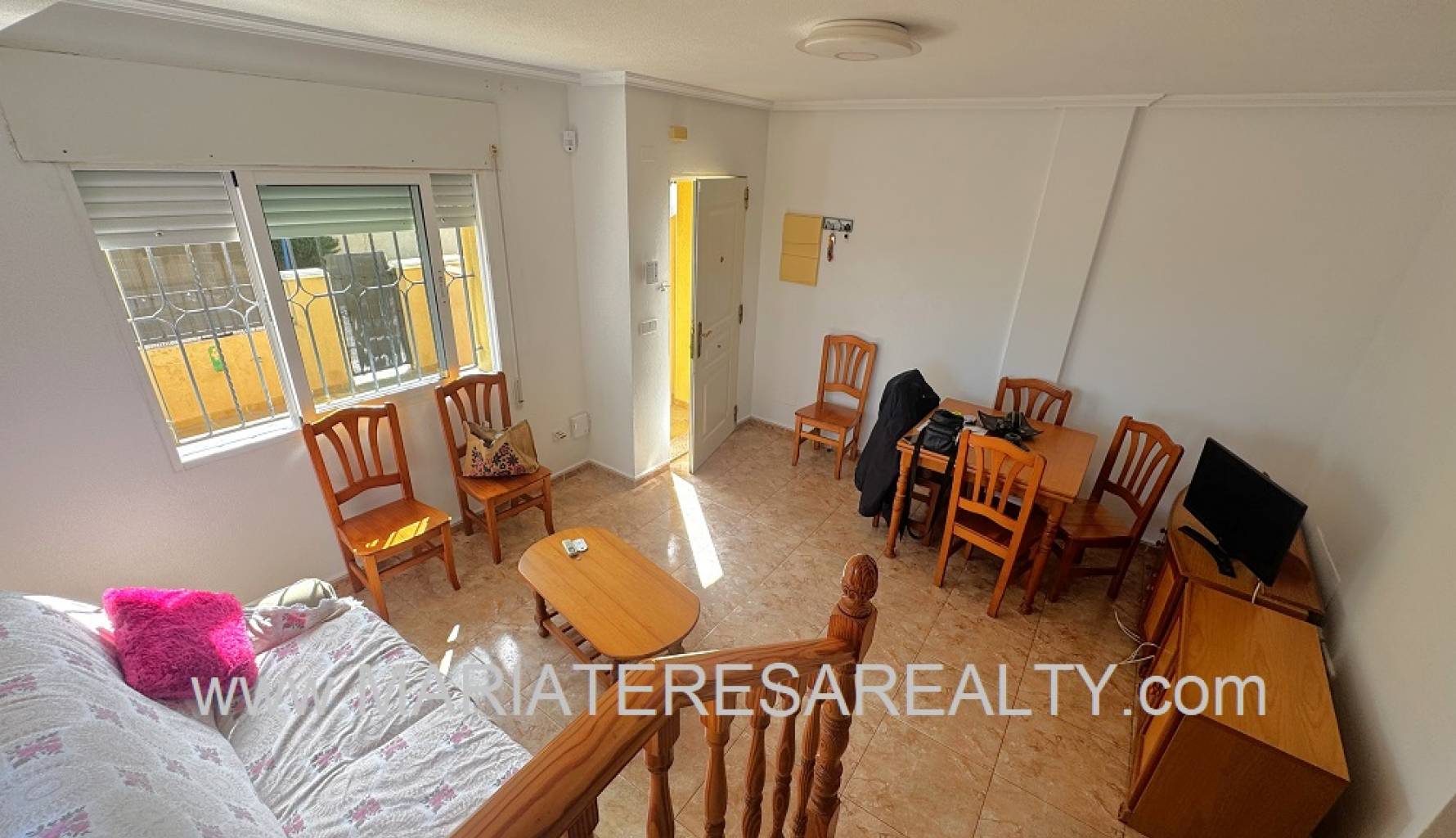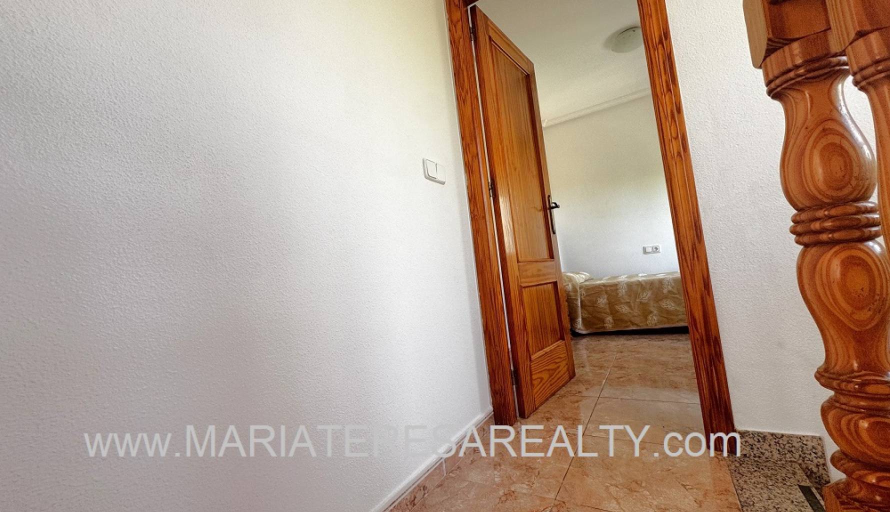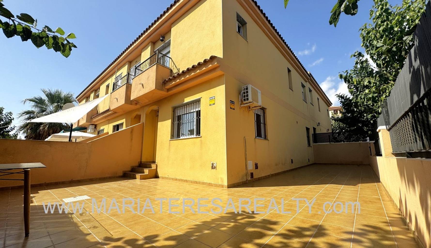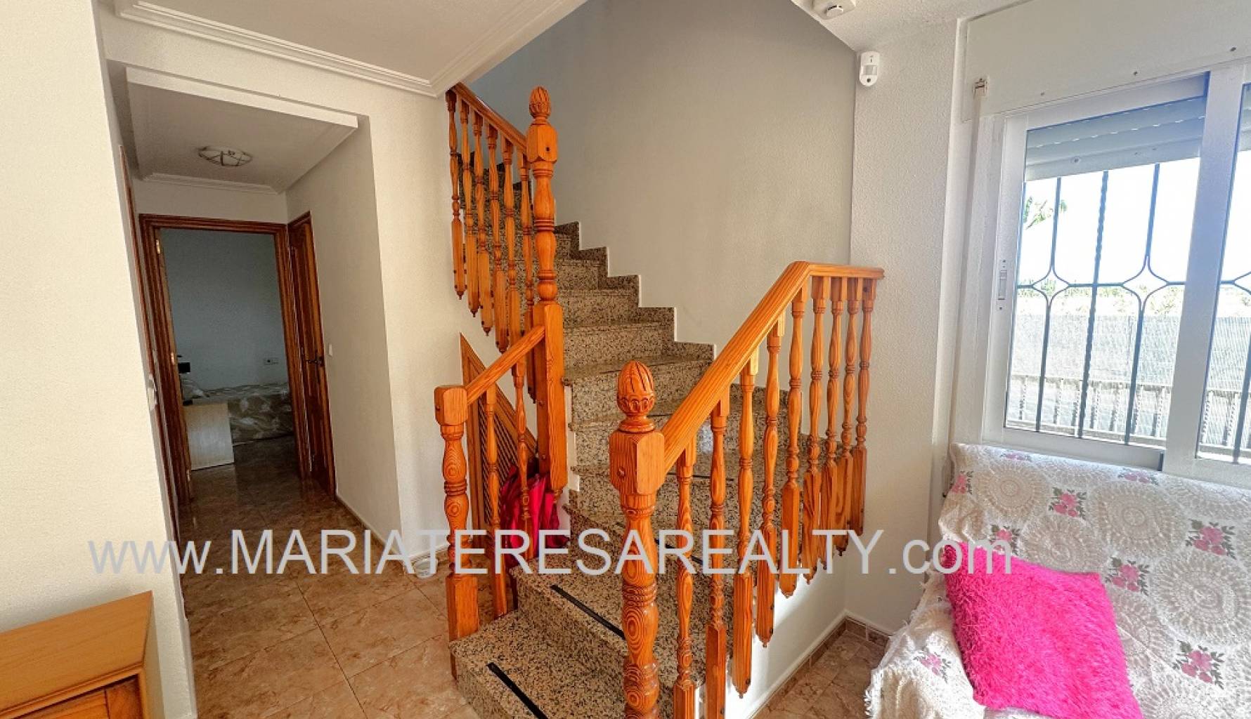 Precioso dúplex en esquina con jardín propio en los Narejos, Los Alcázares, Murcia. Al entrar a este dúplex tenemos un amplio y luminoso saló/comedor que a su vez da a un pasillo donde nos encontramos con la cocina independiente completamente equipada que a su vez da salida a un patio semi cubierto, siguiendo el pasillo tenemos un dormitorio con armario empotrado y un cuarto de baño equipado con ducha. Subiendo la escalera que se encuentra en el salón/comedor nos encontramos con un dormitorio con armario empotrado, un amplio cuarto de baño equipado con bañera y un amplio dormitorio con un gran armario empotrado y con salida a una terraza.