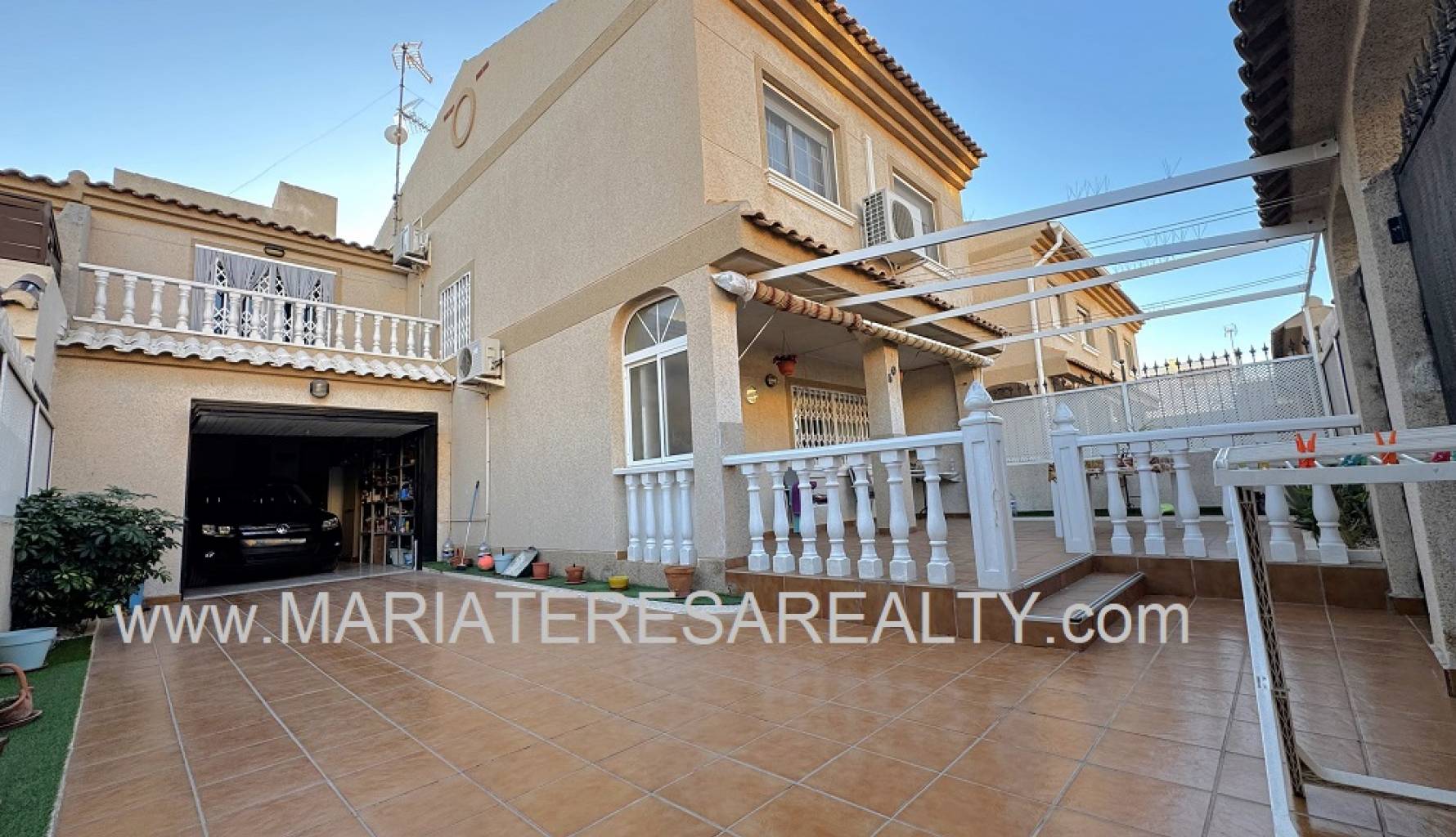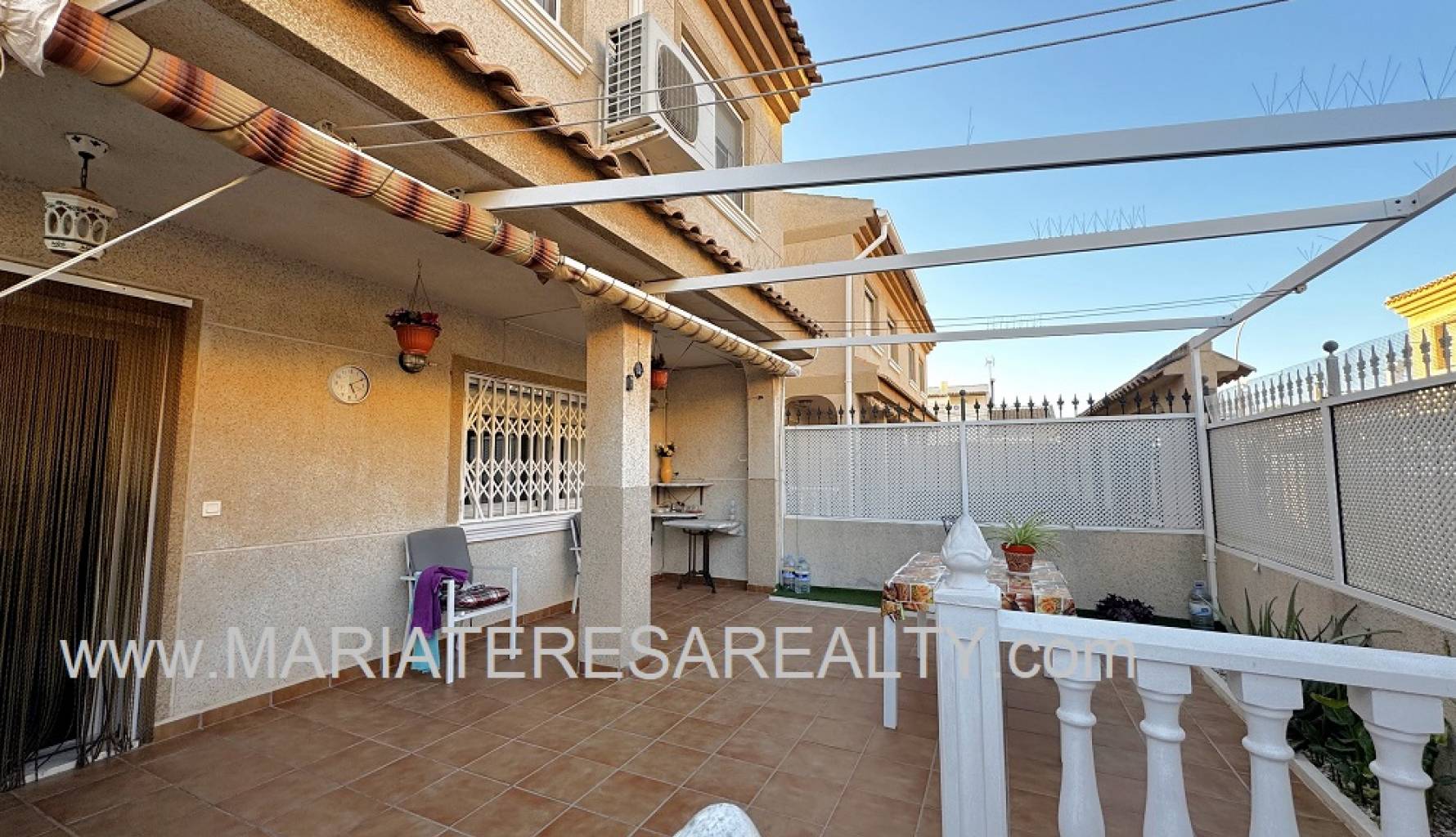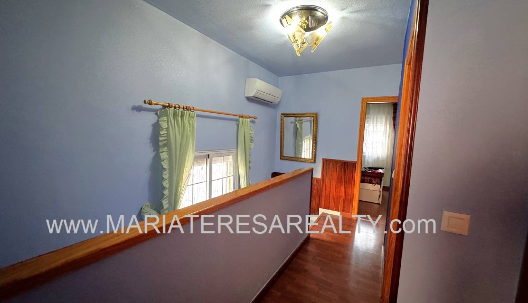 Maravilloso Dúplex con amplio jardín de 90m2 con toldos y garaje de 28m2. En la planta baja que está constituida por 53m2, tenemos al entrar a la vivienda un pequeño recibidor que independiza la entrada de la vivienda con el salón, un amplio salón/comedor con chimenea decorativa, seguimos y bajo la escalera tenemos una pequeña despensa, un cuarto de baño equipado con ducha, cocina independiente totalmente equipada que a su vez tiene salida a un amplio patio trasero con barbacoa de obra y toldos, el patio comunica directamente con el garaje y este a su vez tiene unas escaleras que conducen a una buhardilla de 28m2 con balcón y chimenea funcional. En la planta alta de este dúplex tenemos una superficie construida de 67m2, la cual consta de cuatro amplios dormitorios con armarios empotrados respectivos y un cuarto de baño equipado con ducha. Dos de los dormitorios están equipados con aire acondicionado al igual que el salón y el pasillo que dirige a las habitaciones. Esta vivienda dispone de rejas de seguridad, ventanas de doble cristal (climalit), mosquiteras en las ventanas y en las puertas entrada a la vivienda y salida al patio.