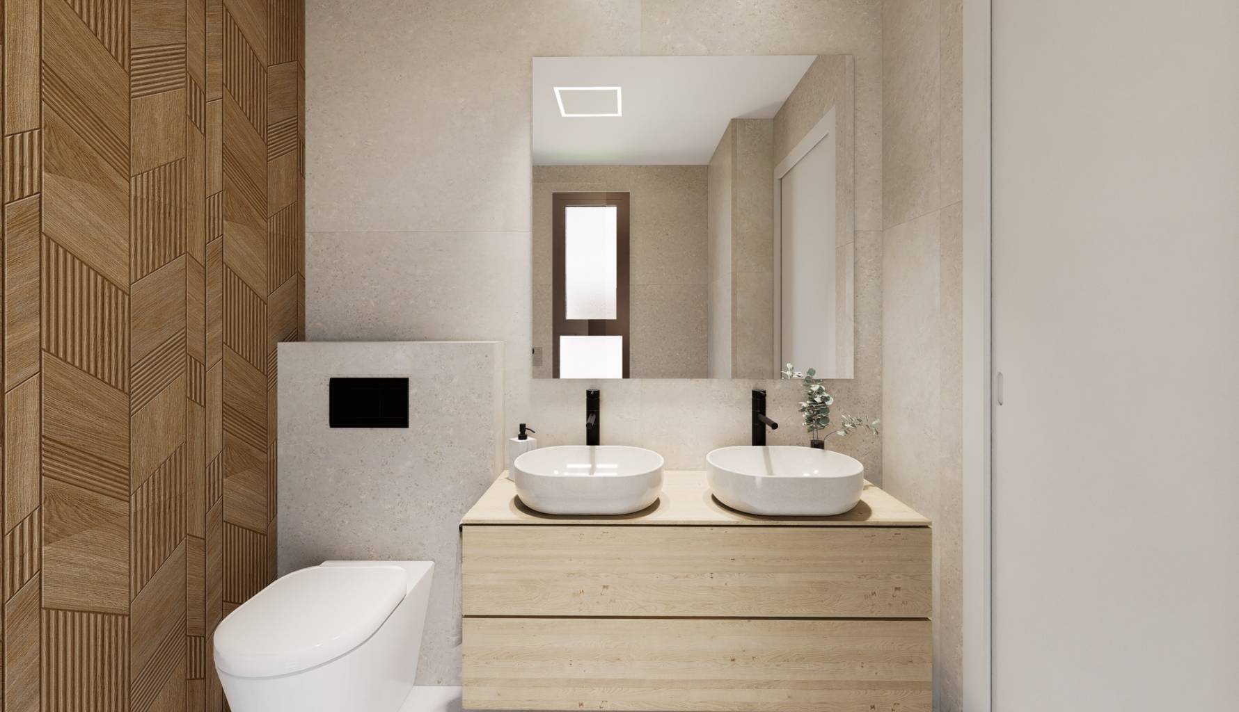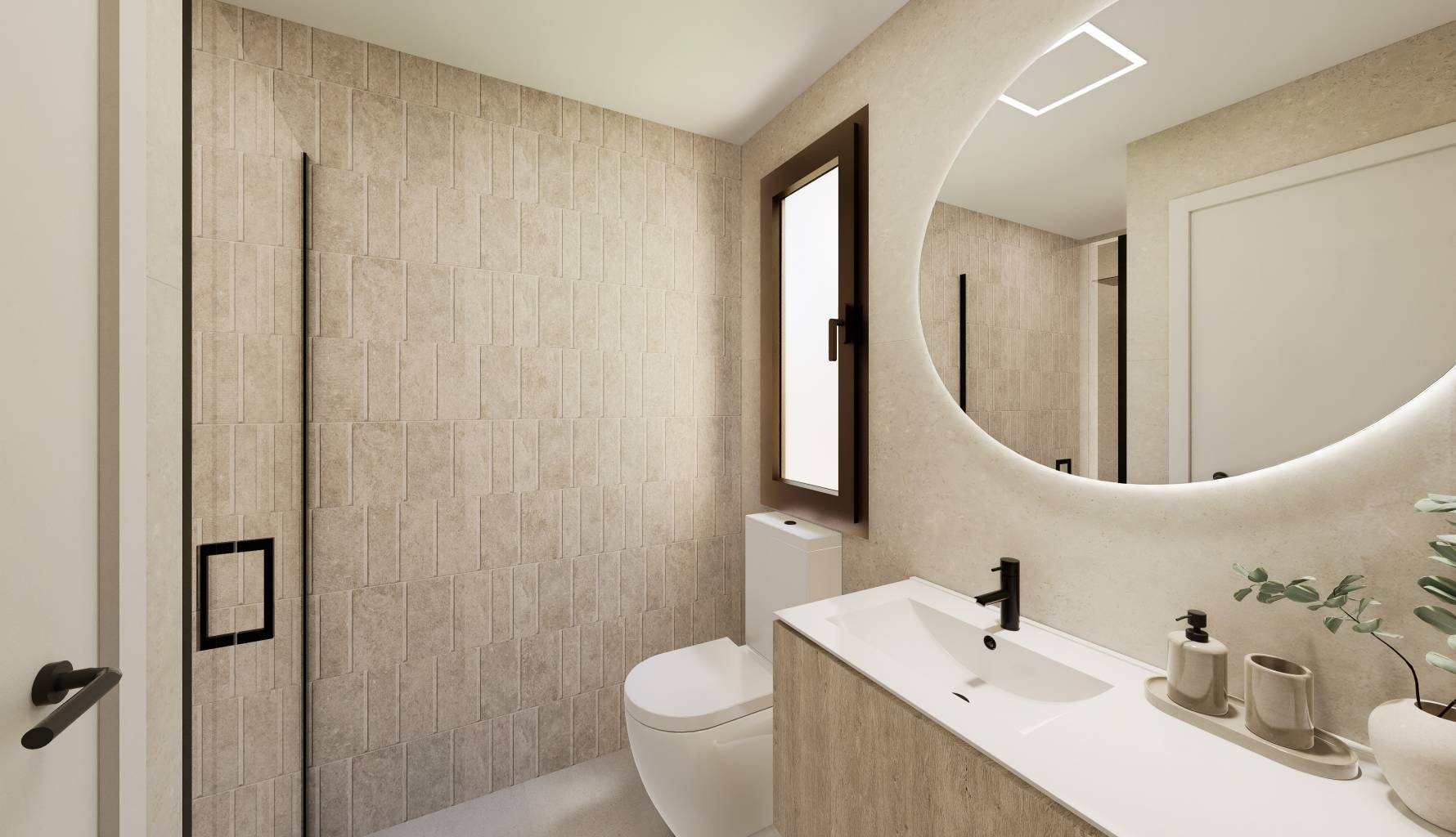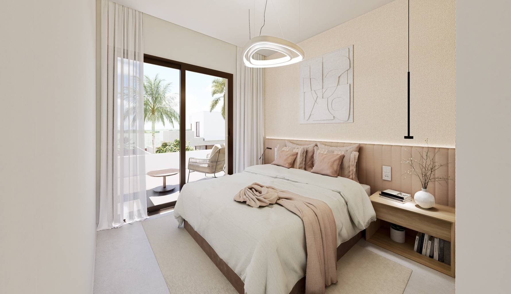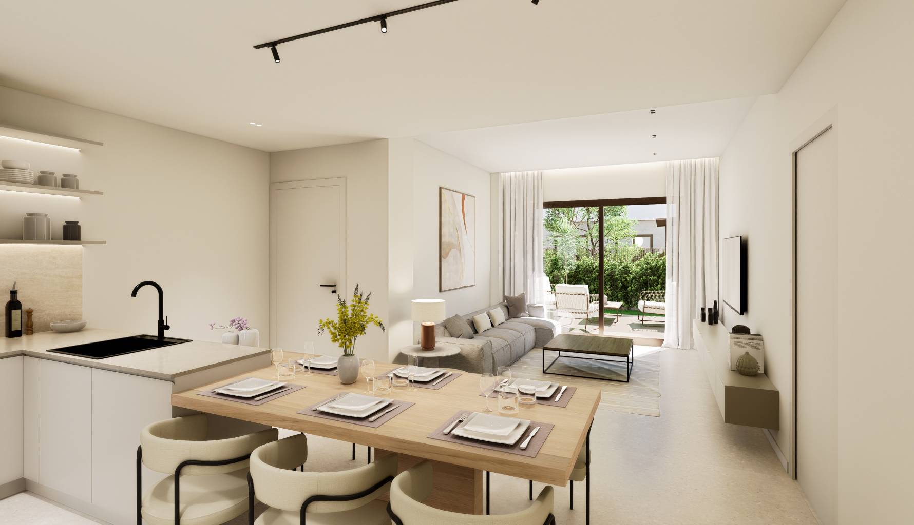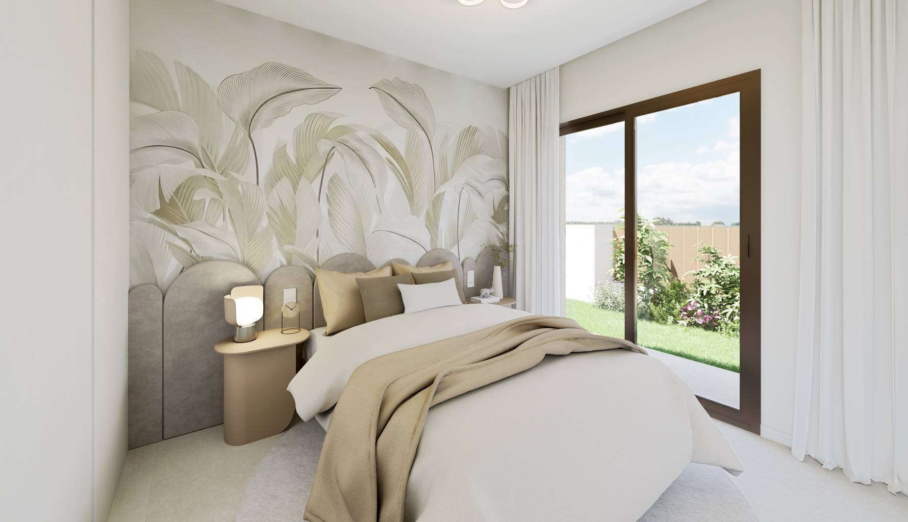 Los exteriores de estos bungalows están pensados para maximizar el disfrute del clima mediterráneo. Cada propiedad cuenta con un jardín privado, perfecto para crear un espacio verde personal o para disfrutar de momentos al aire libre. Además, las terrazas ofrecen un lugar ideal para relajarse, tomar el sol o compartir comidas al aire libre con familiares y amigos. La inclusión de un solárium proporciona un espacio adicional para disfrutar de vistas panorámicas y del sol durante todo el año. Estos elementos exteriores están diseñados para complementar el estilo de vida al aire libre que caracteriza a la región.