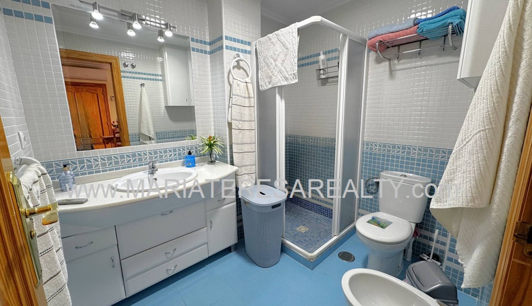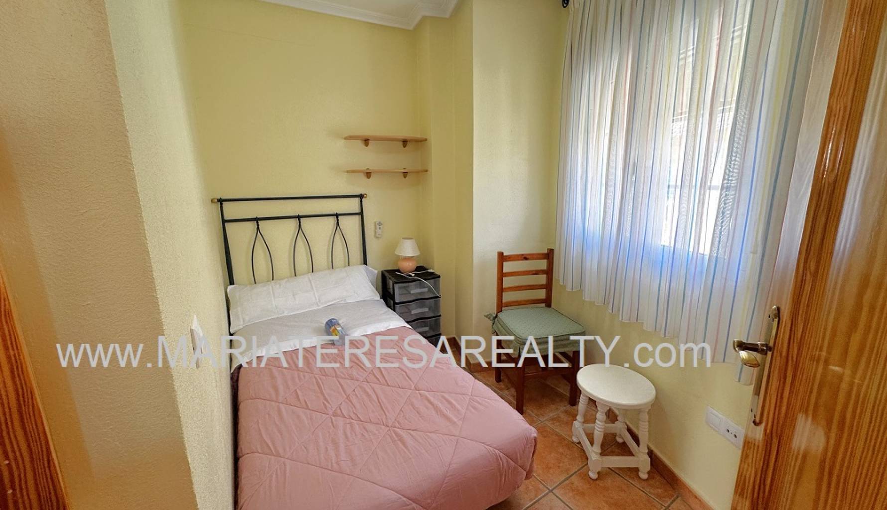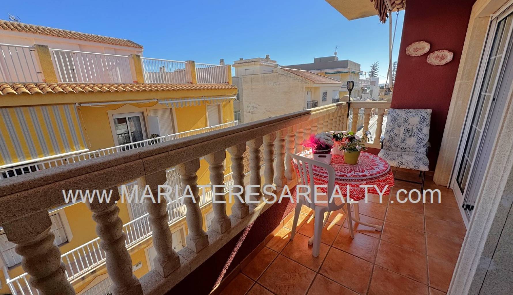 Acogedor piso en segunda planta con ascensor en el centro de Los Alcázares a tan solo 100 metros de la plaza del espejo y la playa. Este edificio consta de únicamente con una vivienda por planta por lo cual solo hay un apartamento en planta baja, un piso en planta primera, en segunda planta esta vivienda y en el ático un apartamento. Al entrar a la vivienda tenemos un amplio y luminoso salón/comedor con aire acondicionado, con salida balcón/terraza con toldo y una amplia despensa/trastero, seguimos con la cocina que es independiente y está completamente equipada con toldos en la ventana y da paso a un dormitorio individual con armario empotrado y ventilador de techo, un amplio cuarto de baño equipado con ducha, un amplio dormitorio principal con cama de matrimonio y un gran armario empotrado también con toldos en la ventana y ventilador de techo y un tercer dormitorio con armario empotrado, ventilador de techo y este dormitorio tiene acceso al balcón que comunica con el salón. El solario comunitario de 15m2 que es accesible por ascensor y cuenta con trastero comunitario.
