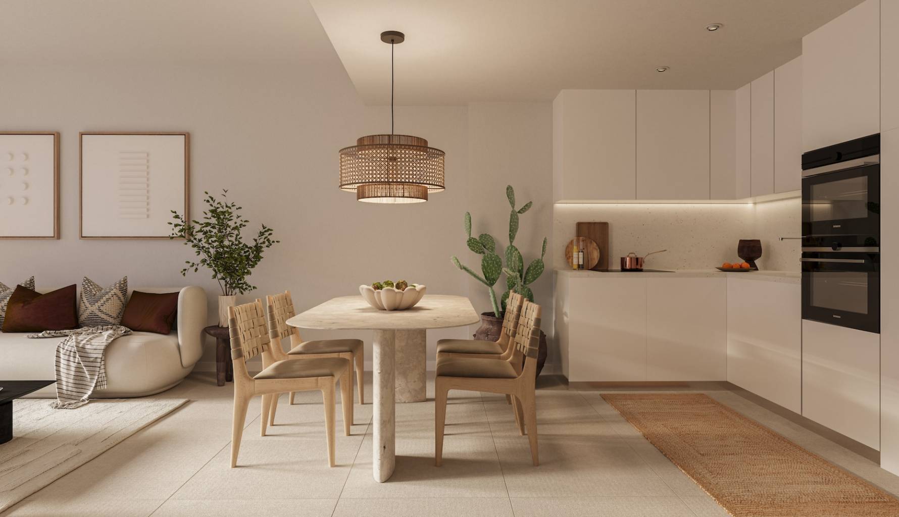 El interior de las viviendas está diseñado para maximizar el confort y la funcionalidad. Las opciones de distribución incluyen apartamentos de 1, 2 y 3 dormitorios, con 1 o 2 baños, adaptándose a diferentes estilos de vida. La integración de sistemas de domótica permite un control eficiente de las instalaciones, mientras que el aire acondicionado asegura un ambiente agradable durante todo el año. Los armarios empotrados optimizan el espacio de almacenamiento, y los suelos de cerámica aportan un toque moderno y fácil de mantener.