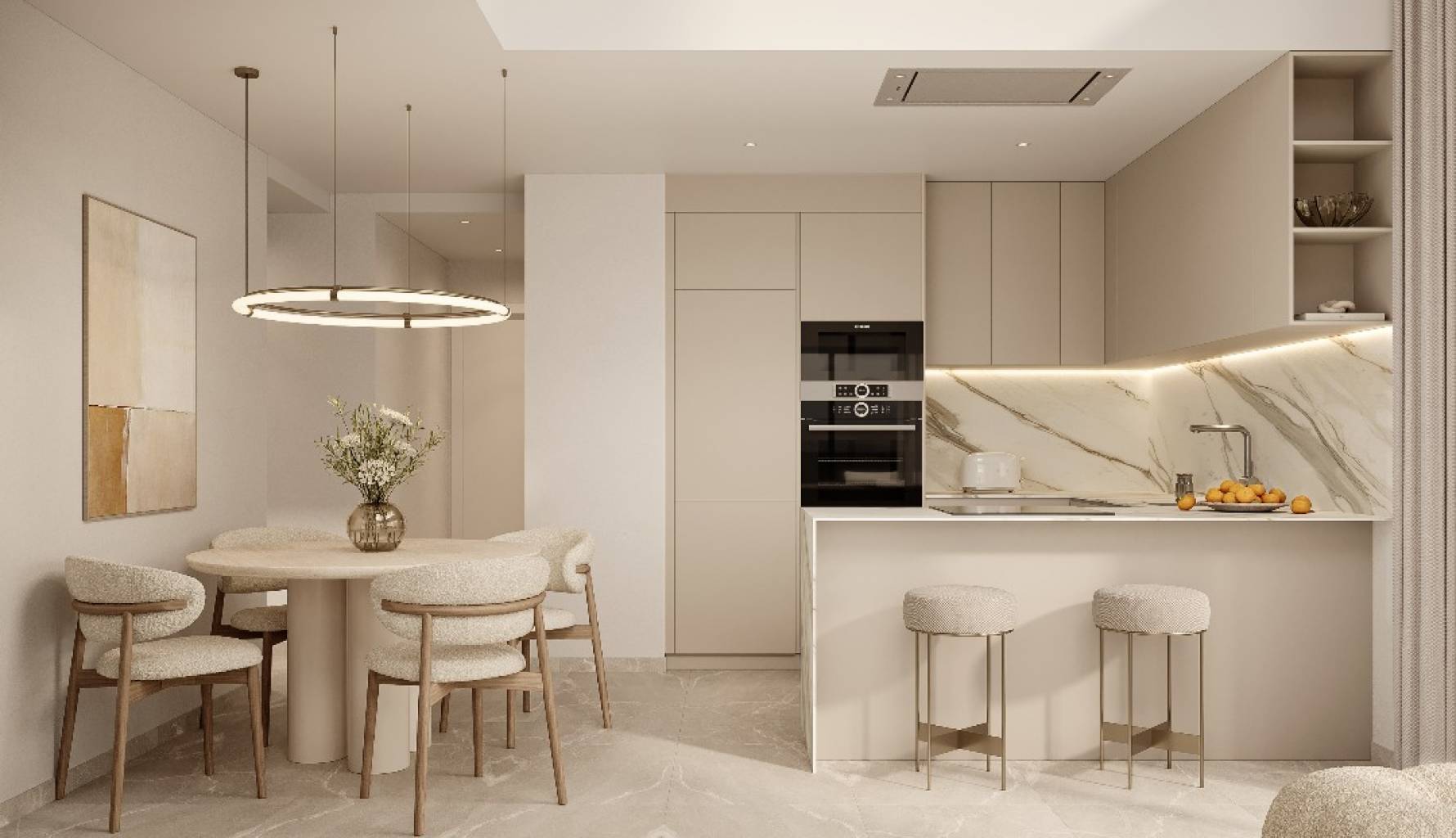 El interior de las viviendas está diseñado con un enfoque en la comodidad y el estilo. Las opciones de distribución incluyen apartamentos y áticos de 2 o 3 dormitorios, todos con 2 baños, lo que los hace ideales tanto para familias como para parejas. La inclusión de garaje asegura un espacio seguro para el estacionamiento, mientras que los armarios empotrados optimizan el almacenamiento. La integración de domótica y electrodomésticos modernos facilita un estilo de vida contemporáneo y eficiente.