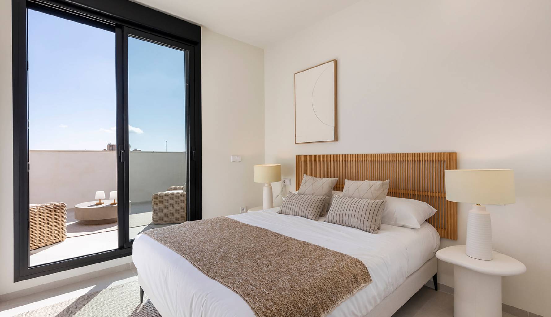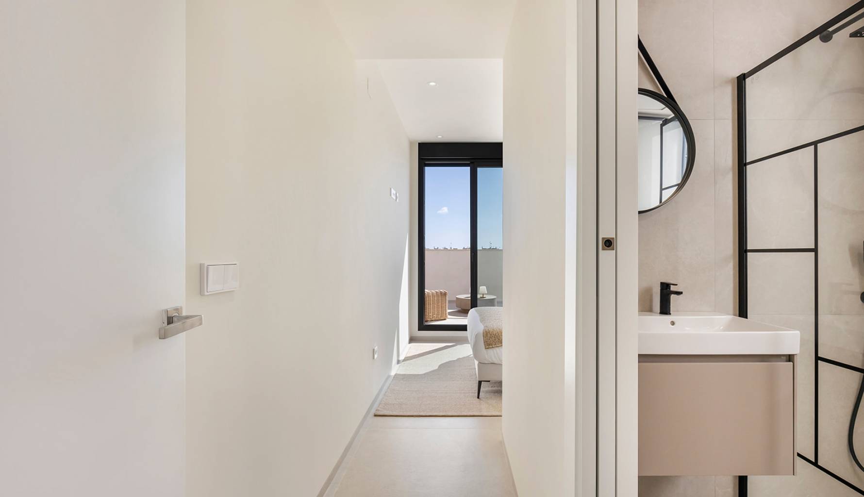 El interior de estas viviendas está diseñado con atención al detalle y funcionalidad. Los chalets ofrecen opciones de 2 o 3 dormitorios y 2 o 3 baños, adaptándose a diferentes necesidades familiares. Los suelos de gres porcelánico aportan un toque moderno y son fáciles de mantener. La cocina está equipada con electrodomésticos, facilitando la vida diaria desde el primer día. El aire acondicionado asegura un ambiente confortable durante todo el año. Los armarios empotrados optimizan el espacio de almacenamiento, manteniendo el orden y la estética.