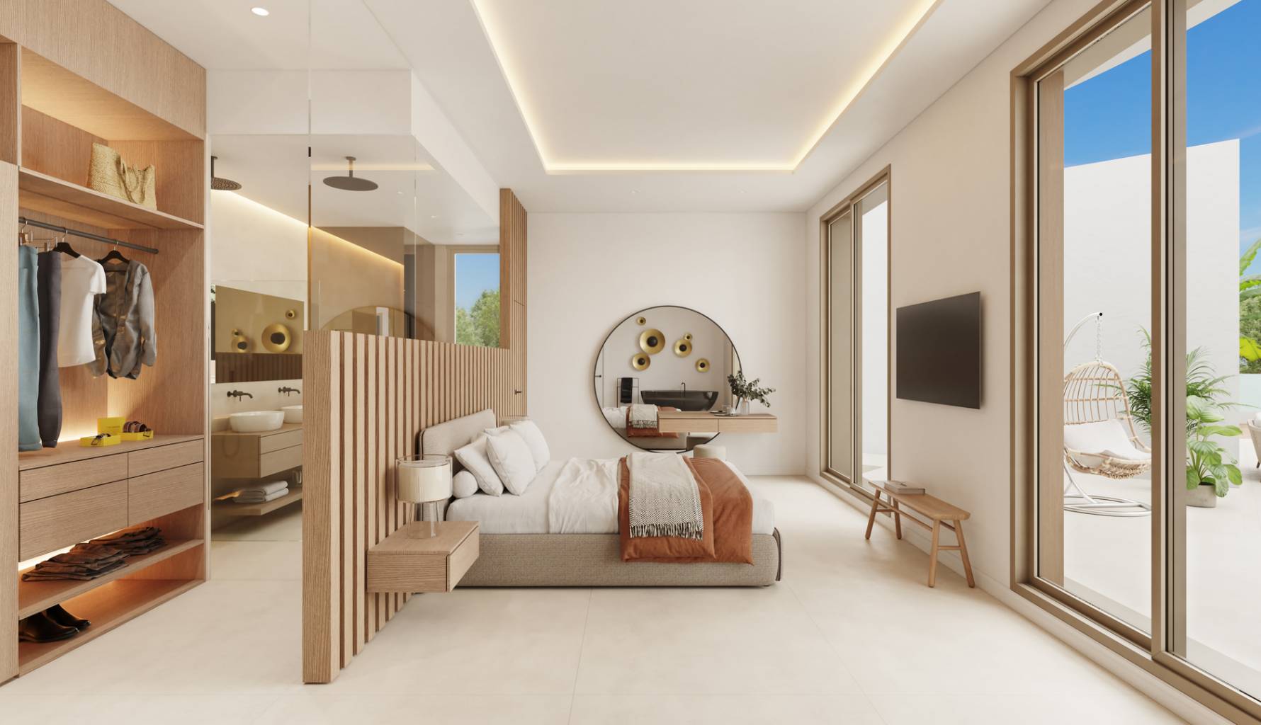 El interior de estas viviendas está diseñado para ofrecer la máxima comodidad y funcionalidad. Con opciones de 4 o 5 dormitorios y 3 a 5 baños, cada hogar se adapta a las necesidades familiares. Los suelos de gres porcelánico aportan un toque de elegancia y facilidad de mantenimiento. Las viviendas están equipadas con aire acondicionado, garantizando un ambiente agradable durante todo el año. Los armarios empotrados ofrecen un espacio de almacenamiento eficiente, mientras que la inclusión de electrodomésticos modernos asegura que cada cocina esté lista para su uso desde el primer día. Además, cada vivienda cuenta con un garaje, proporcionando un espacio seguro para el estacionamiento.