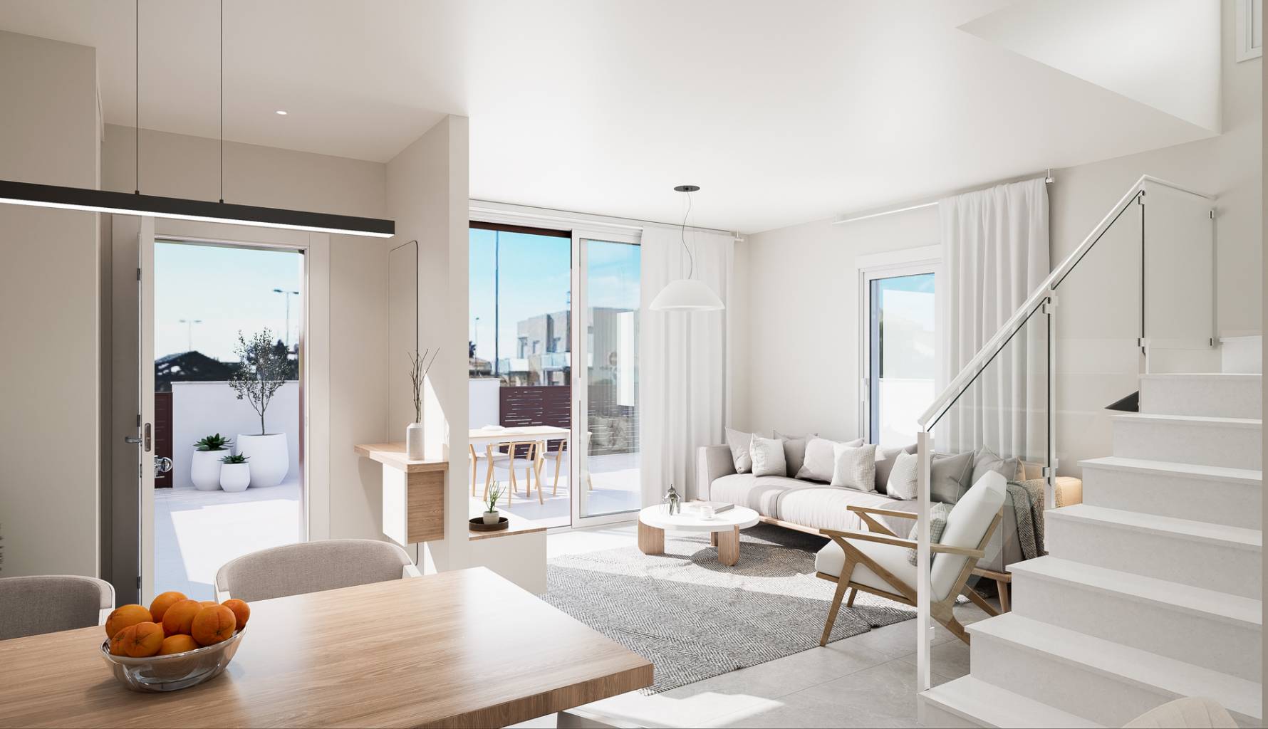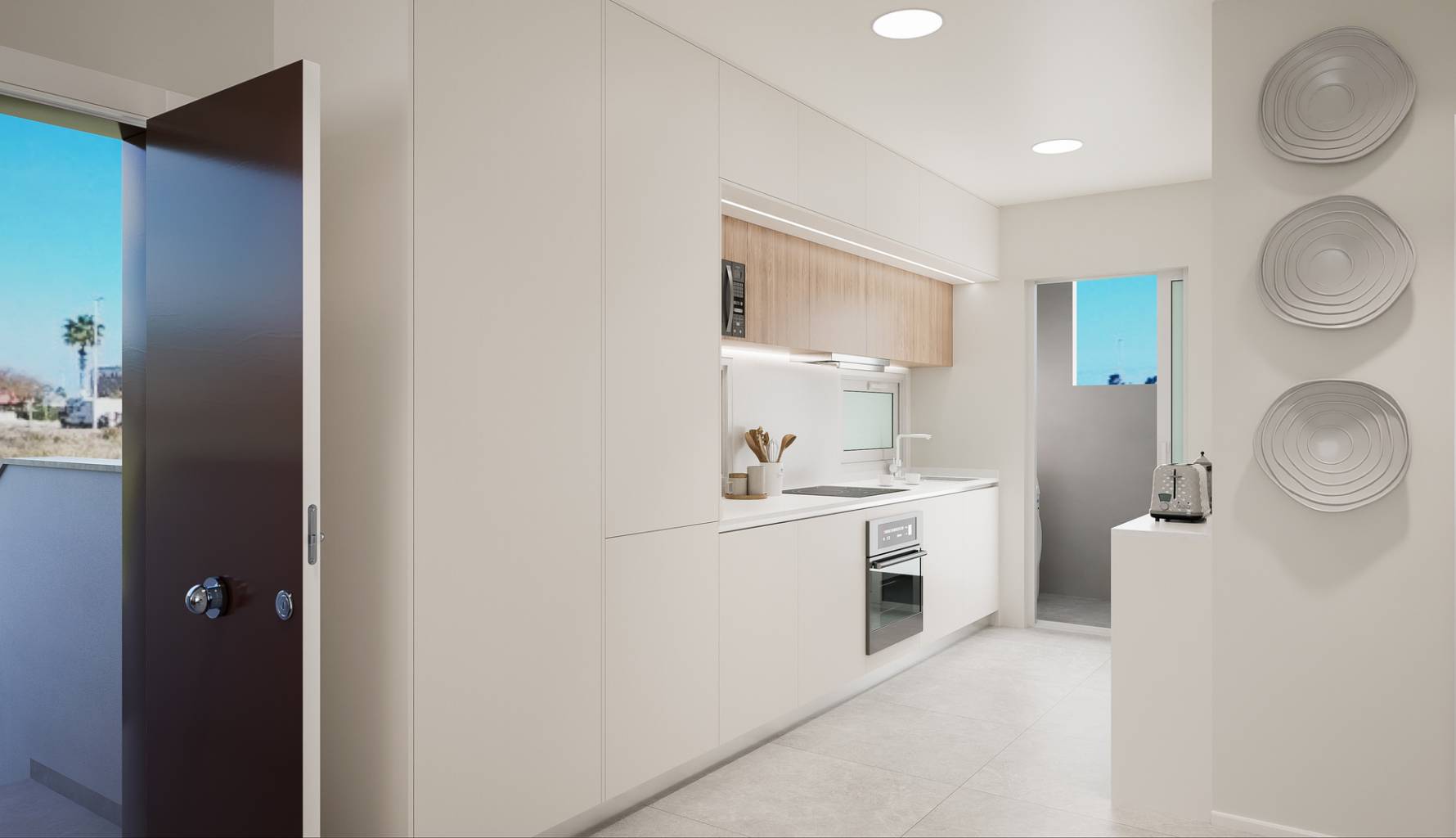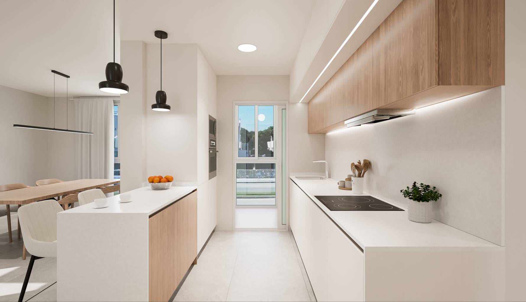El interior de las viviendas está cuidadosamente diseñado para ofrecer el máximo confort y estilo. Los suelos de gres porcelánico aportan un acabado elegante y duradero, mientras que el aire acondicionado asegura un ambiente agradable durante todo el año. Las cocinas están equipadas con electrodomésticos modernos, facilitando la vida diaria. Los armarios empotrados en los dormitorios proporcionan un almacenamiento eficiente y ordenado. Cada detalle ha sido considerado para crear un espacio acogedor y funcional, donde la calidad y el diseño se unen para ofrecer un hogar excepcional.
