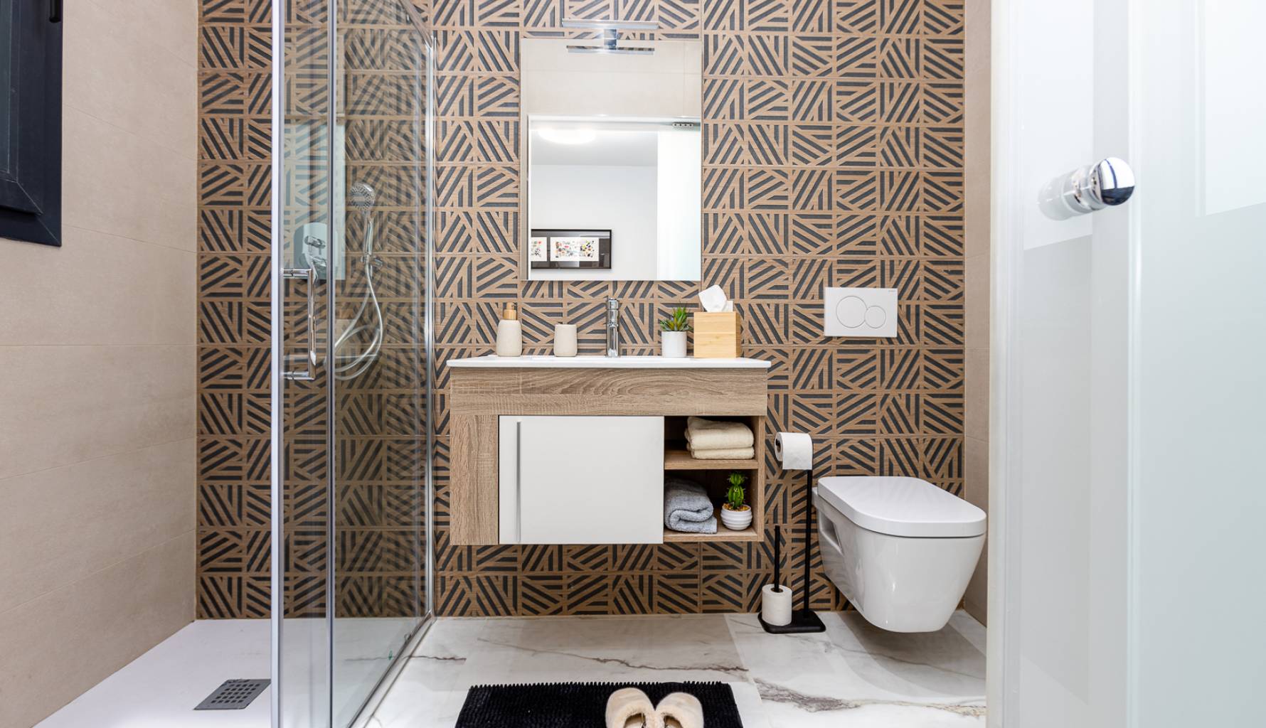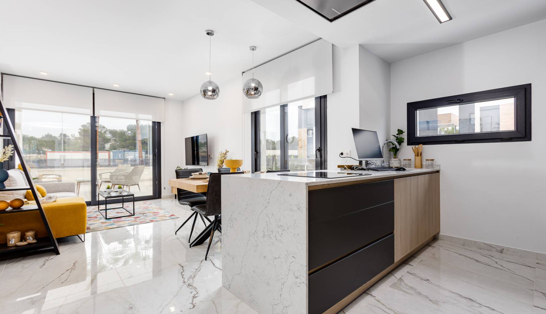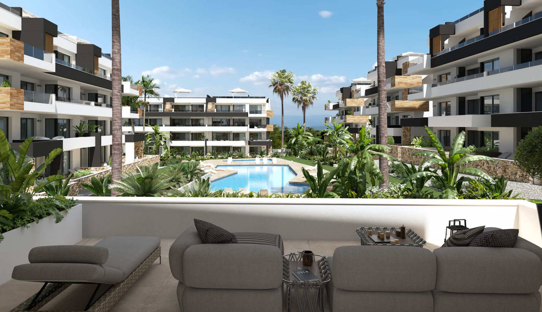 The homes are equipped with modern features that ensure a high level of comfort. Porcelain stoneware floors add a touch of elegance and are easy to maintain. Electric shutters and included appliances make daily life easier, while built-in wardrobes offer efficient storage. The pre-installation of air conditioning ensures that each home can easily adapt to the temperature preferences of its residents. The layout of the properties includes two bedrooms and two bathrooms, providing adequate space for families or couples. Terraces and solariums available in some typologies allow for enjoying the Mediterranean climate and open views.