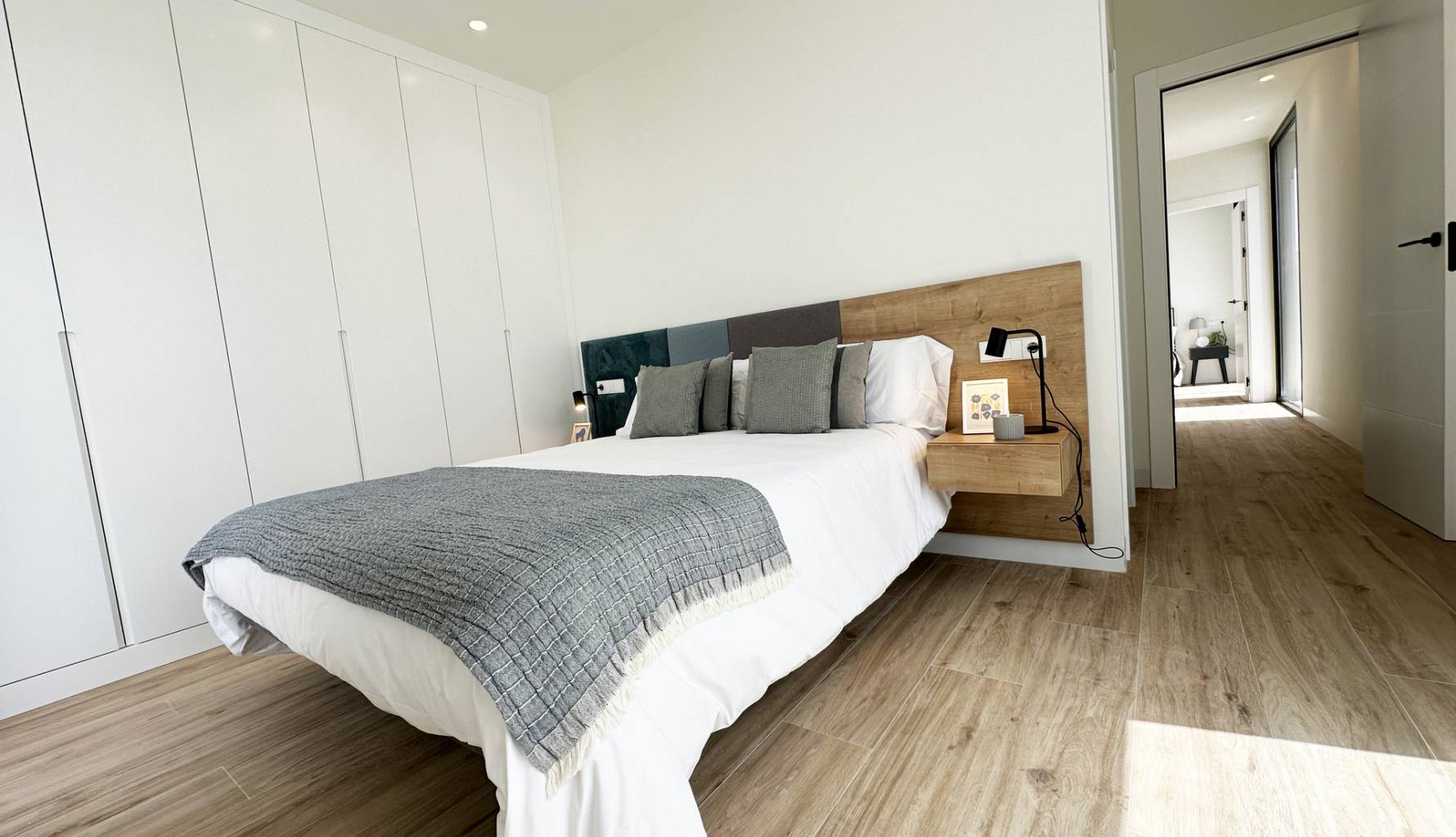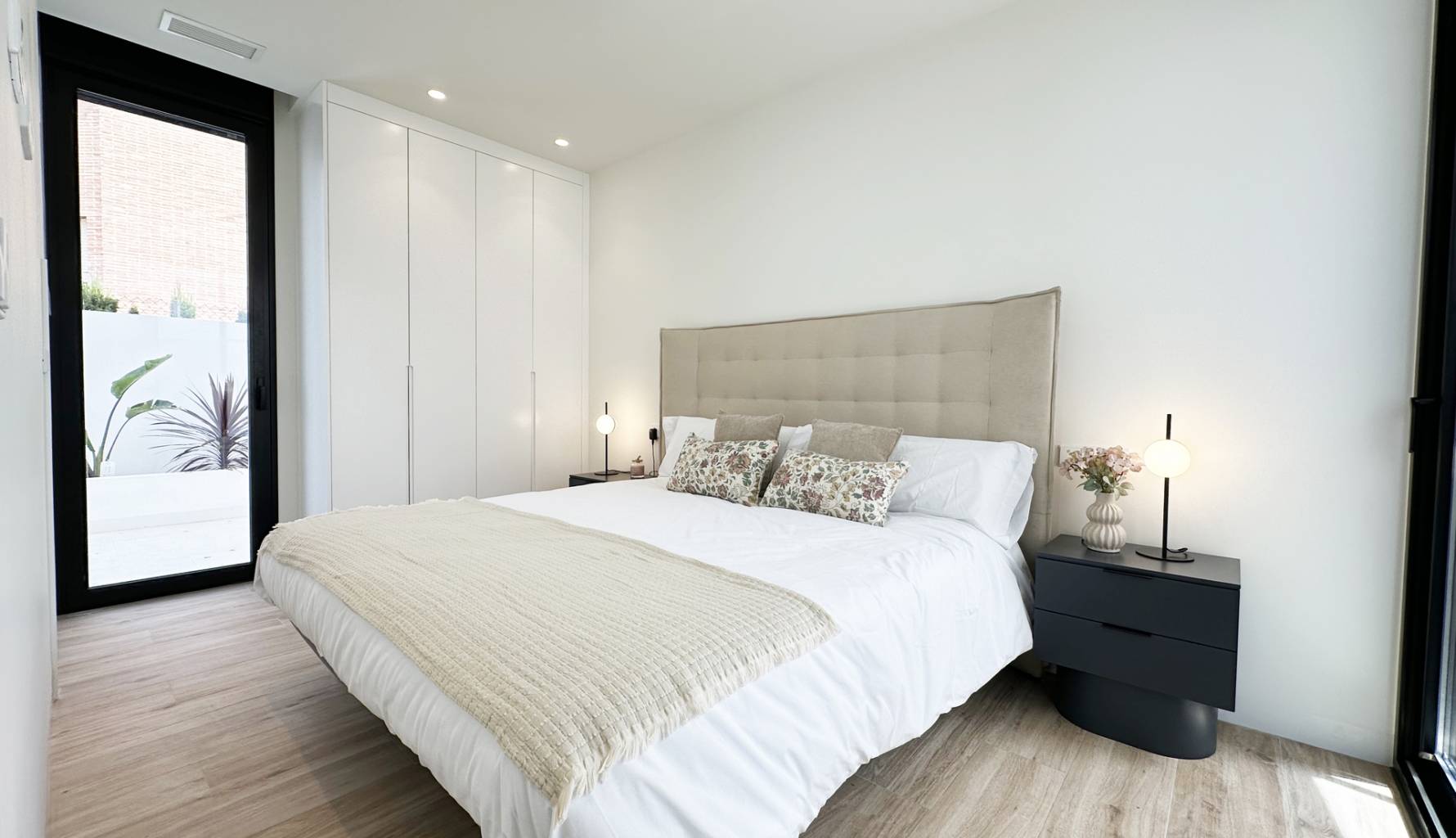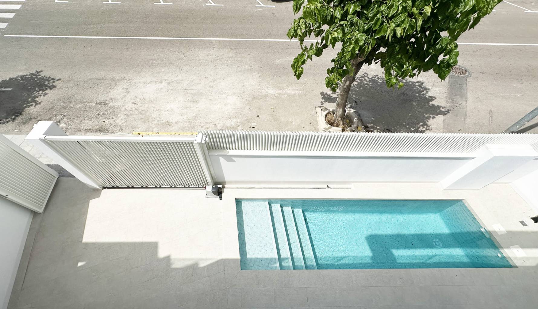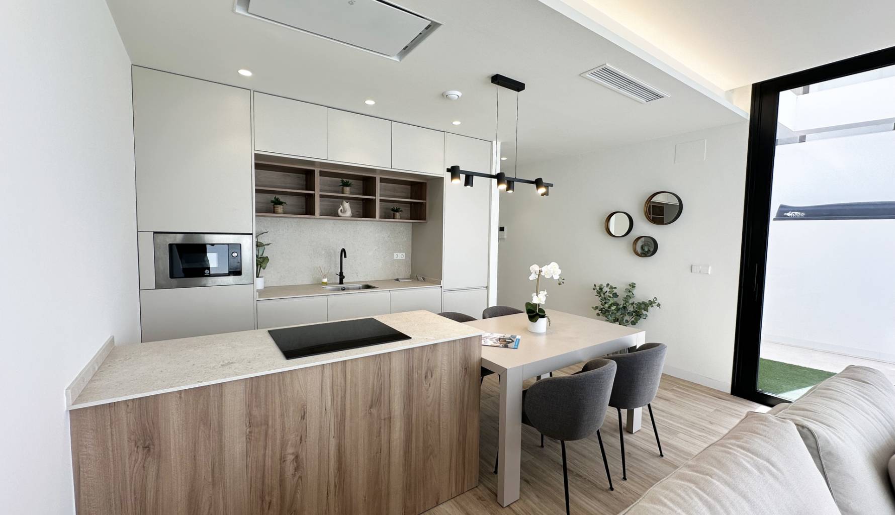 The interiors of these detached homes in Torre de la Horadada are designed to offer maximum comfort and functionality. Ceramic floors provide a modern touch and are easy to maintain, while the air conditioning system ensures a pleasant environment year-round. The homes are equipped with high-quality appliances, facilitating daily tasks and enhancing the living experience. Built-in wardrobes provide ample storage space, maintaining order and organization in the home. Additionally, electric shutters and the video intercom add an extra level of convenience and security, allowing efficient control of access to the home.