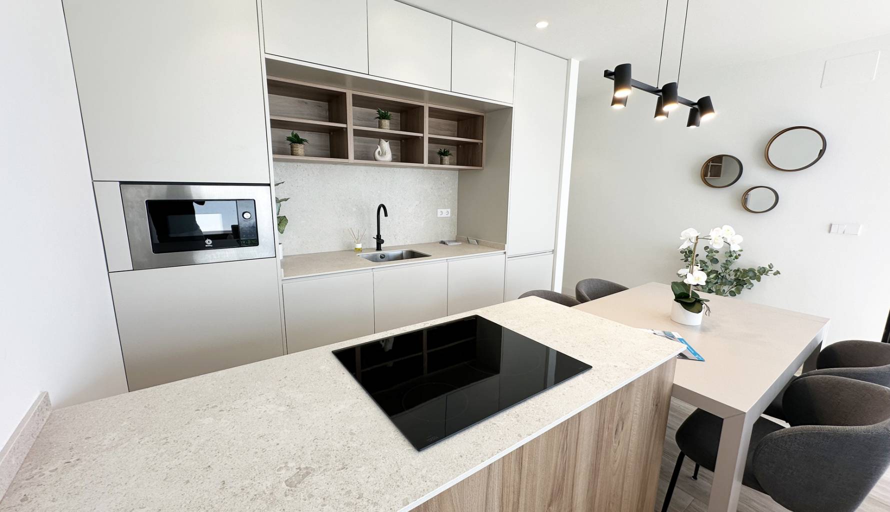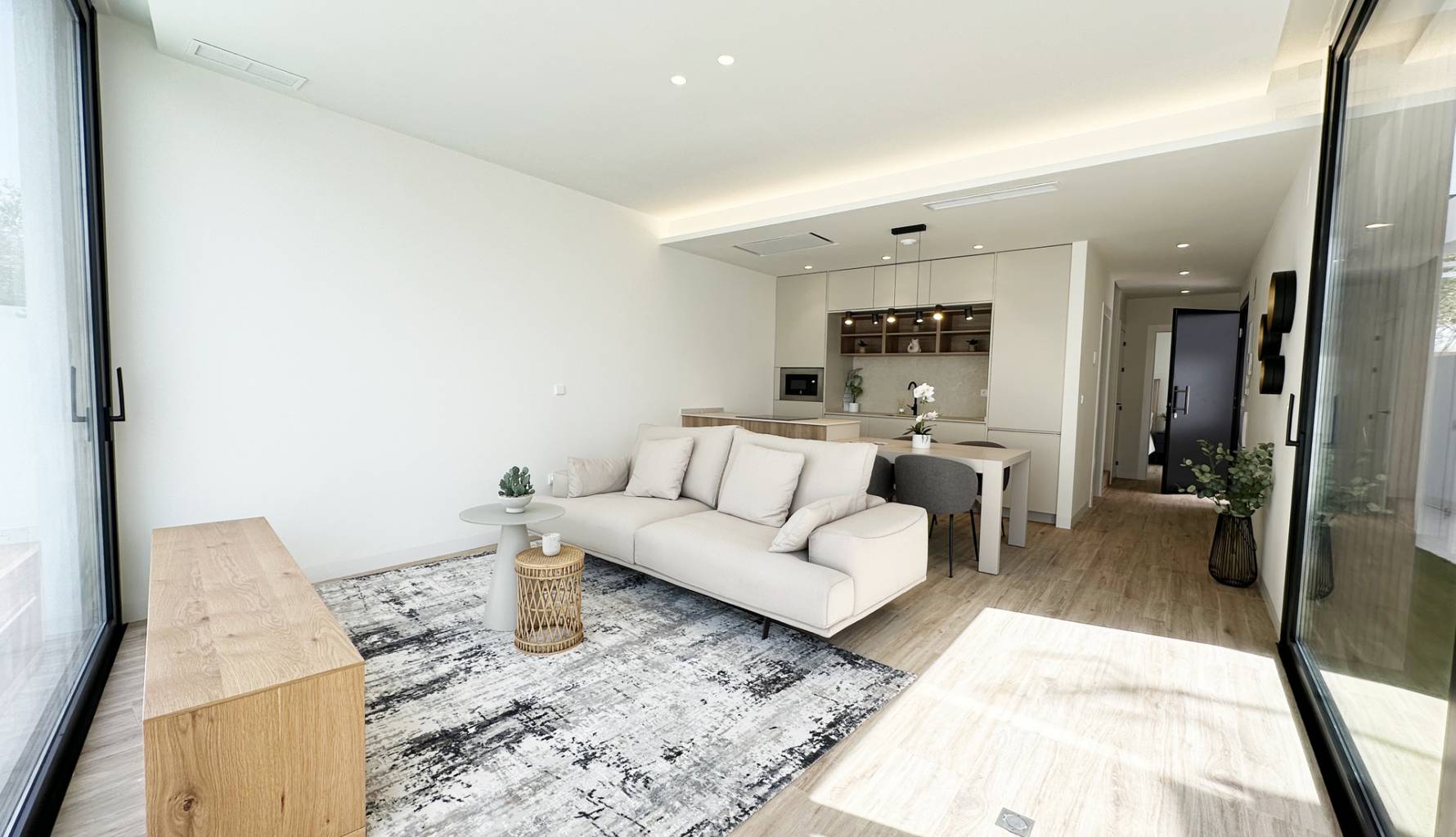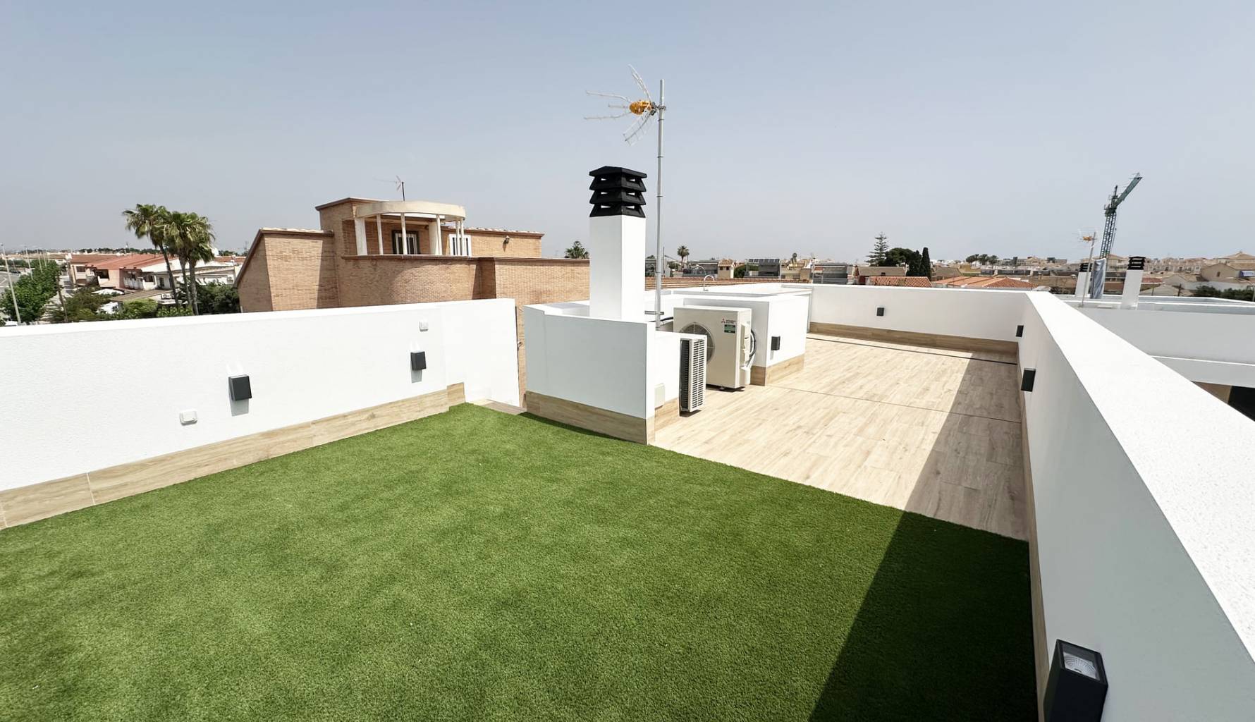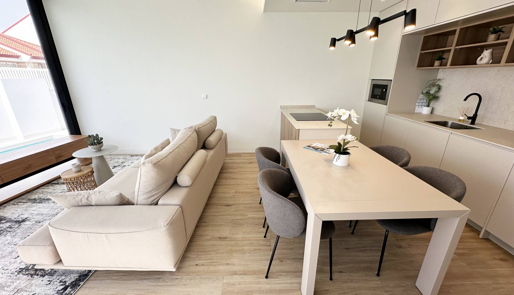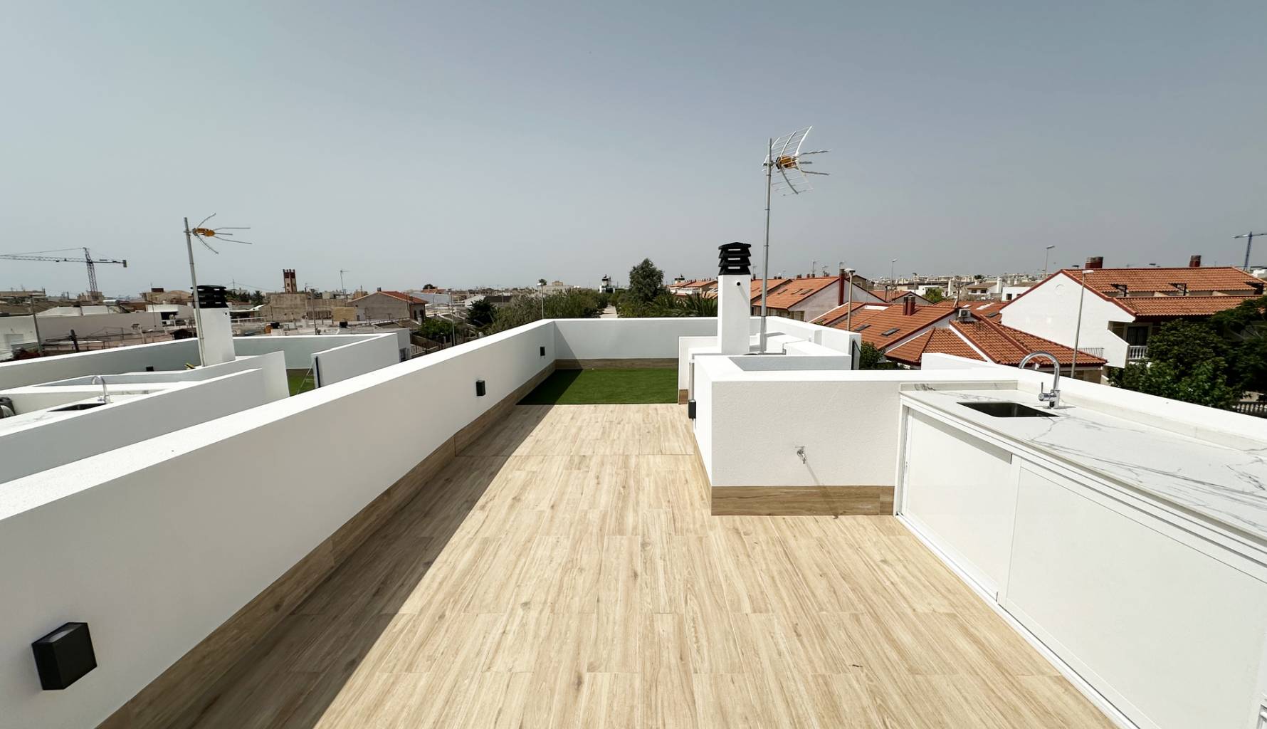 The interiors of these detached homes in Torre de la Horadada are designed to offer maximum comfort and functionality. Ceramic floors provide a modern touch and are easy to maintain, while the air conditioning system ensures a pleasant environment year-round. The homes are equipped with high-quality appliances, facilitating daily tasks and enhancing the living experience. Built-in wardrobes provide ample storage space, maintaining order and organization in the home. Additionally, electric shutters and the video intercom add an extra level of convenience and security, allowing efficient control of access to the home.
