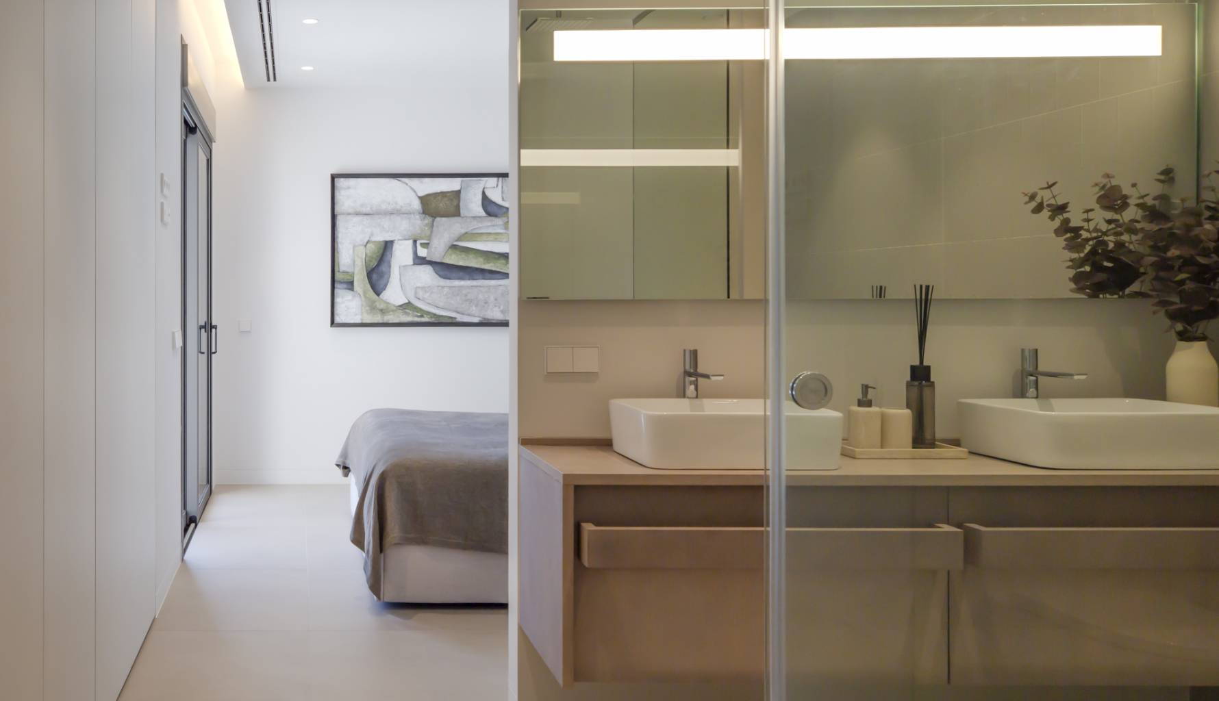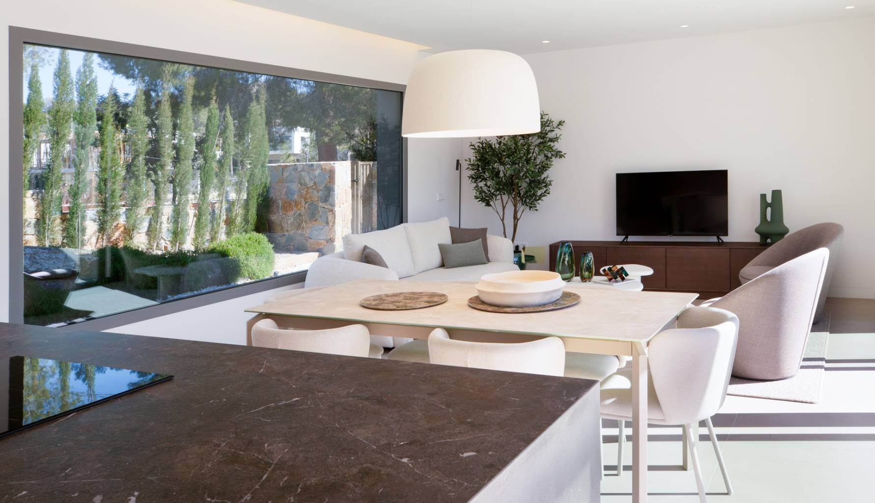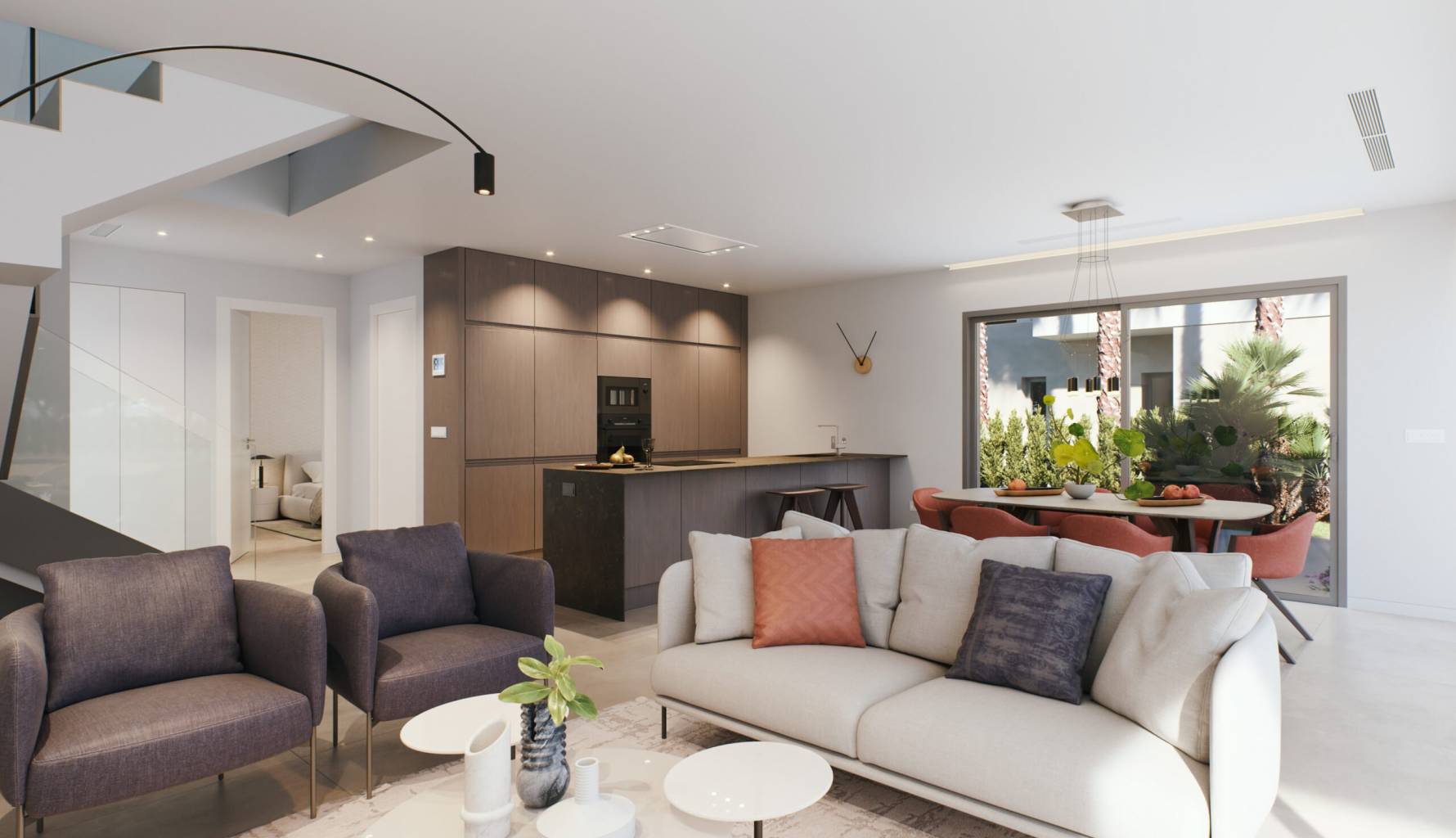 The interior of the homes is designed to offer a cozy and modern atmosphere. Each property features three bedrooms and three bathrooms, providing a spacious and functional space for the whole family. High-quality finishes include porcelain stoneware floors, which add an elegant touch and are easy to maintain. The homes are fully furnished and equipped with appliances, ensuring every detail is taken care of to offer maximum comfort. Technology also plays an important role, with features such as home automation, air conditioning, underfloor heating, video intercom, and electric shutters, guaranteeing a modern and efficient lifestyle. Built-in wardrobes offer practical and stylish storage solutions, completing an interior design that combines functionality and style.