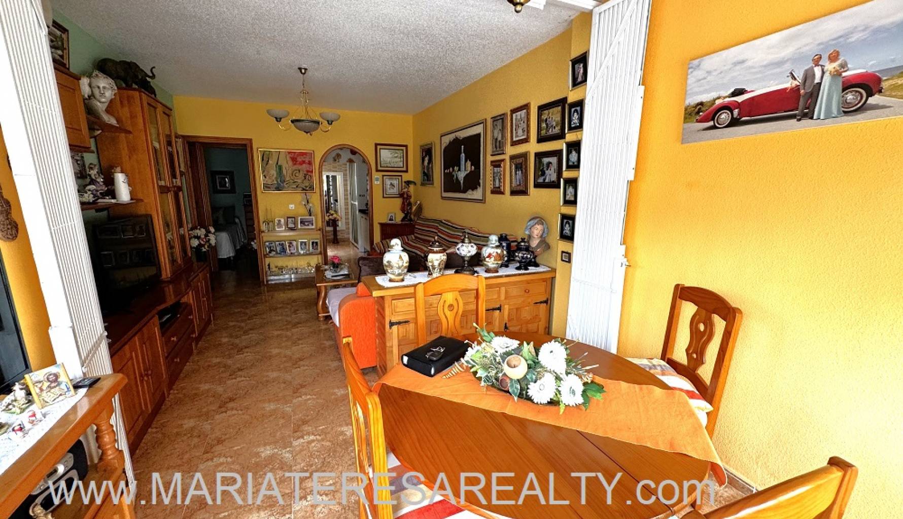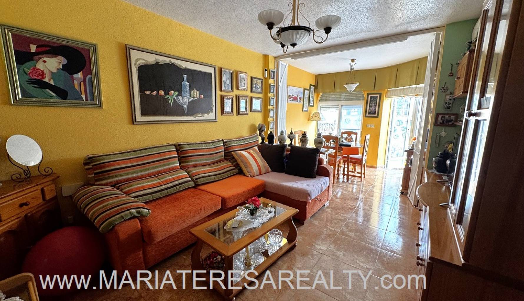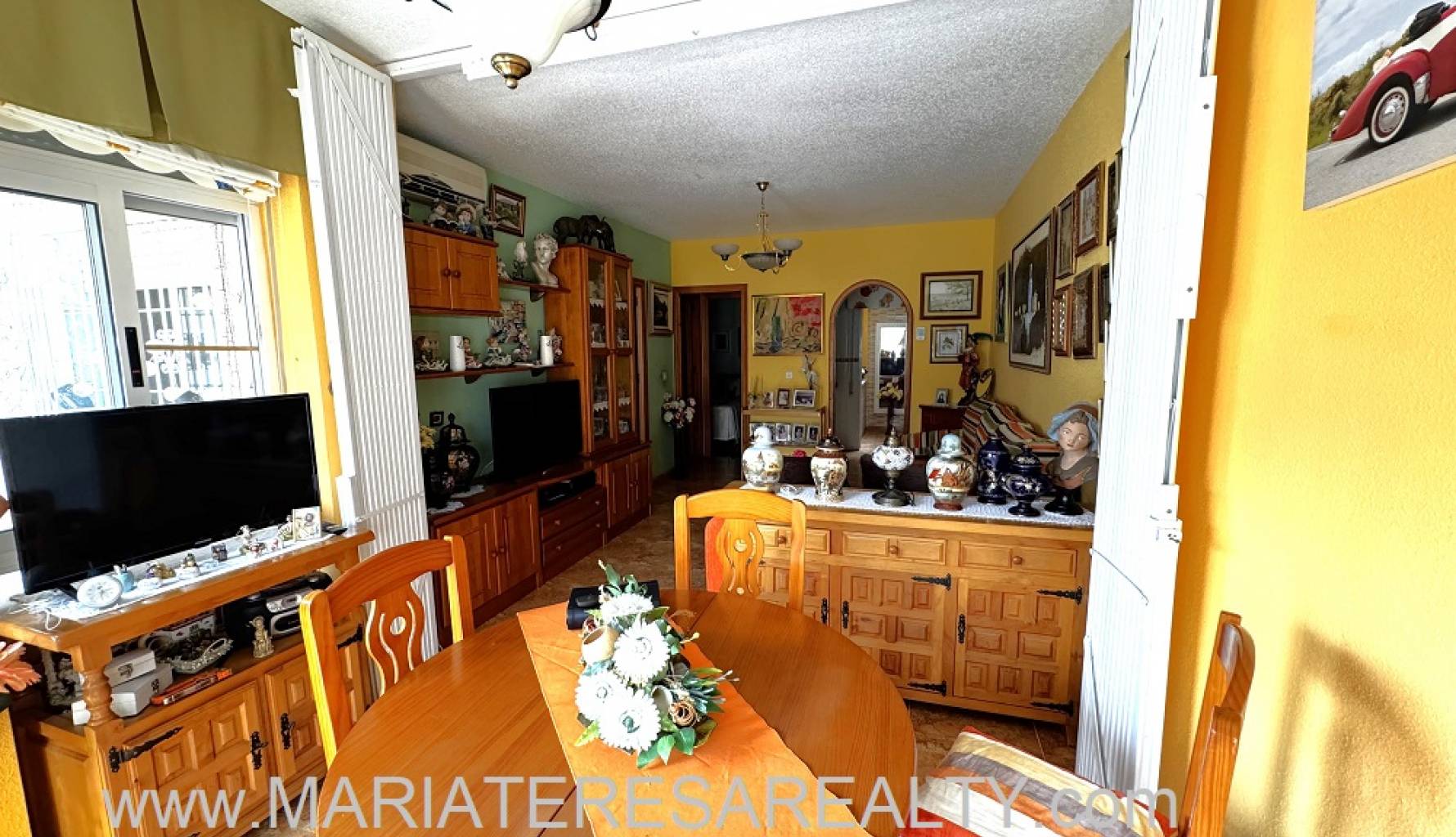 The porch has been added to the living/dining area, providing plenty of light and making it more spacious. There is a master bedroom with a walk-in closet and another double bedroom with a walk-in closet, a recently renovated bathroom with a shower, a modern kitchen, and a patio converted into a laundry room with a retractable roof.
