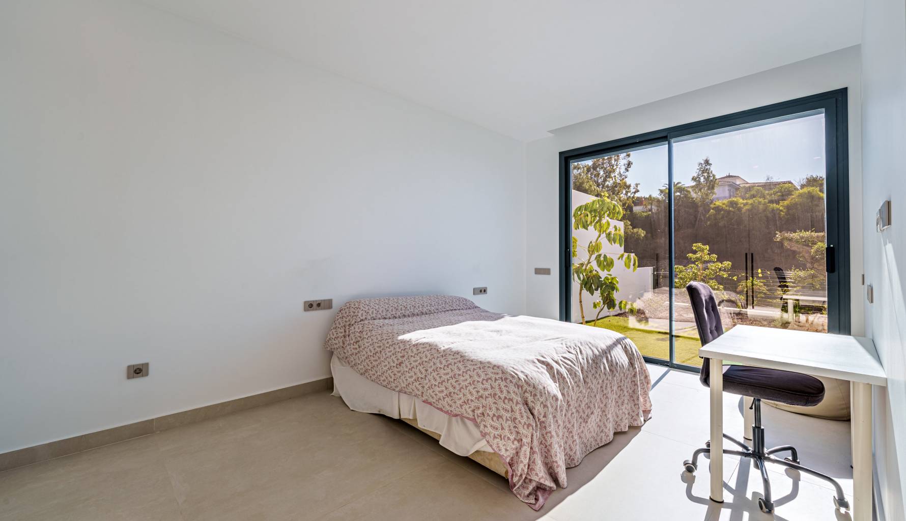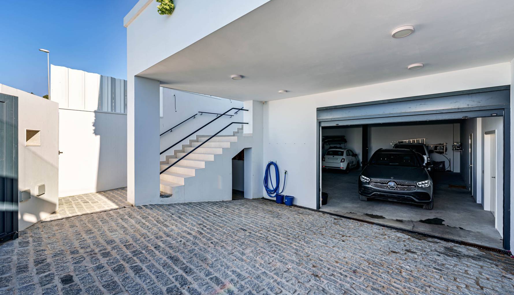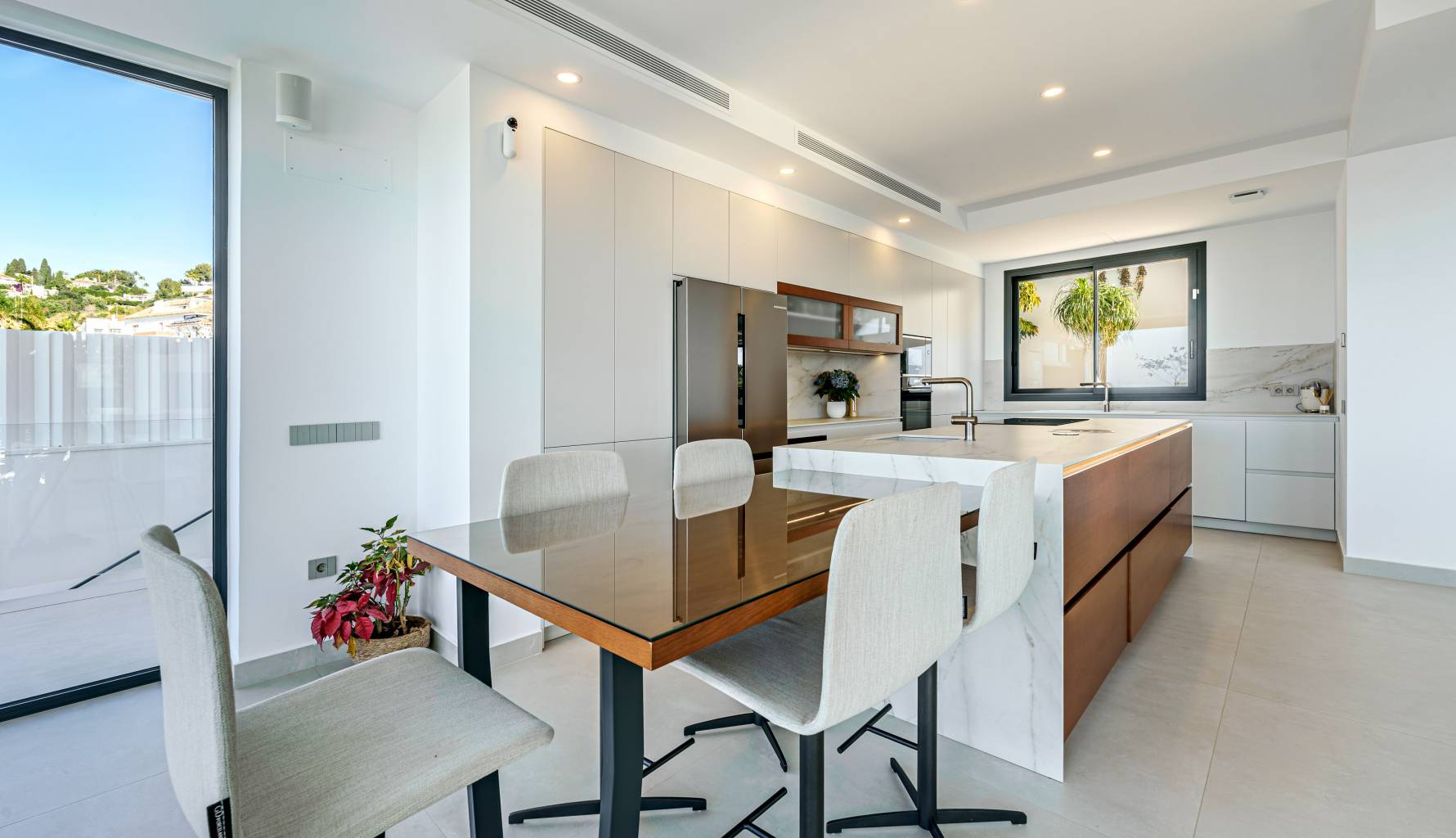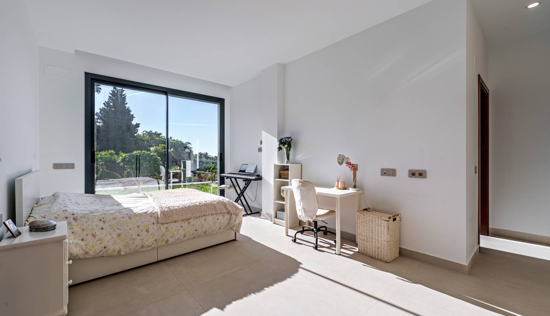 The villa's interior is designed with a focus on comfort and functionality. Porcelain tile floors add a touch of elegance and are easy to maintain. The villa is equipped with air conditioning, ensuring a pleasant environment year-round. Electric shutters add an extra level of comfort and security, while built-in wardrobes offer efficient and stylish storage. Additionally, underfloor heating provides uniform warmth throughout the home, ideal for the colder months. The villa is also future-ready with an electric car charging point, reflecting a commitment to sustainability and modernity.