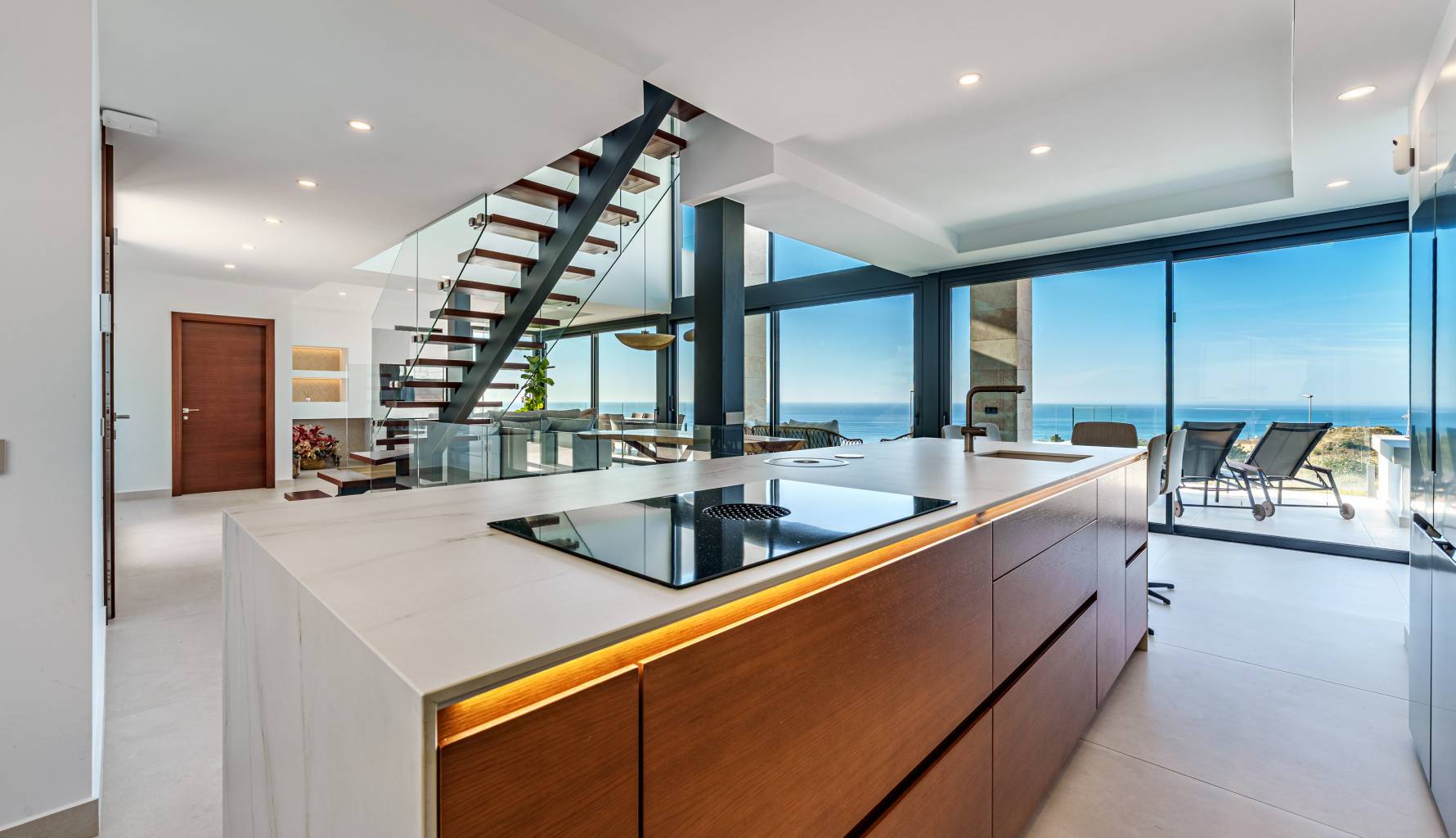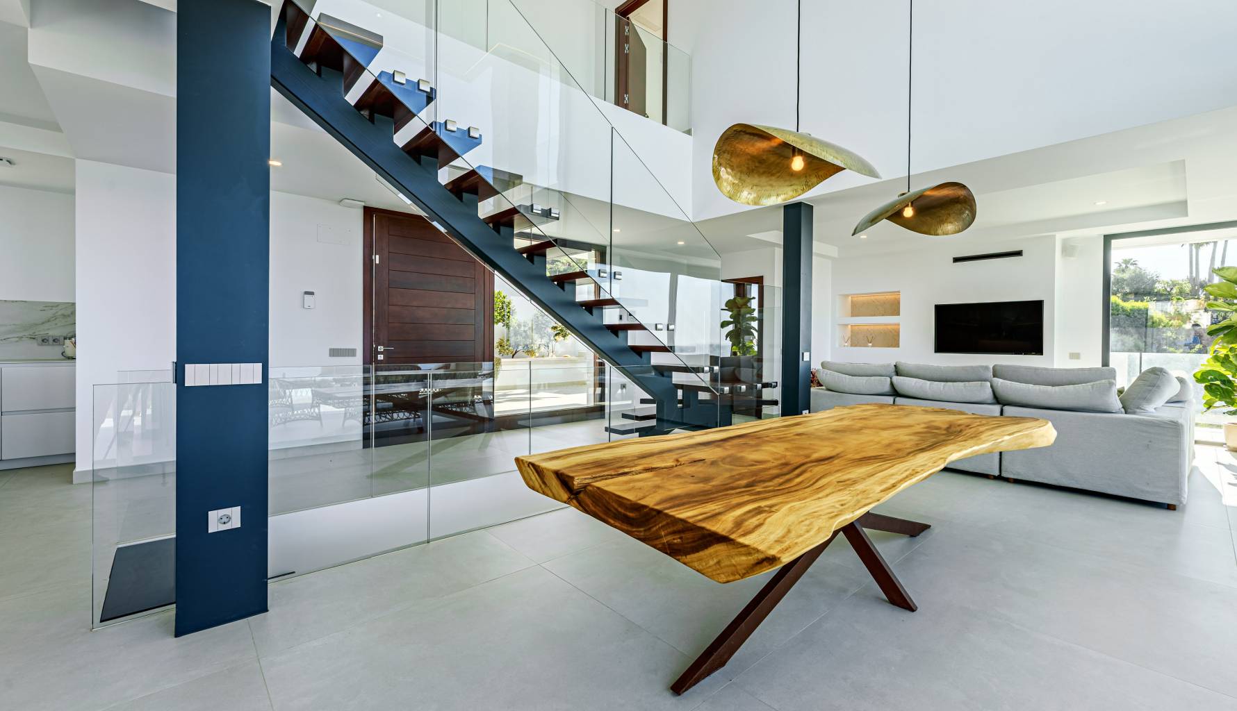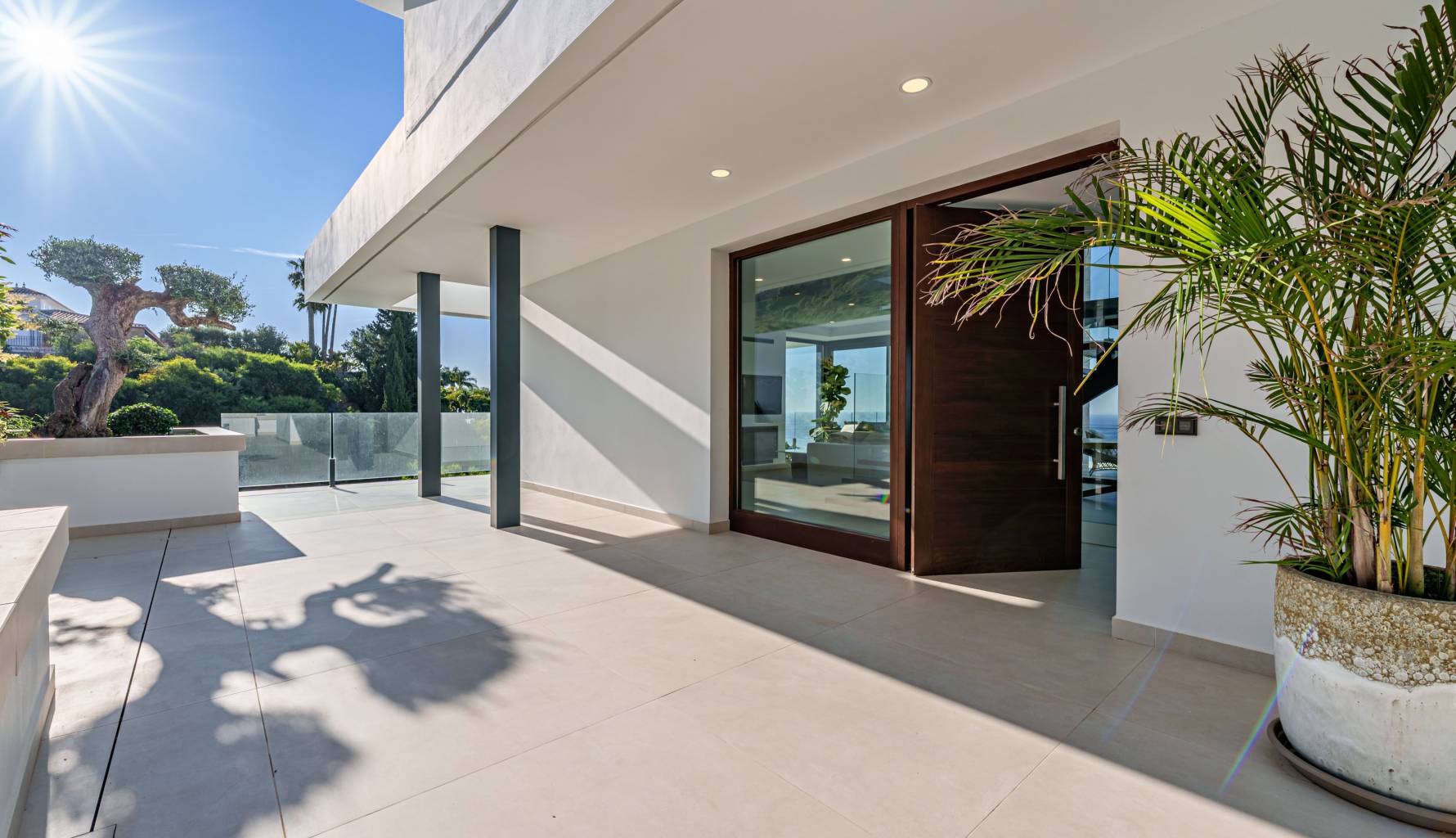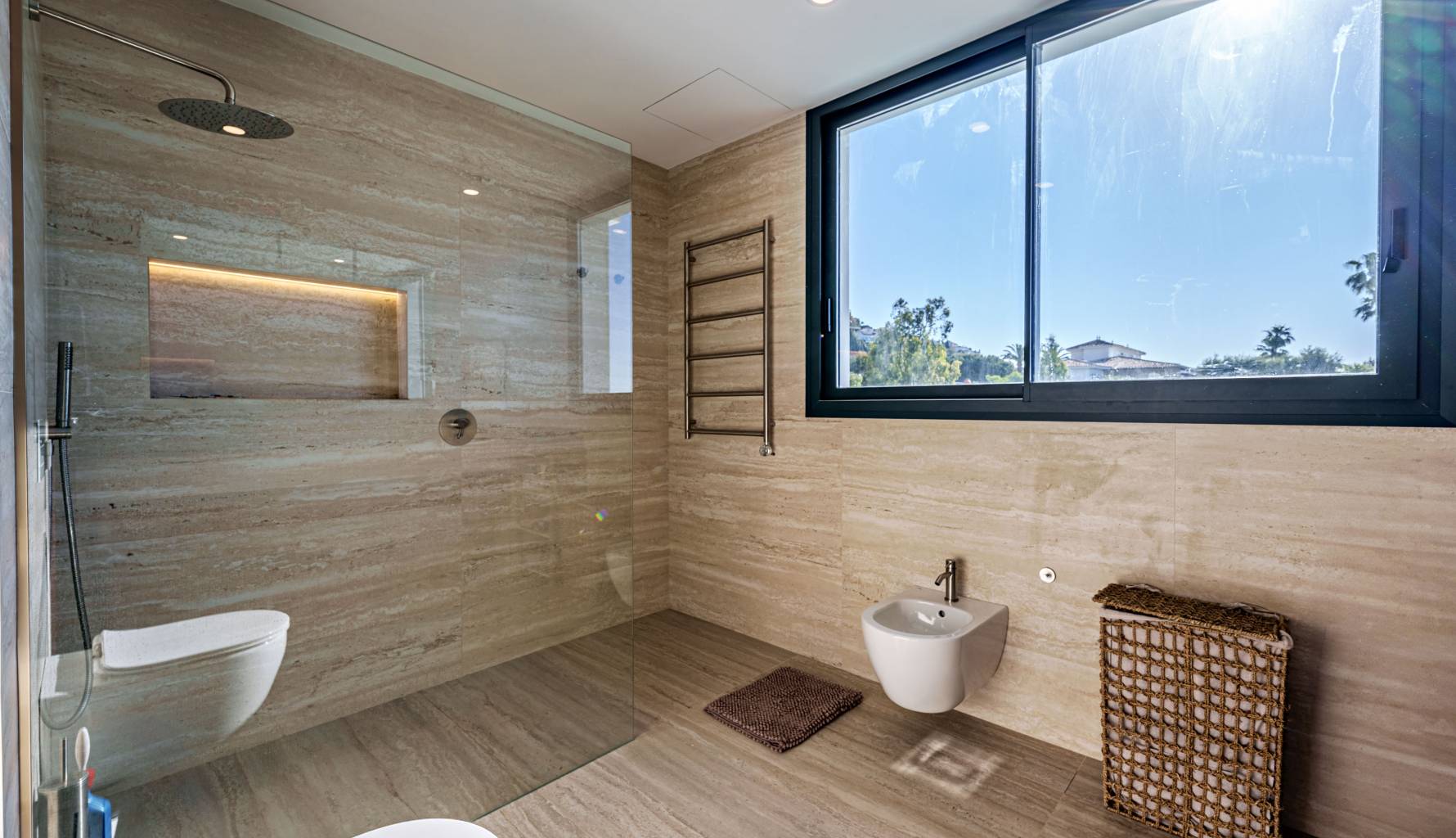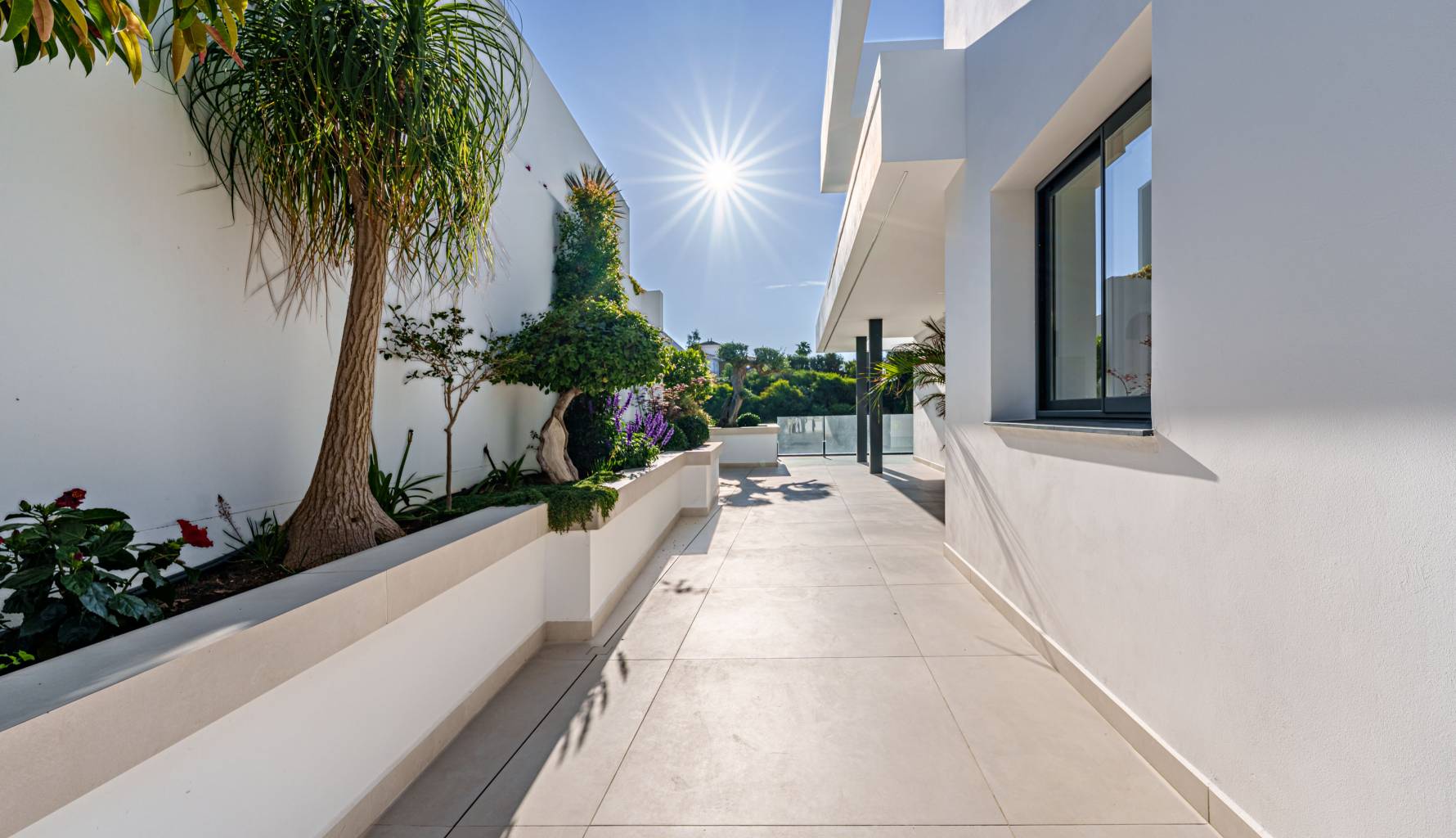 The villa's interior is designed with a focus on comfort and functionality. Porcelain tile floors add a touch of elegance and are easy to maintain. The villa is equipped with air conditioning, ensuring a pleasant environment year-round. Electric shutters add an extra level of comfort and security, while built-in wardrobes offer efficient and stylish storage. Additionally, underfloor heating provides uniform warmth throughout the home, ideal for the colder months. The villa is also future-ready with an electric car charging point, reflecting a commitment to sustainability and modernity.