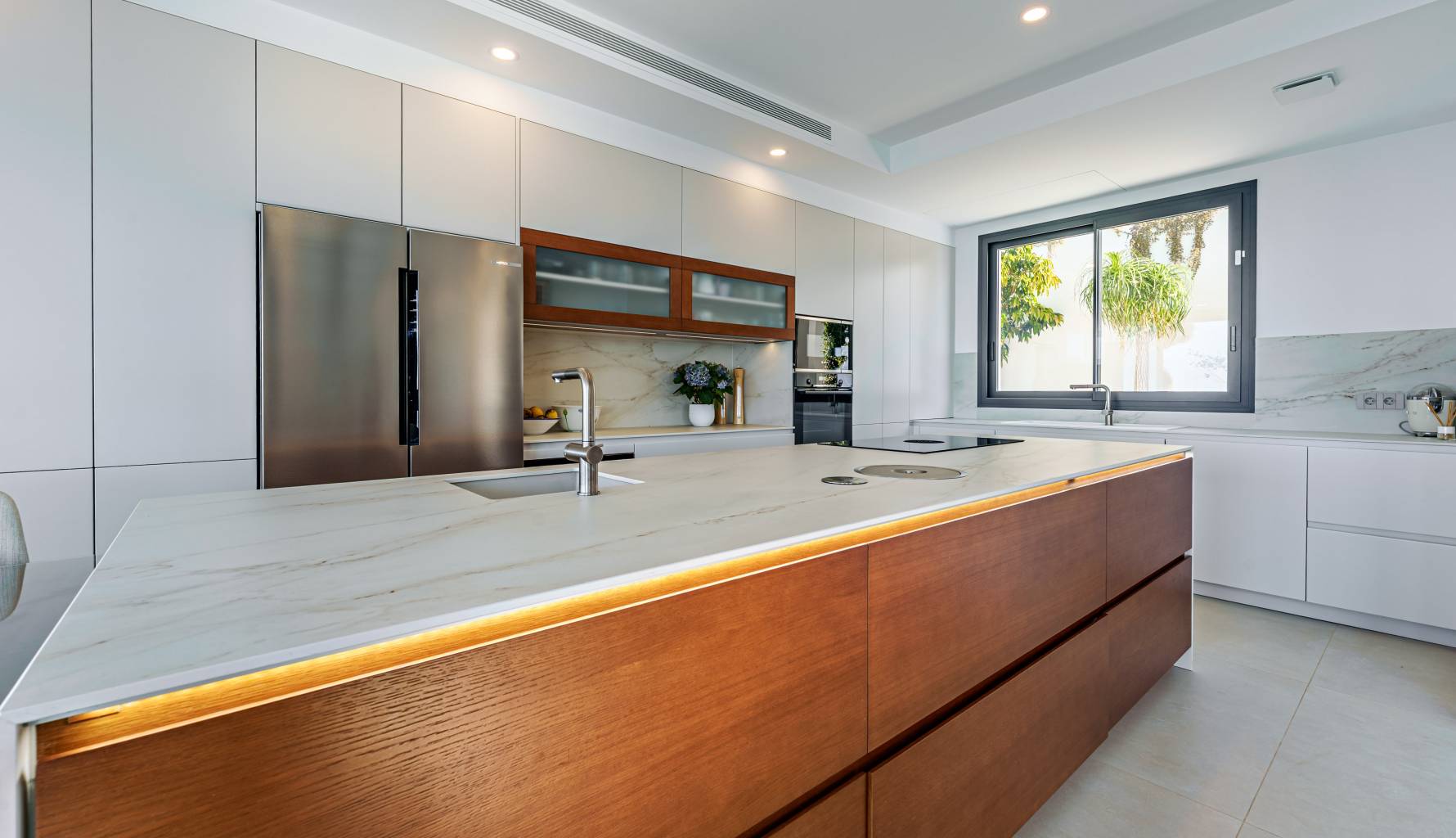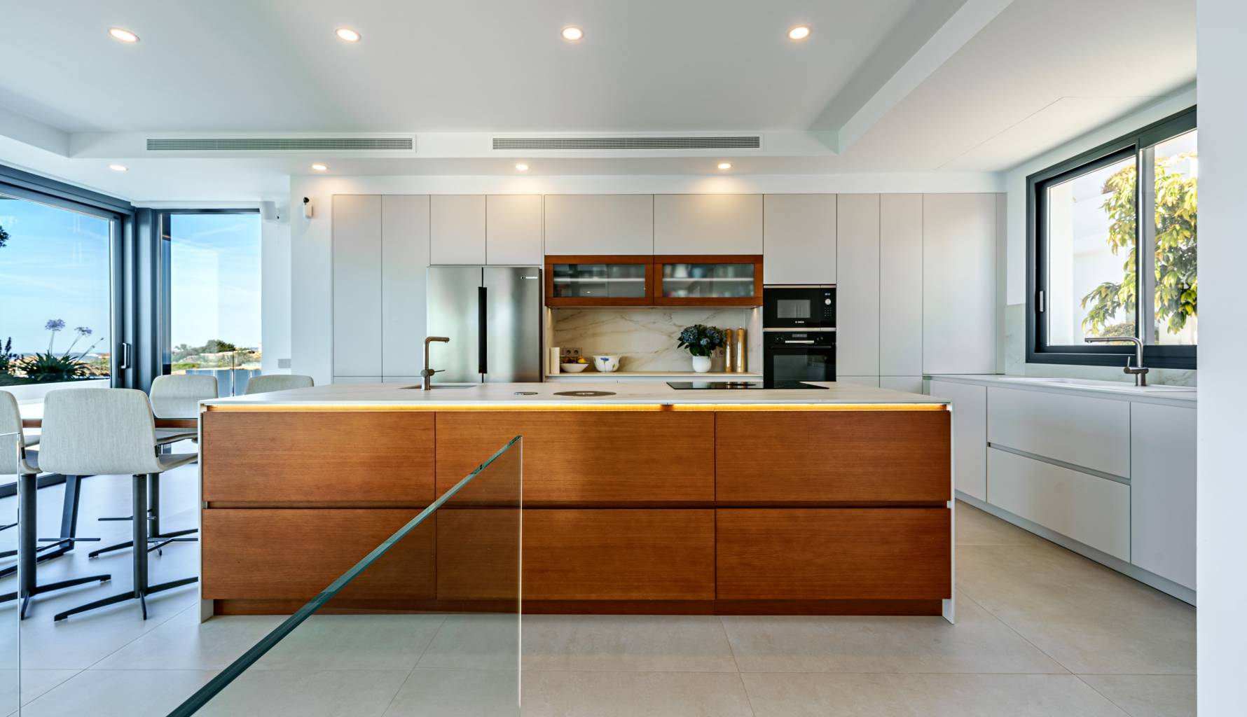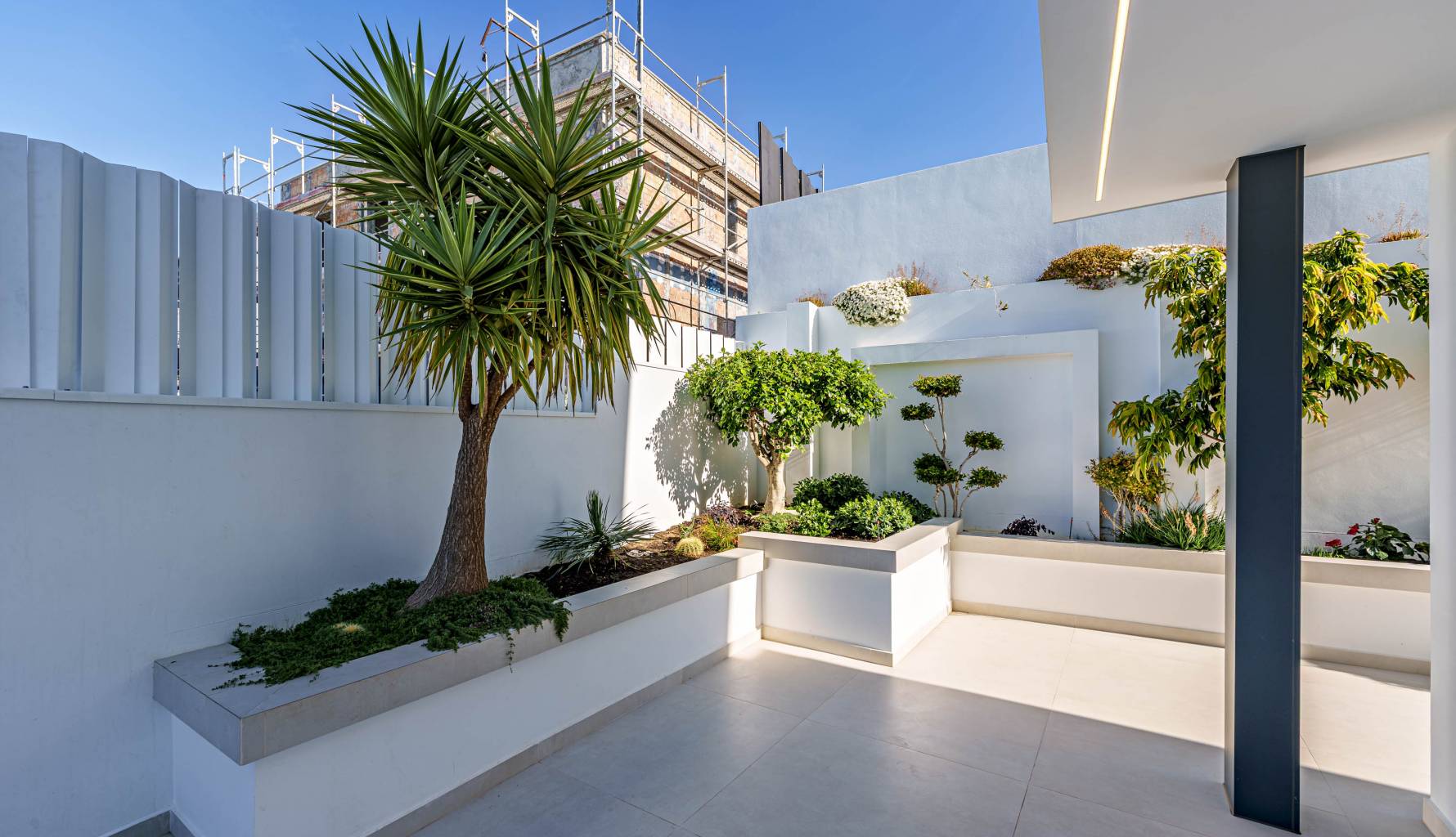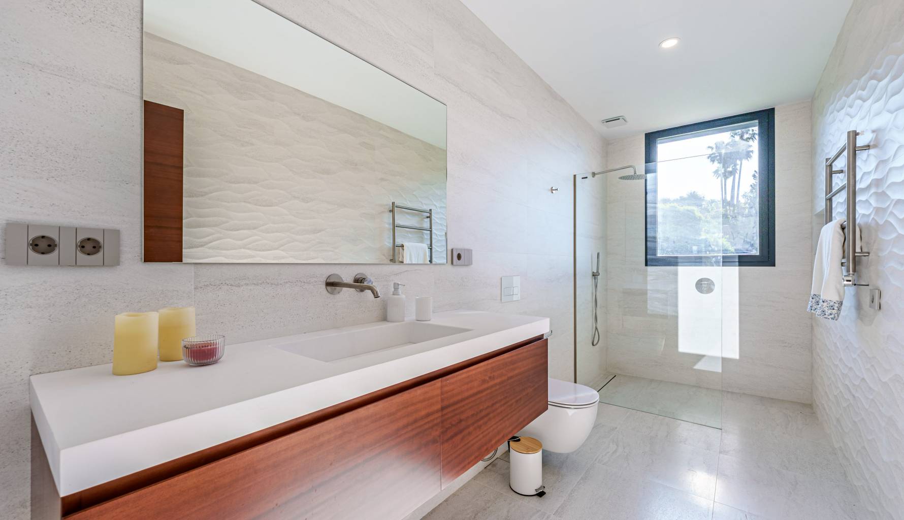 The villa's interior is designed with a focus on comfort and functionality. Porcelain tile floors add a touch of elegance and are easy to maintain. The villa is equipped with air conditioning, ensuring a pleasant environment year-round. Electric shutters add an extra level of comfort and security, while built-in wardrobes offer efficient and stylish storage. Additionally, underfloor heating provides uniform warmth throughout the home, ideal for the colder months. The villa is also future-ready with an electric car charging point, reflecting a commitment to sustainability and modernity.