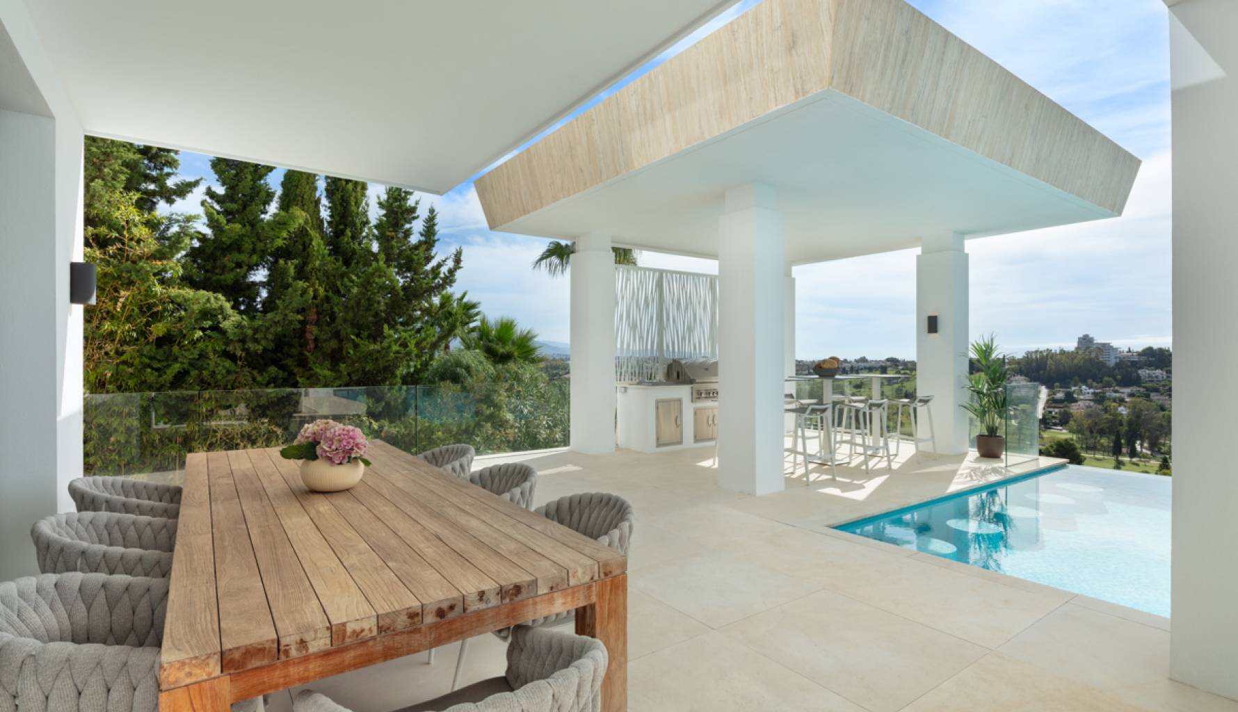 The exterior of the villa is carefully designed to offer a space for relaxation and entertainment. It features a private garden, perfect for enjoying the Mediterranean climate. The terrace and solarium provide additional areas for outdoor relaxation, while the pergola offers a shaded space ideal for sunny afternoons. The private pool is a true oasis, complemented by a jacuzzi that adds an extra touch of luxury.