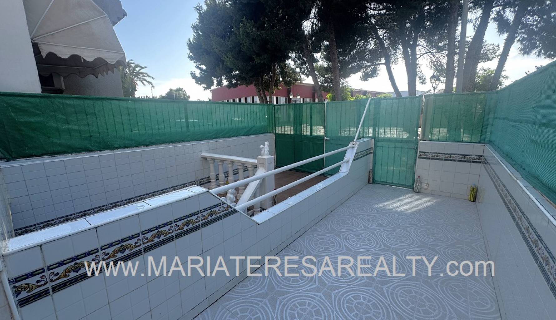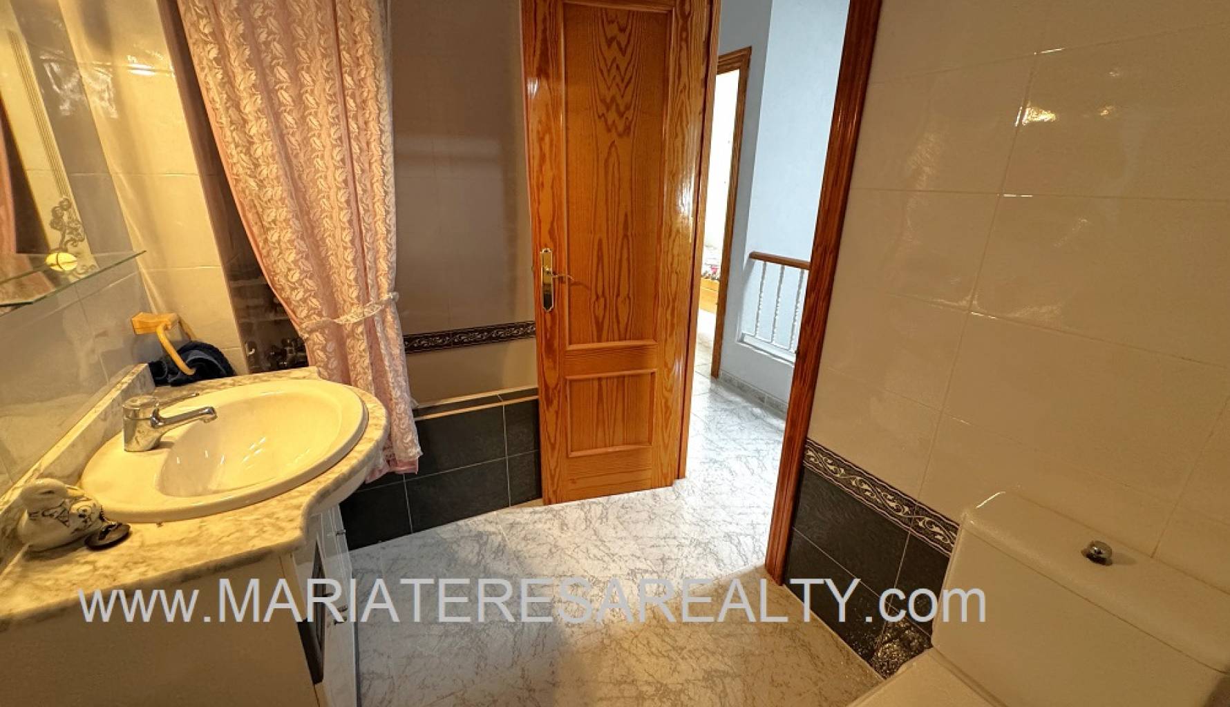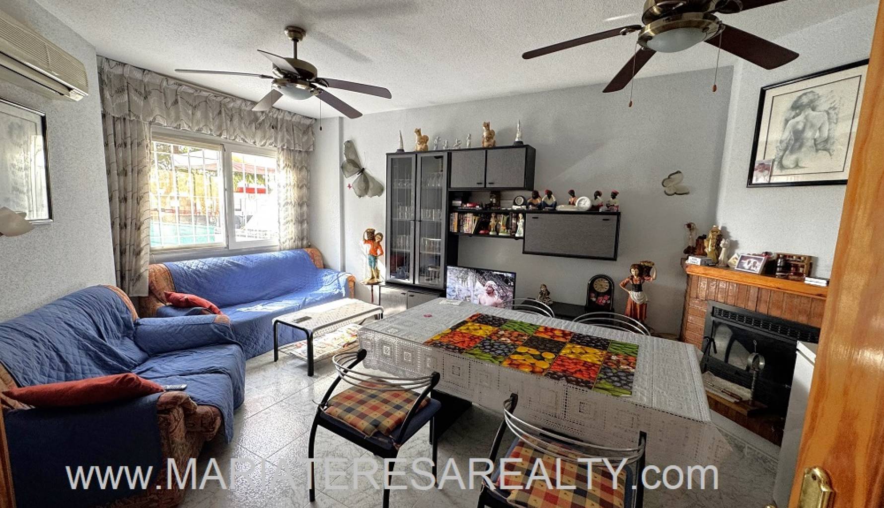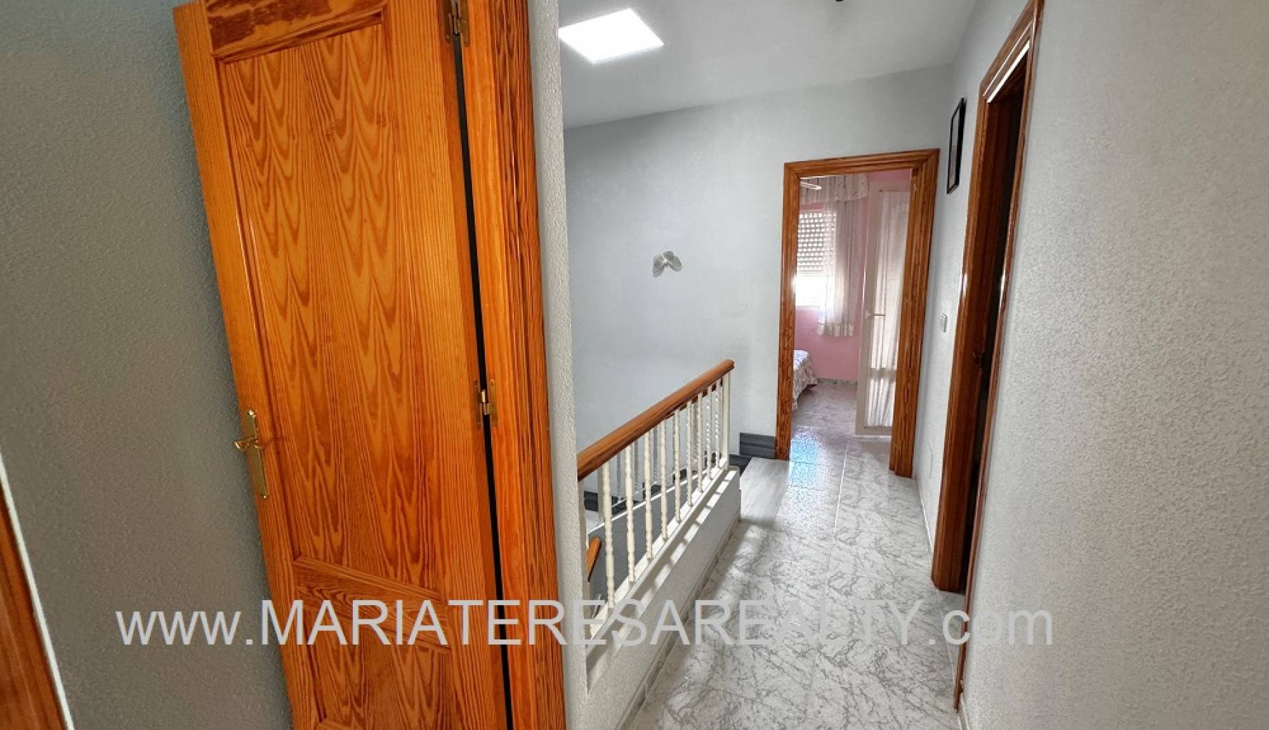 Beautiful 4-bedroom semi-detached house in very good condition, close to the municipal swimming pool and the library in Los Alcázares. The house has a large terrace with a porch with awnings. Upon entering, we find a hall that divides the rooms of the house. On the ground floor, we have a large independent living room equipped with air conditioning, a bedroom without a built-in wardrobe, a toilet, and a large, fully equipped kitchen that leads to a separate laundry area that in turn leads to a large backyard where we have a built-in outdoor shower. Going down the stairs, we find a large basement with an exterior entrance, completely separate from the main house, where we have a bathroom with a shower and two large bedrooms without built-in wardrobes. On the upper floor of this semi-detached house, we have a master bedroom with a built-in wardrobe and access to a balcony, a bedroom with air conditioning and without a built-in wardrobe that opens onto a covered terrace that in turn leads to a large terrace, a bathroom equipped with a bathtub, and a bedroom with a built-in wardrobe