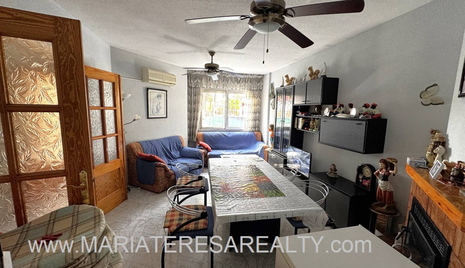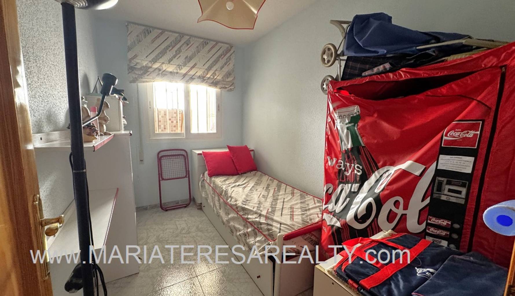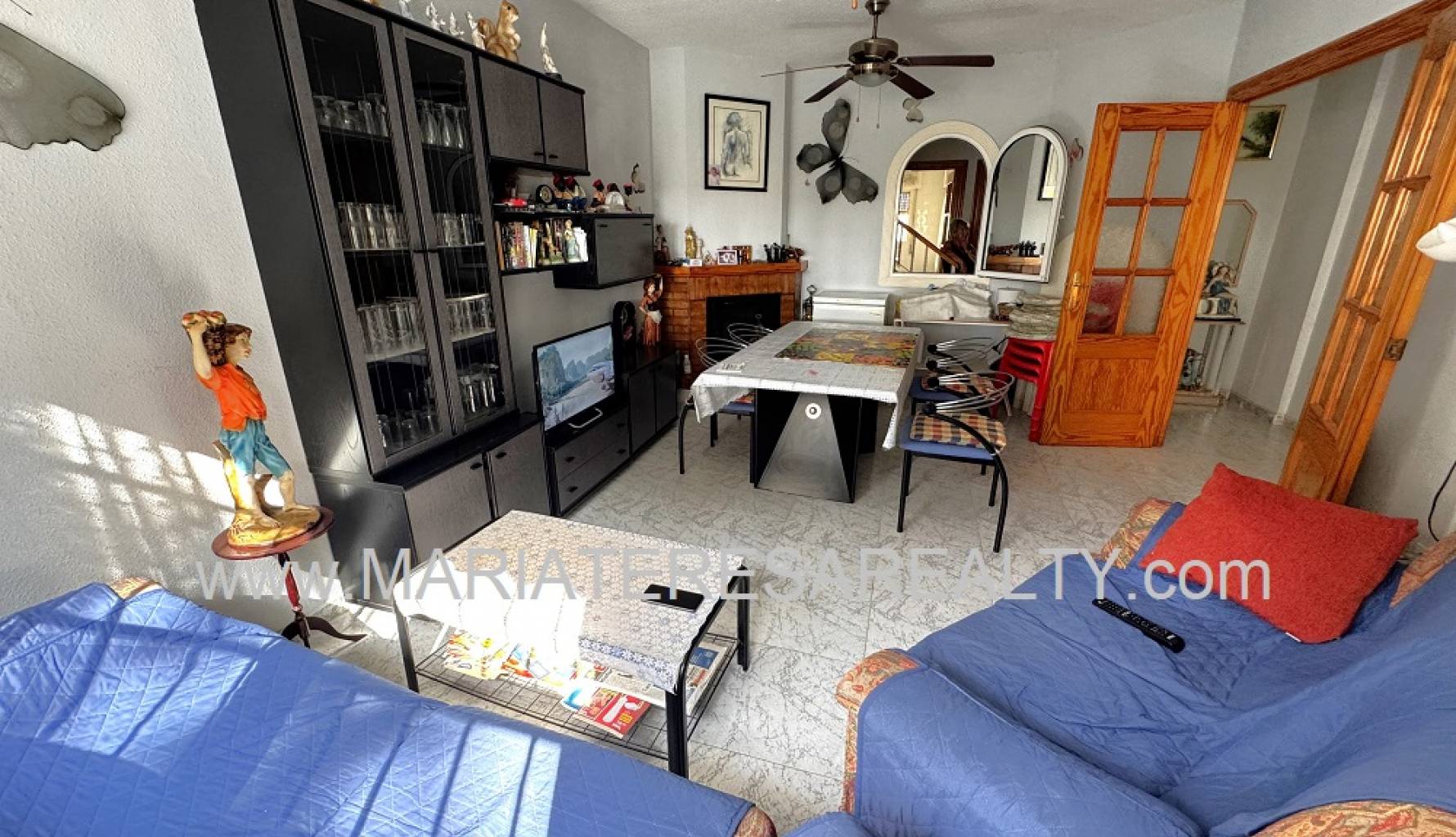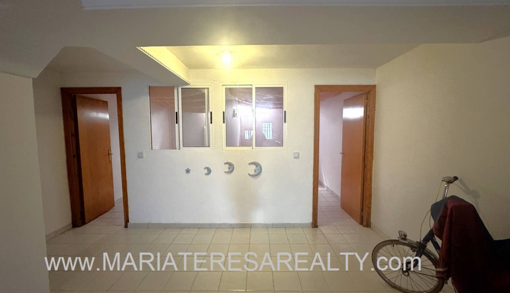 Beautiful 4-bedroom semi-detached house in very good condition, close to the municipal swimming pool and the library in Los Alcázares. The house has a large terrace with a porch with awnings. Upon entering, we find a hall that divides the rooms of the house. On the ground floor, we have a large independent living room equipped with air conditioning, a bedroom without a built-in wardrobe, a toilet, and a large, fully equipped kitchen that leads to a separate laundry area that in turn leads to a large backyard where we have a built-in outdoor shower. Going down the stairs, we find a large basement with an exterior entrance, completely separate from the main house, where we have a bathroom with a shower and two large bedrooms without built-in wardrobes. On the upper floor of this semi-detached house, we have a master bedroom with a built-in wardrobe and access to a balcony, a bedroom with air conditioning and without a built-in wardrobe that opens onto a covered terrace that in turn leads to a large terrace, a bathroom equipped with a bathtub, and a bedroom with a built-in wardrobe